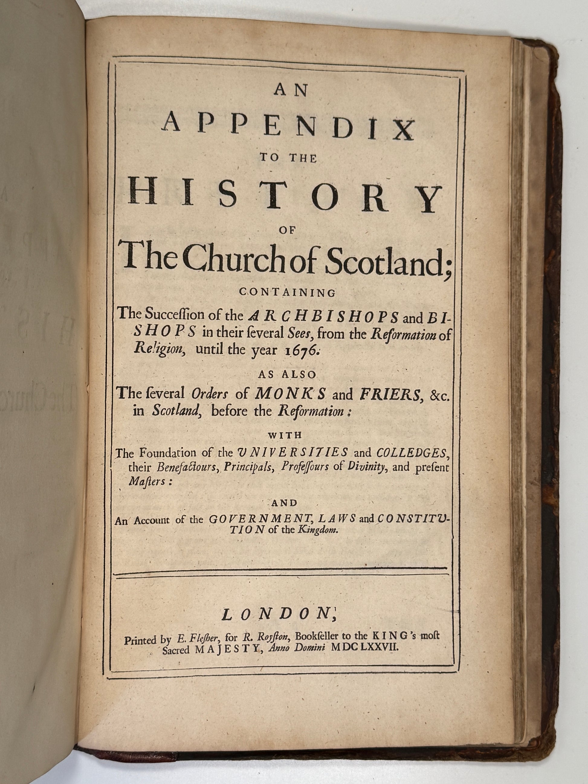 An Appendix to the History of the Church of Scotland; Containing the Succession of the Archbishops and Bishops in Their Several Sees, from the Reformation of Religion, Until the Year 1676. As Also the Several Orders of Monks and Friers, &c. in Scotland, Before the Reformation: with the Foundation of the Universities and Colledges, Their Benefactours, Principals, Professours of Divinity, and Present Masters: and an Account of the Government, Laws and Constitution of the Kingdom. London: by E. Flesher for R. Royston, MDCLXXVII (1677).