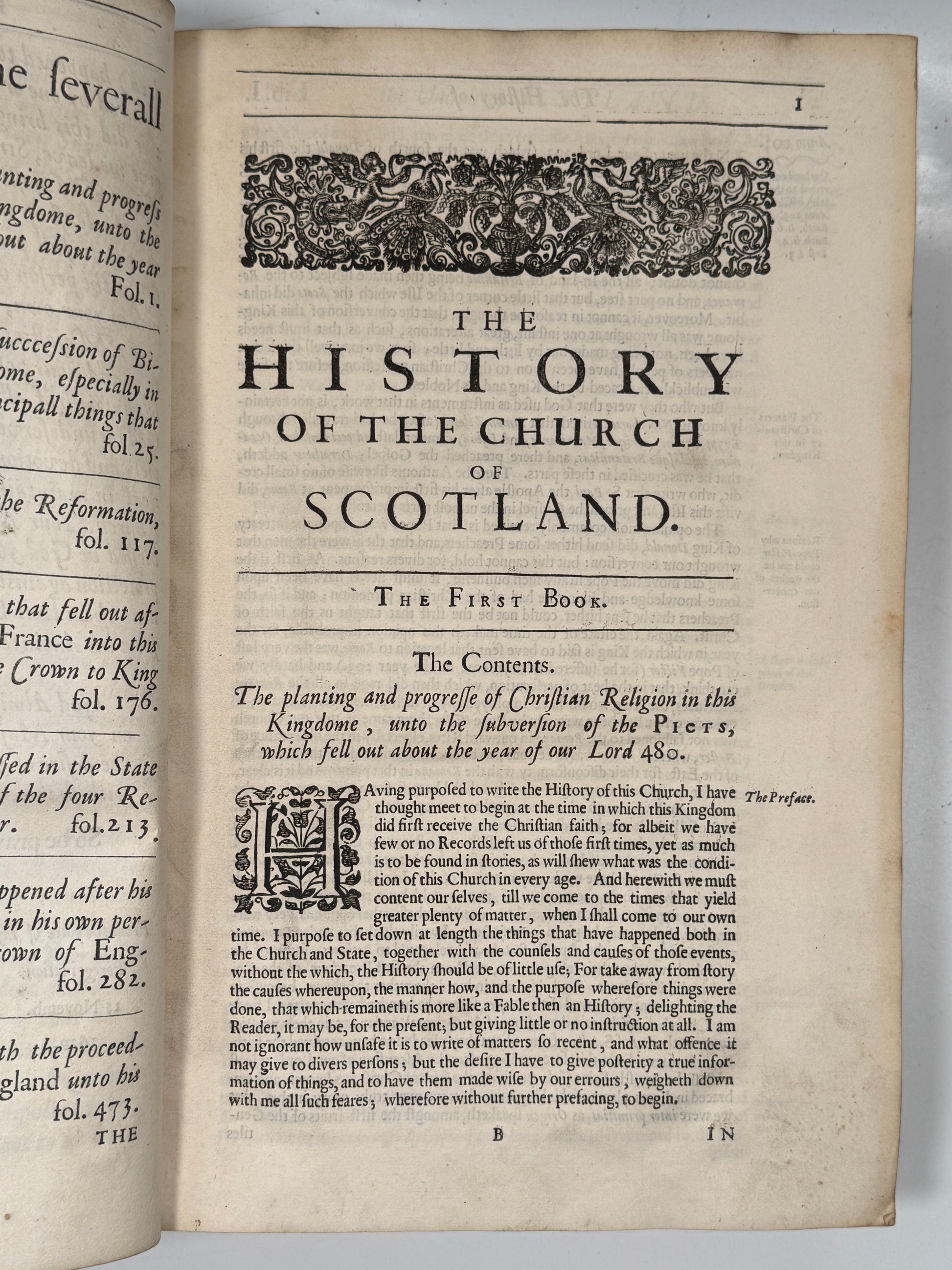 FIRST EDITION, published sixteen years posthumously, of this notably comprehensive historical survey of the Church of Scotland written by the then Lord Archbishop of St Andrews and Privy Counsellor to King Charles I, this being printed in 1655 during one of the most turbulent times in British history following the execution of Charles I and during the Interregnum rule of Oliver Cromwell, just five years before the Restoration.
