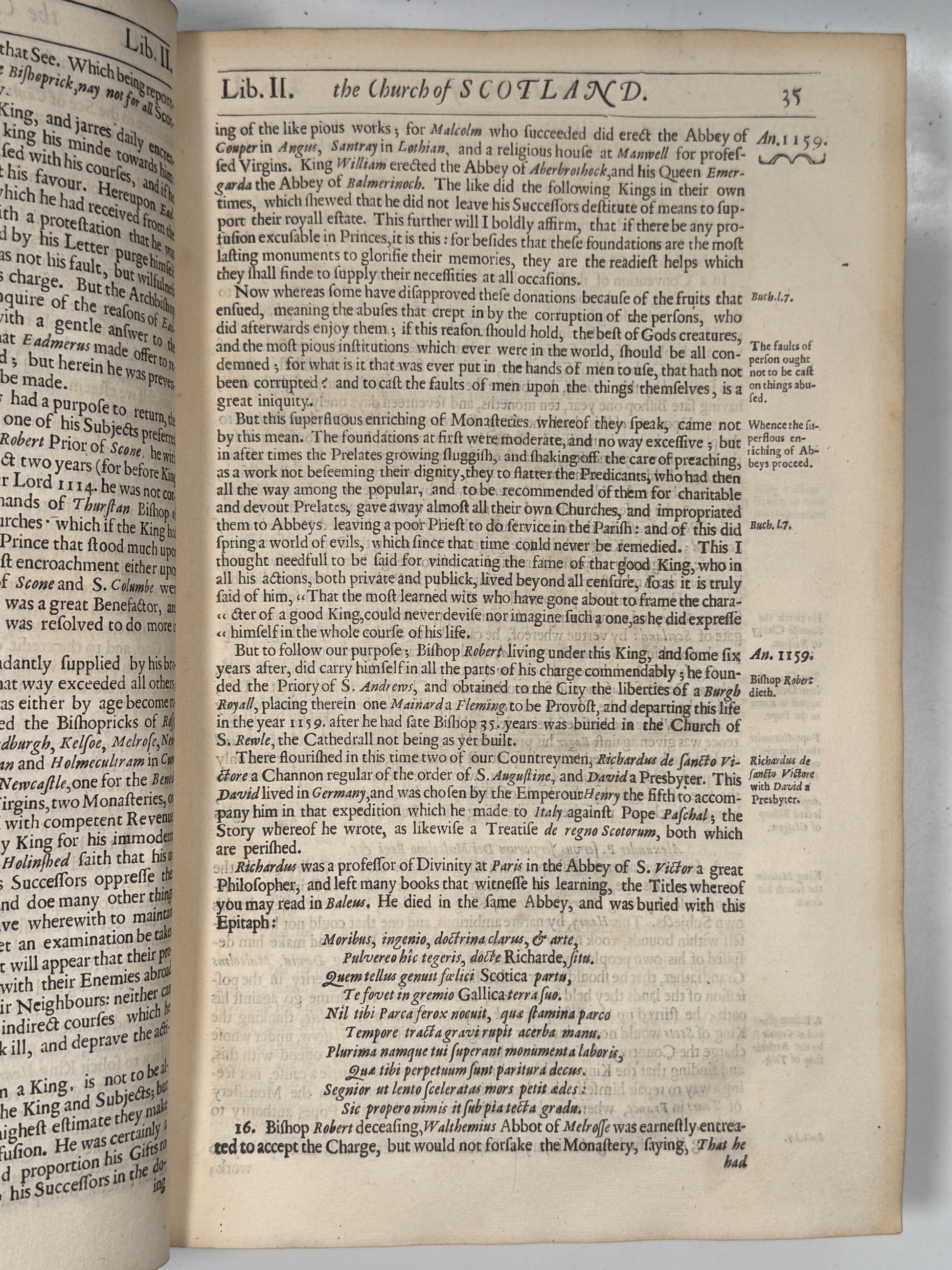 The History of the Church of Scotland, Beginning the Year of our Lord 203, and continued to the end of the Reign of King James the VI. of ever blessed Memory. Wherein are described, The Progress of Christianity; The Persecutions and Interruptions of it; The Foundation of Churches; The Erecting of Bishopricks; The Building and Endowing Monasteries, and other Religious Places; The Succession of Bishops in their Sees; The Reformation of Religion, and the frequent Disturbances of that Nation, by Wars, Conspiracies, Tumults, Schisms. Together with great variety of other Matters, both Ecclesiastical and Politicall. By John Spotswood. London: J. Flesher for R. Royston, 1655, folio.