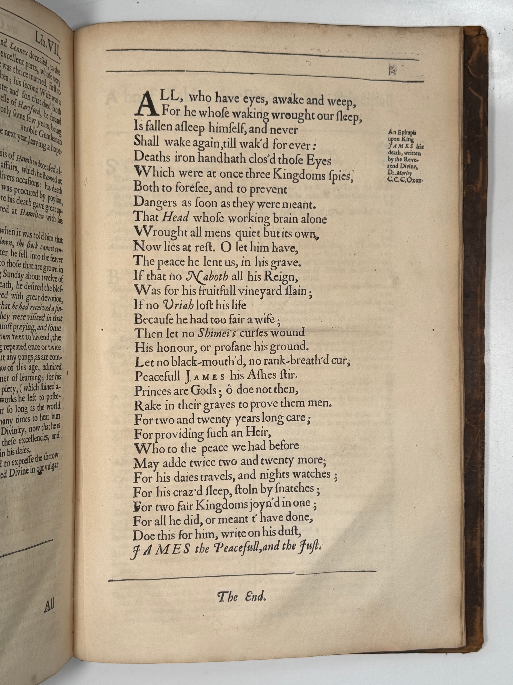 Contemporary full calf binding, leather a little rubbed, but generally attractive, joints cracked with front board detached. Original tooled red morocco label extant. Late 15th to early 16th century vellum MS binder’s waste visible at each end with extensively written neat writing. 3B4 is a blank and is extant here. Text collates as complete including the fine frontispiece and attractive dedication with the engraved portrait of Charles I. Exceptionally bright and clean throughout the text block. No attached bookplates. Save for the detached front board, an exceptional copy.