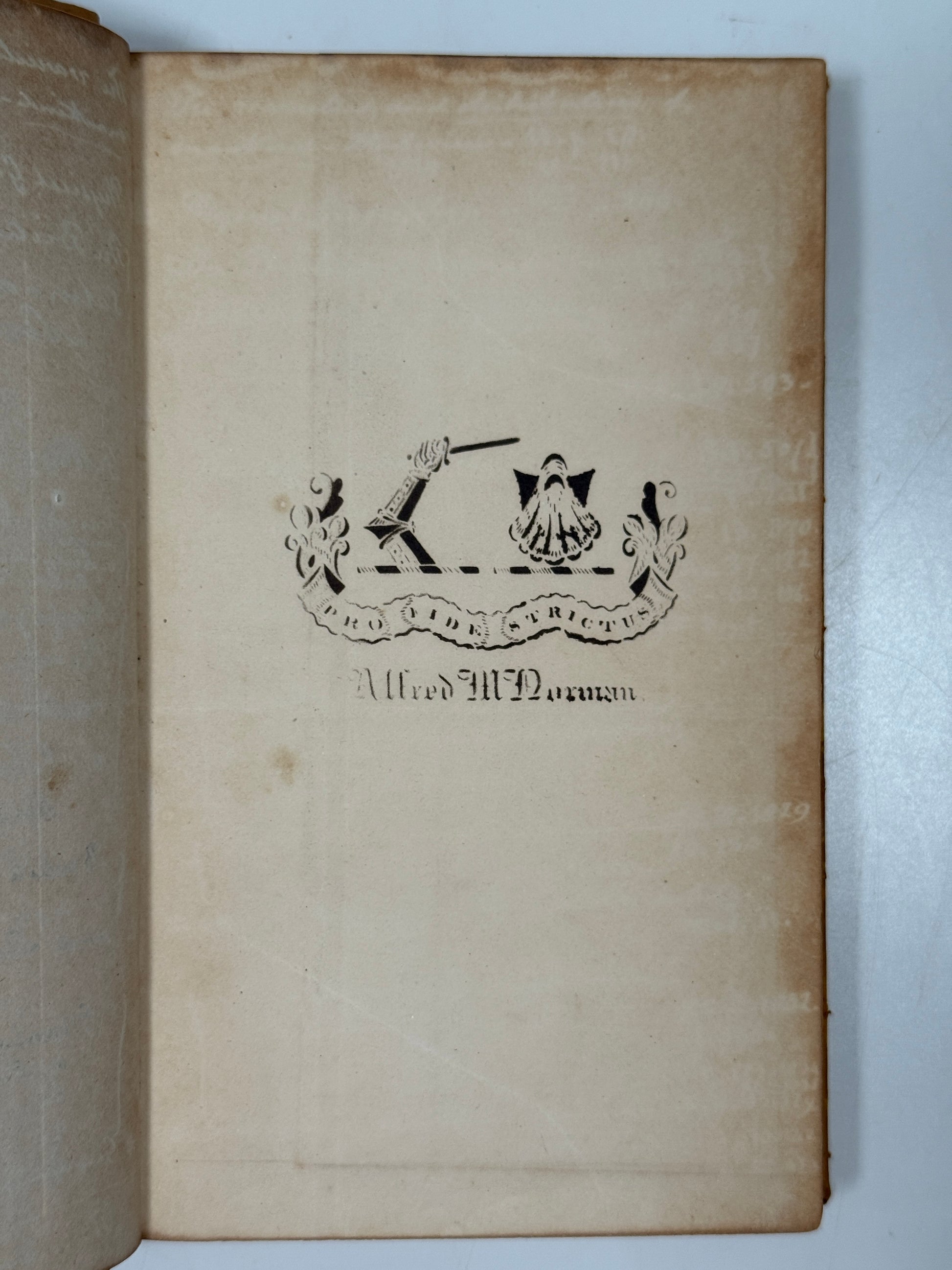 Full brown calf binding with a red tooled label in a compartment to the spine between raised bands. Binding lightly rubbed and scuffed. Both boards securely attached, reinforced from the rebinding. Shelf and edge wear. Page edges dulled. Binder's sticker to front pastedown. Ink inscriptions and ownership stamp to front blanks. Text block fairly clean with light toning, very sporadic foxing, and some ink marginalia. Uncollated.