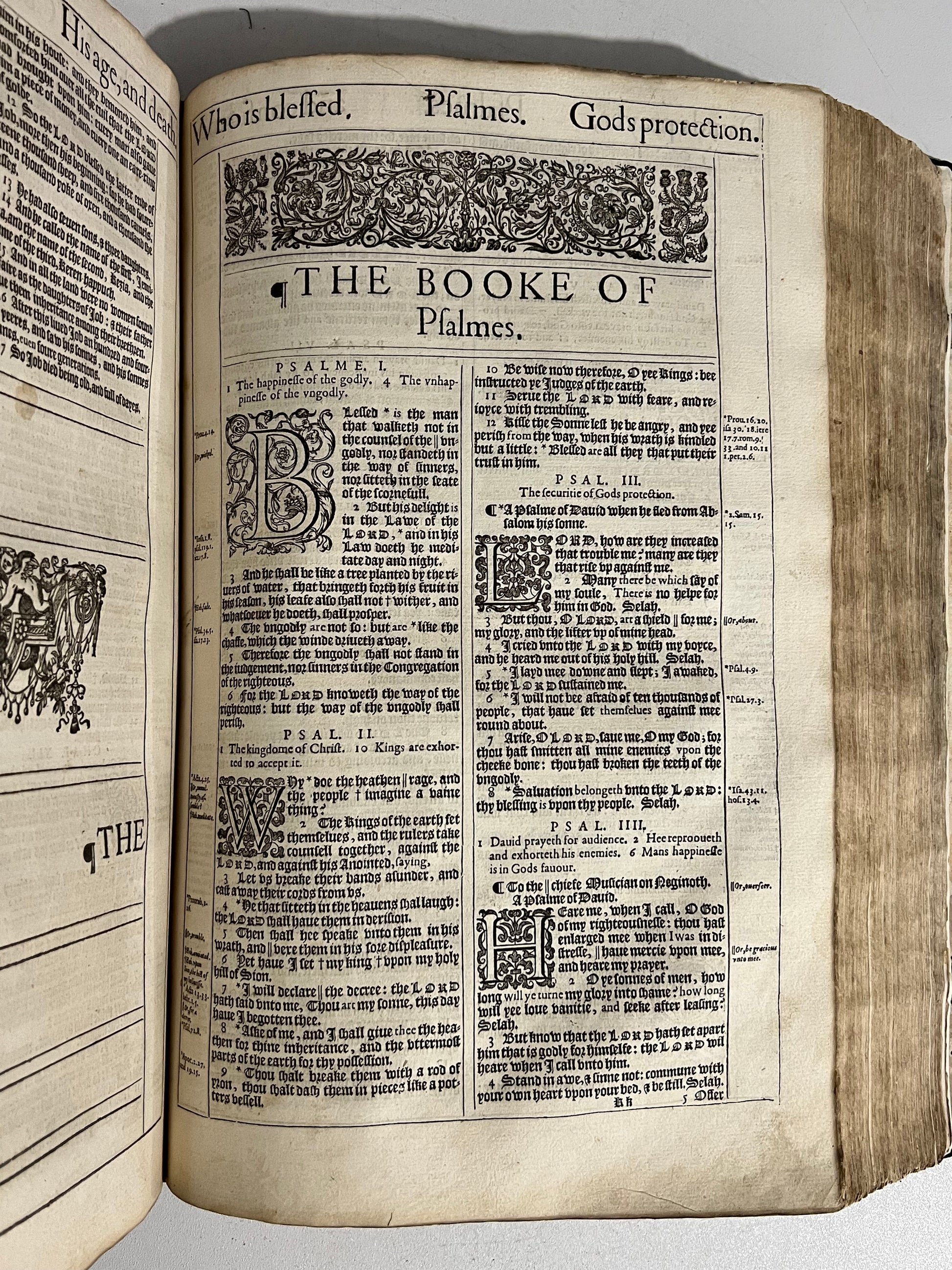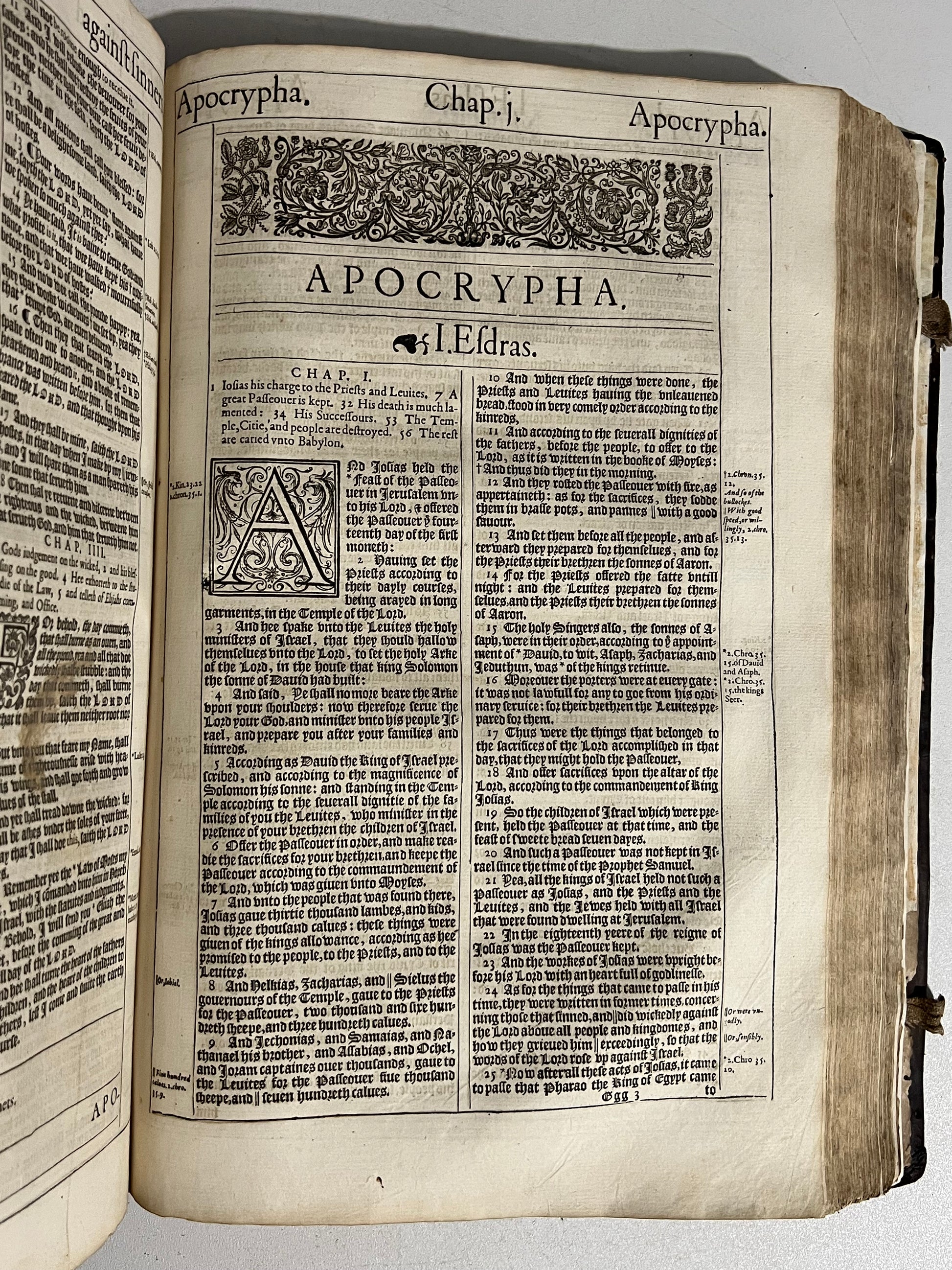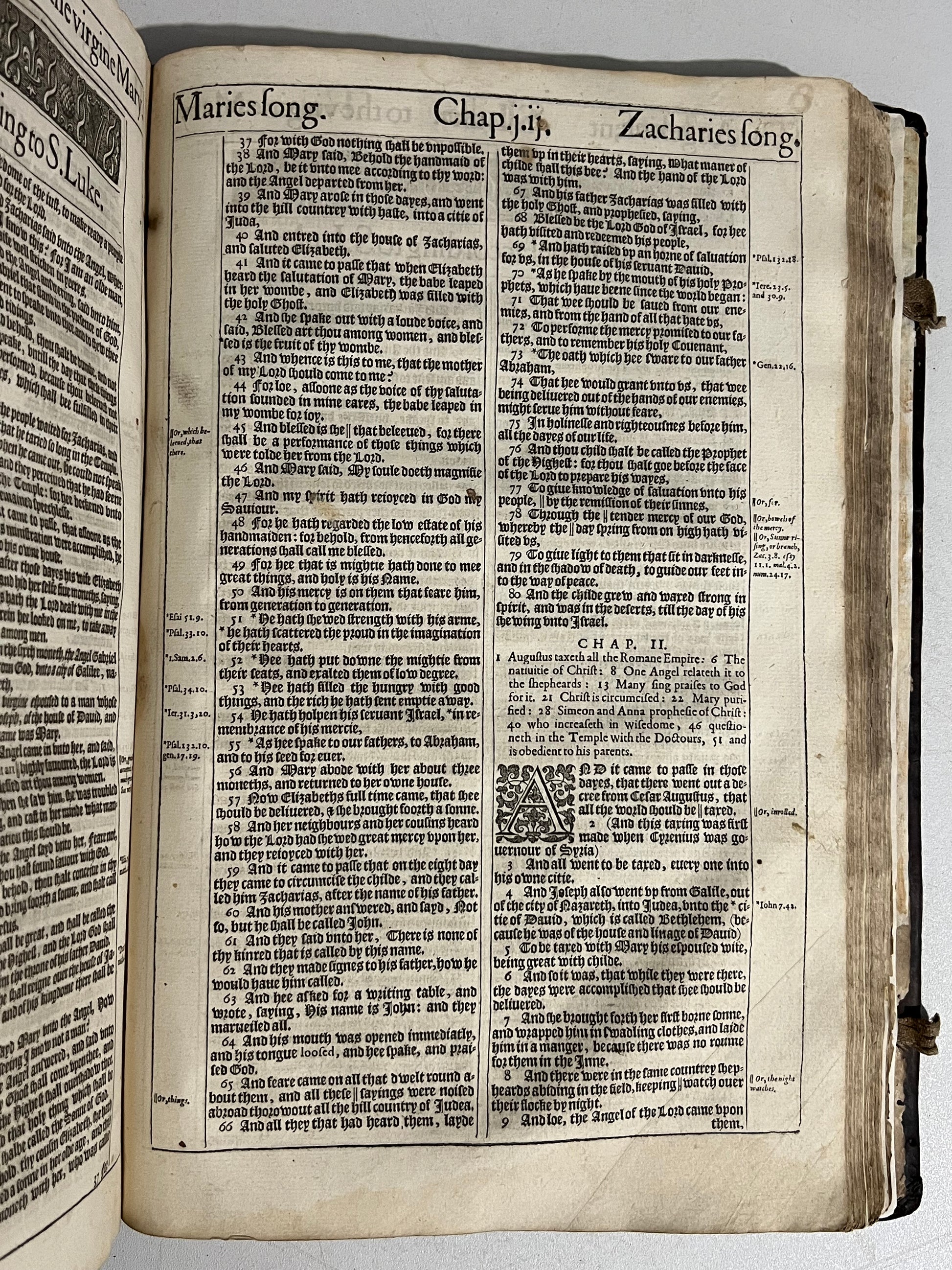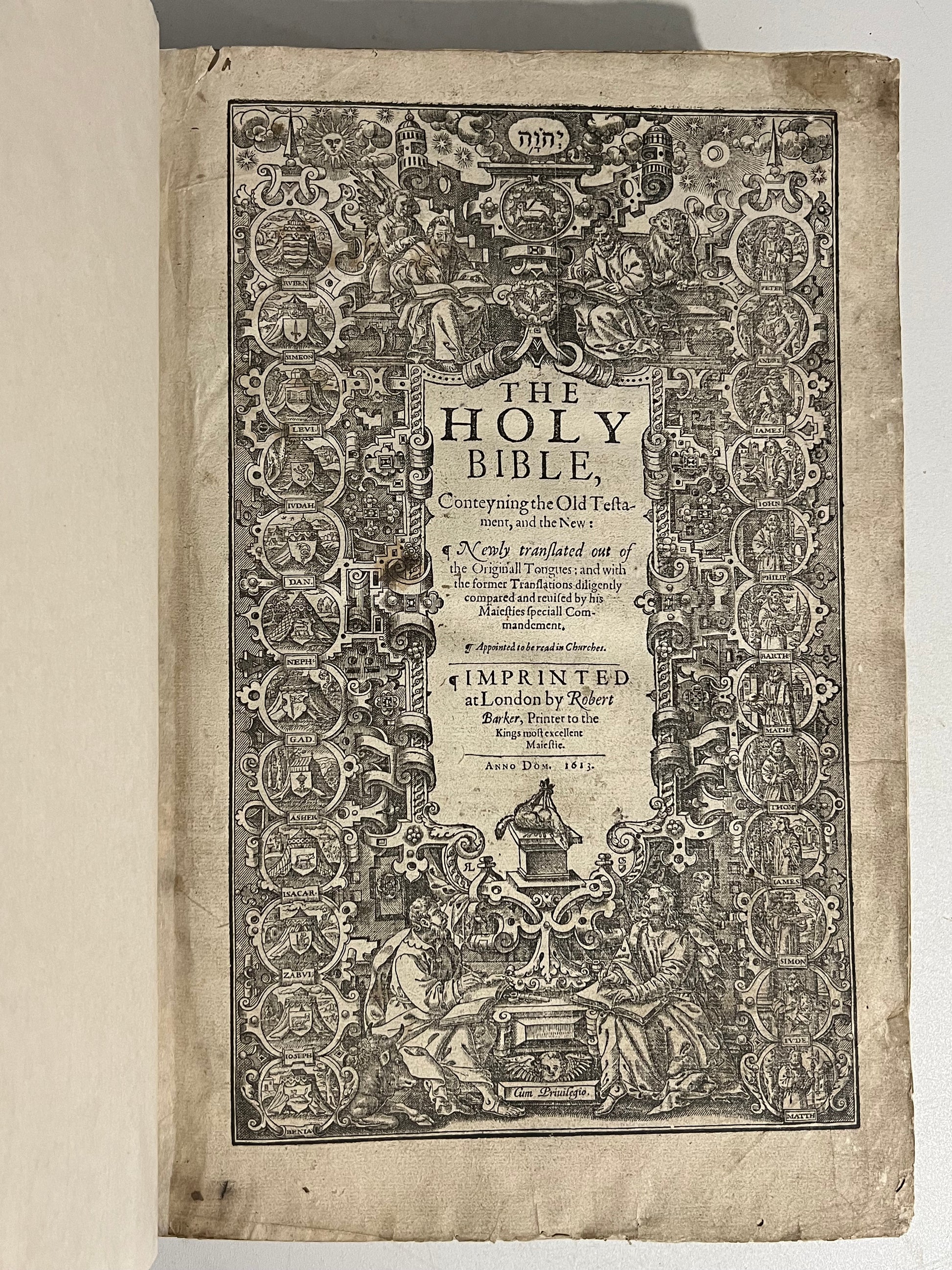 "Appointed to be read in Churches", the original King James Bible was printed for use in the pulpit and therefore exposed to continual public use on lecterns, often for centuries. Subsequently, practically all surviving copies are significantly damaged, usually lacking a large number of pages, and are almost always lacking one or, more commonly, both title pages. This example is one of the most remarkable surviving copies to surface and has clearly been incredibly well looked after through its over 400 year lifetime.