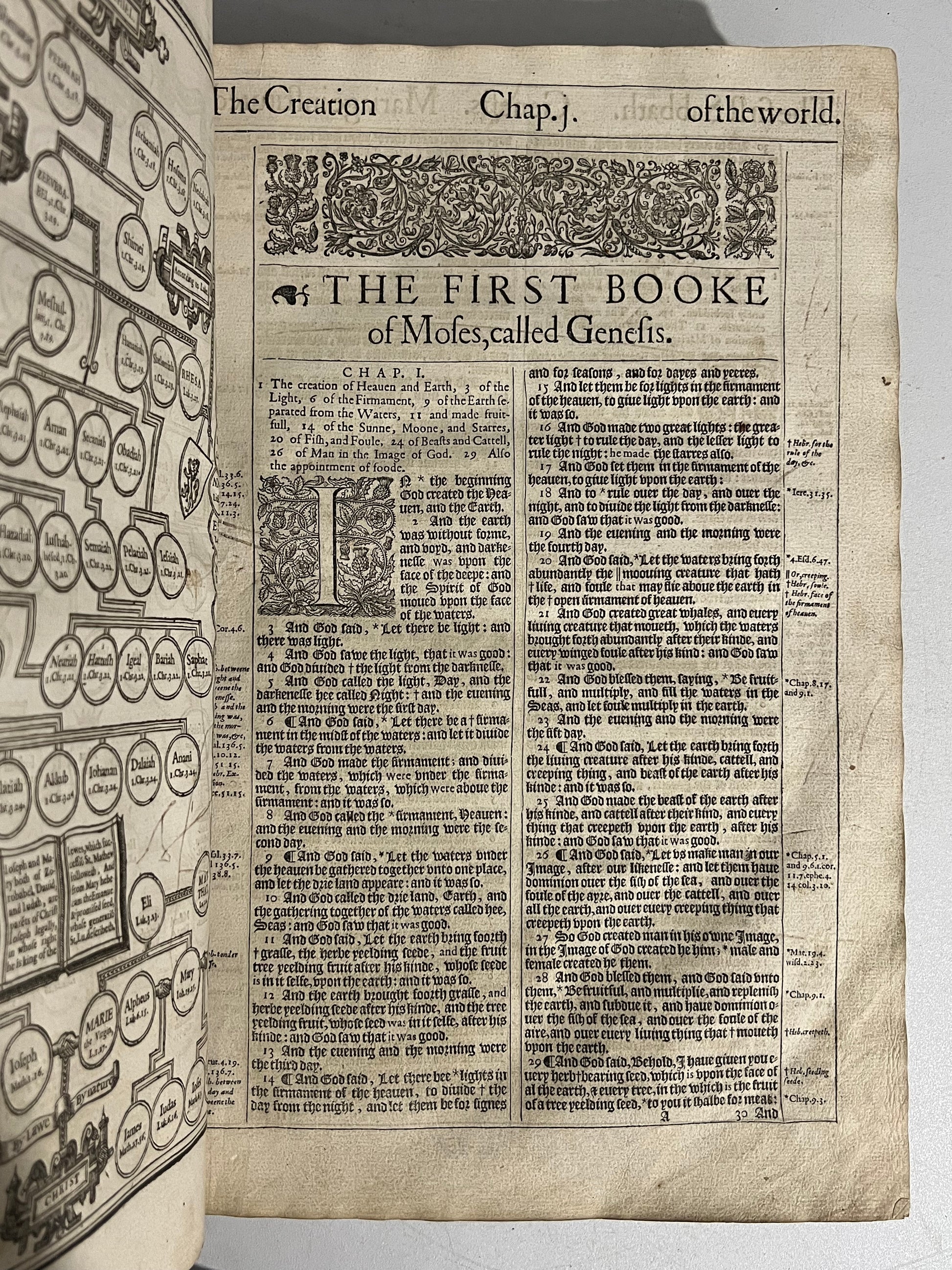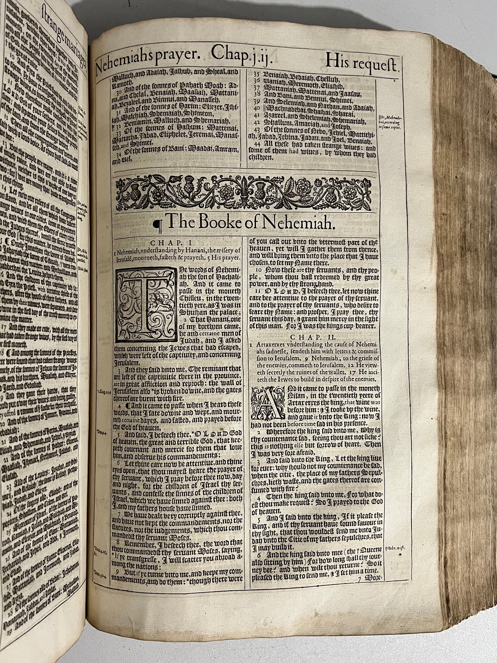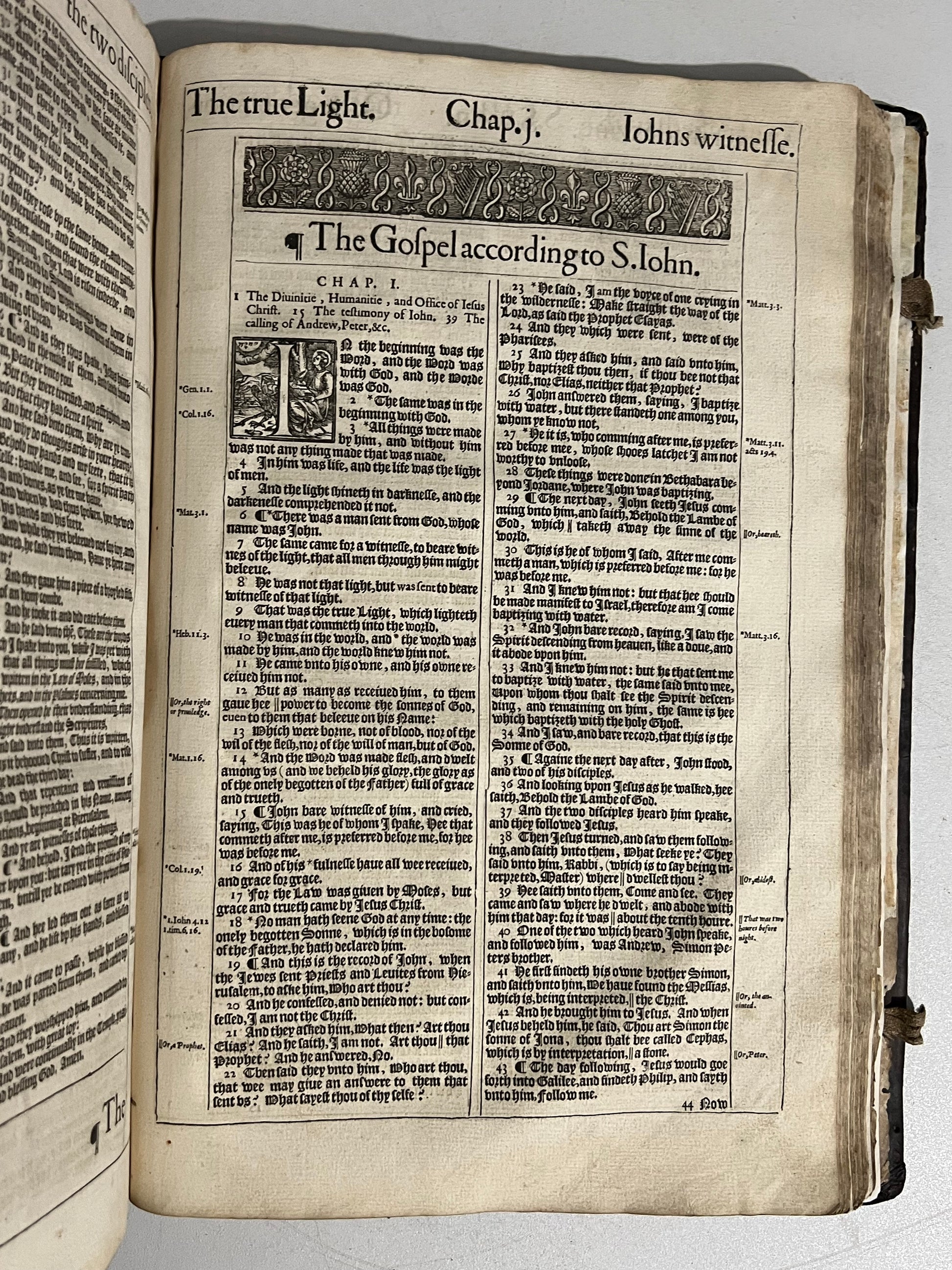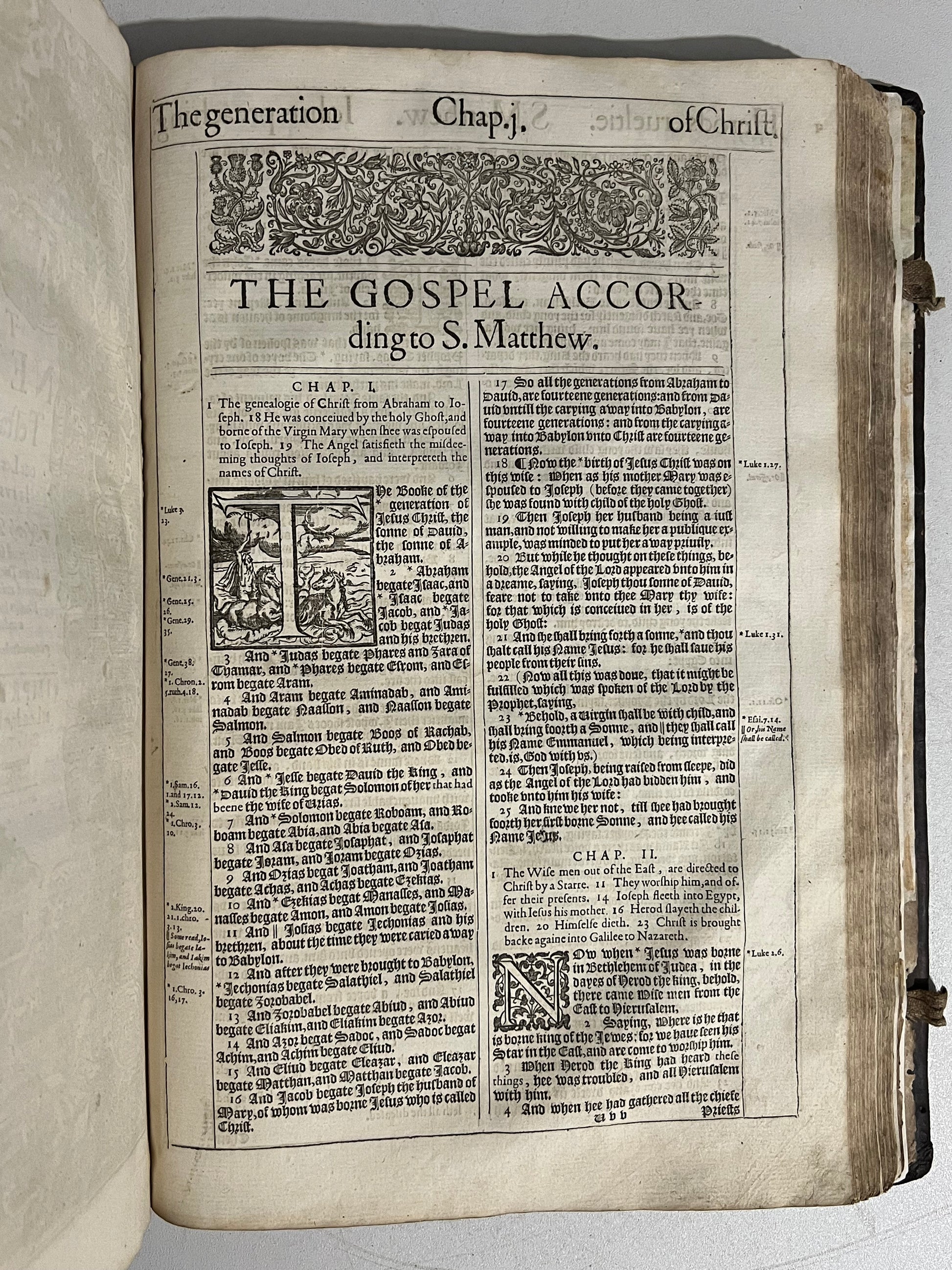 "Appointed to be read in Churches", the original King James Bible was printed for use in the pulpit and therefore exposed to continual public use on lecterns, often for centuries. Subsequently, practically all surviving copies are significantly damaged, usually lacking a large number of pages, and are almost always lacking one or, more commonly, both title pages. This example is one of the most remarkable surviving copies to surface and has clearly been incredibly well looked after through its over 400 year lifetime.
