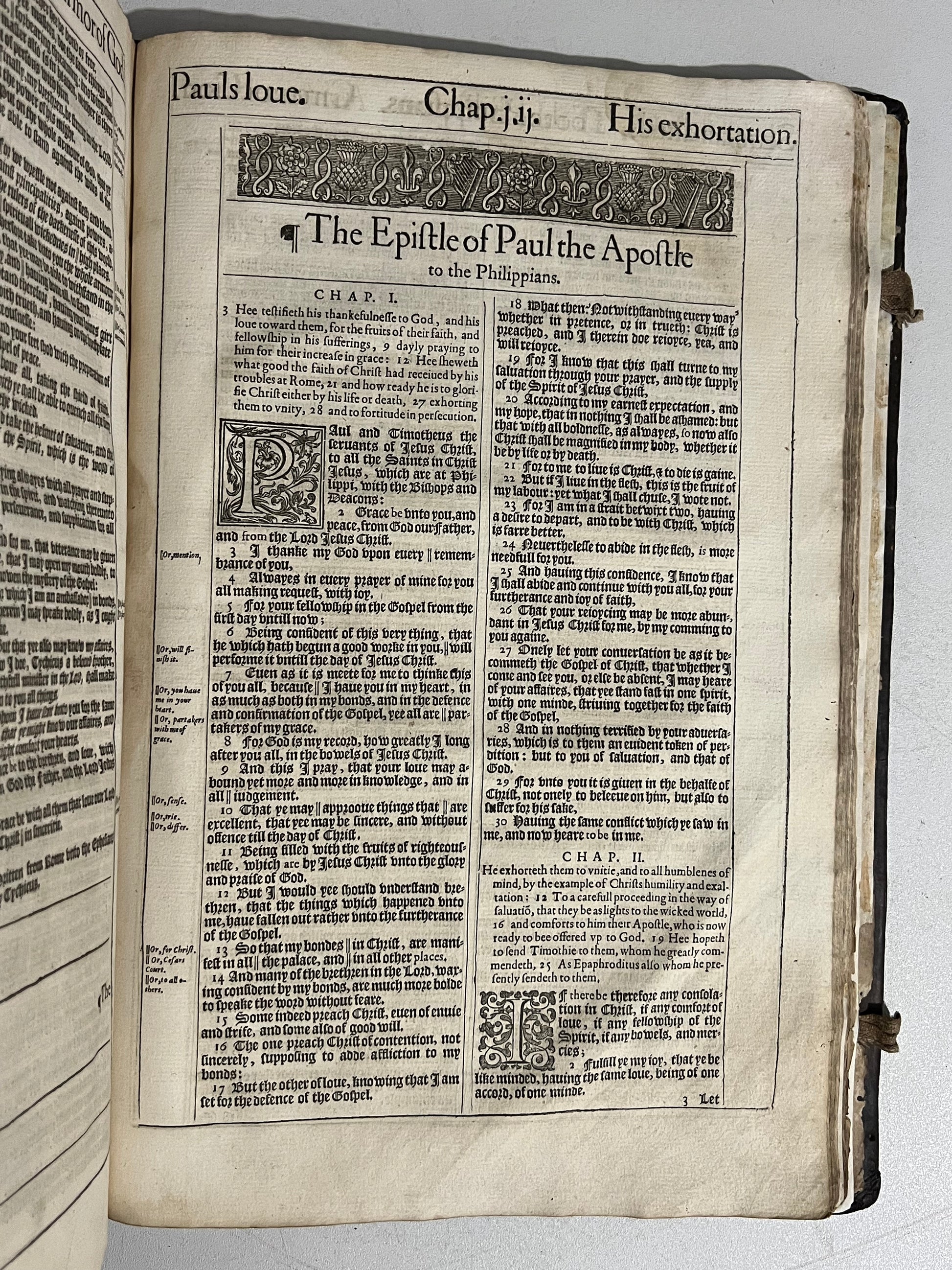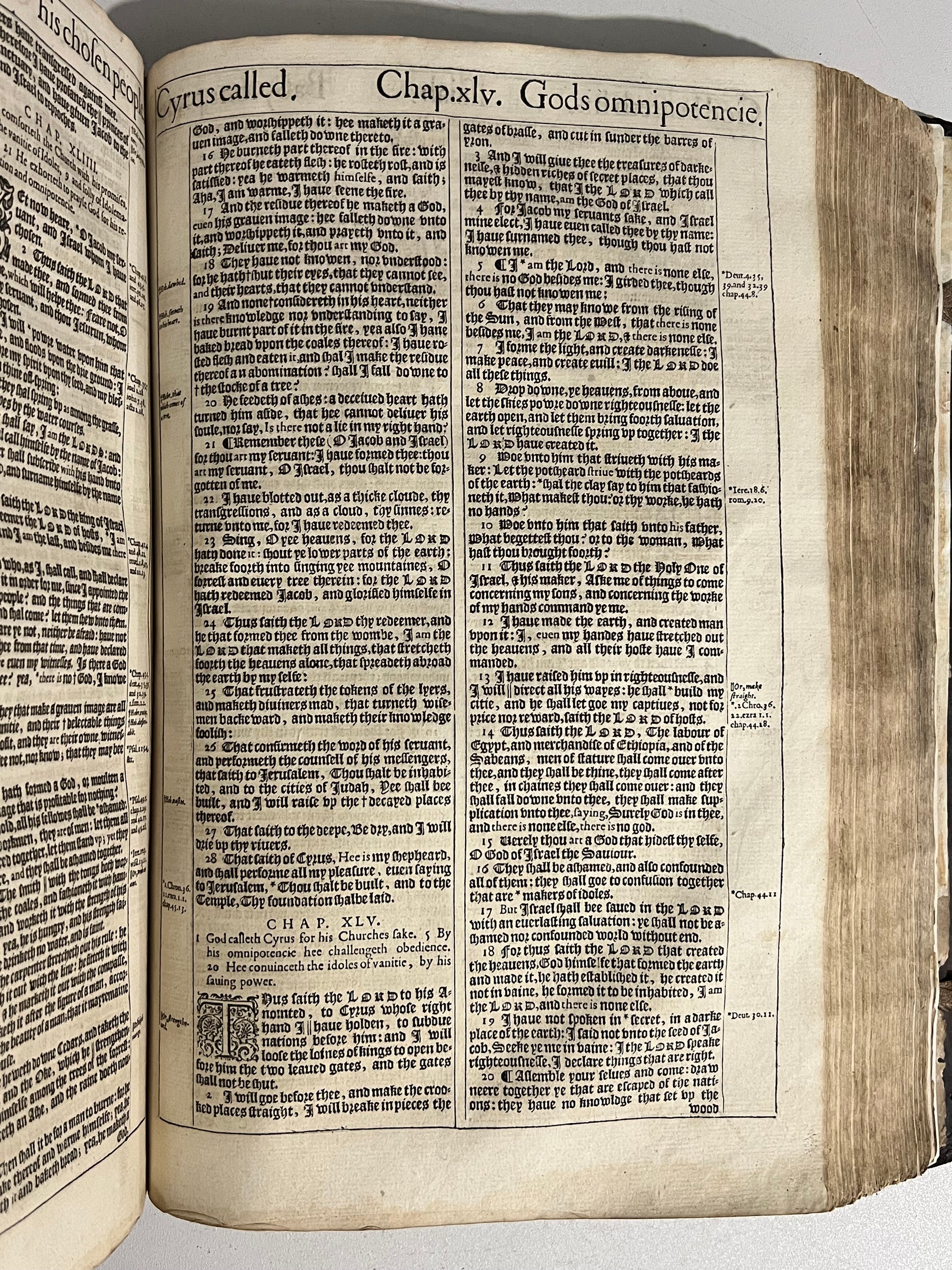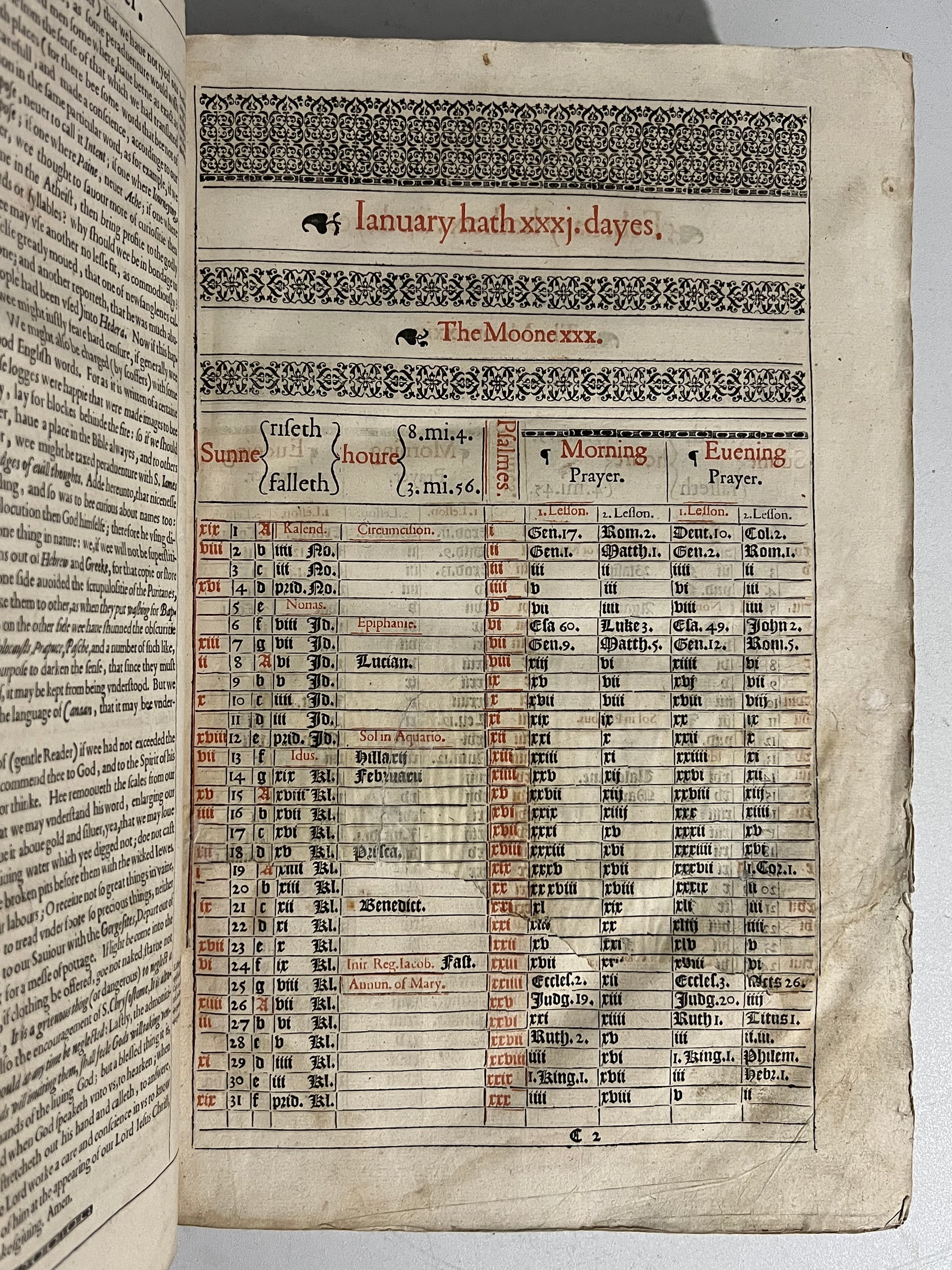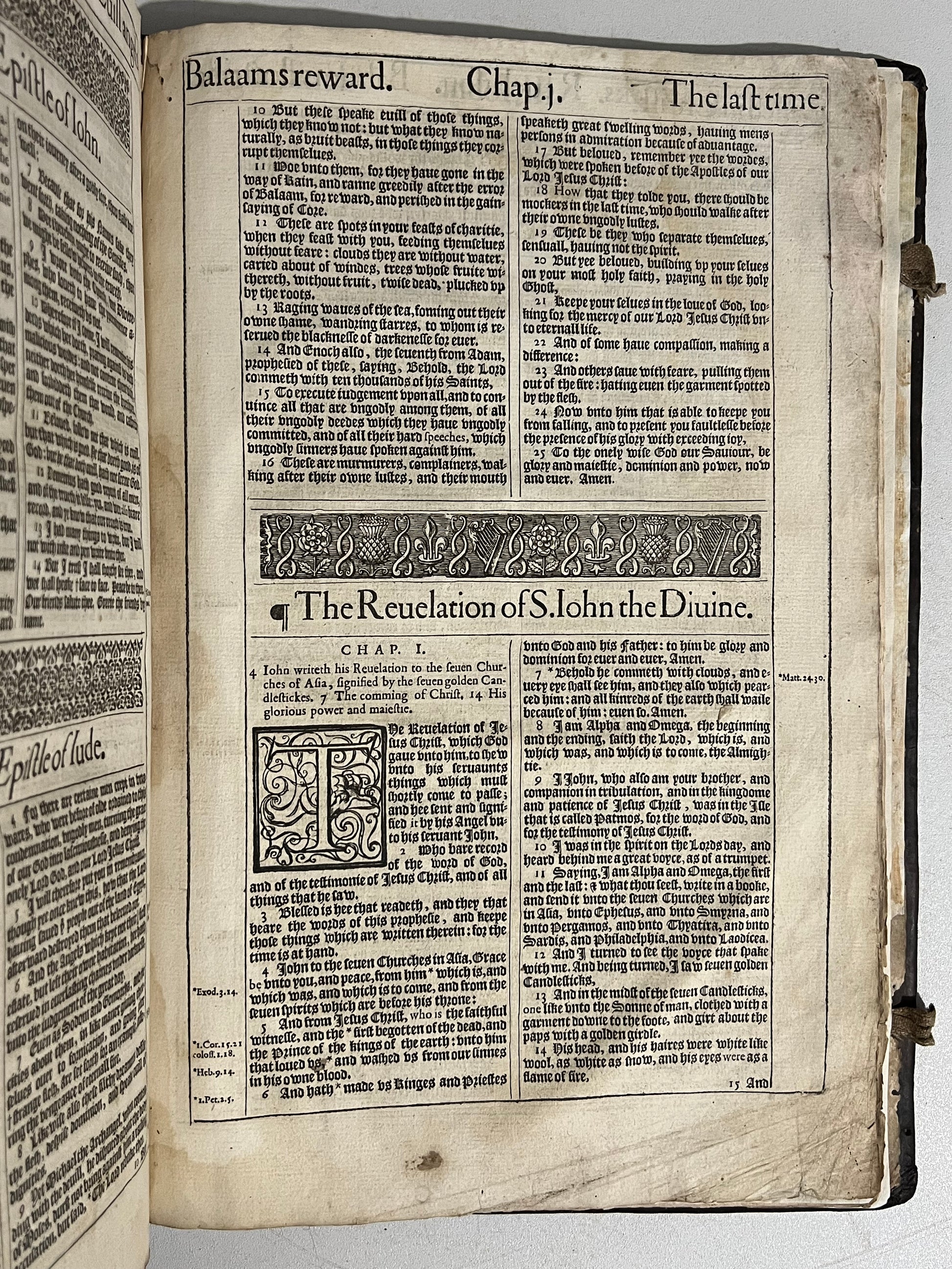 "Appointed to be read in Churches", the original King James Bible was printed for use in the pulpit and therefore exposed to continual public use on lecterns, often for centuries. Subsequently, practically all surviving copies are significantly damaged, usually lacking a large number of pages, and are almost always lacking one or, more commonly, both title pages. This example is one of the most remarkable surviving copies to surface and has clearly been incredibly well looked after through its over 400 year lifetime.