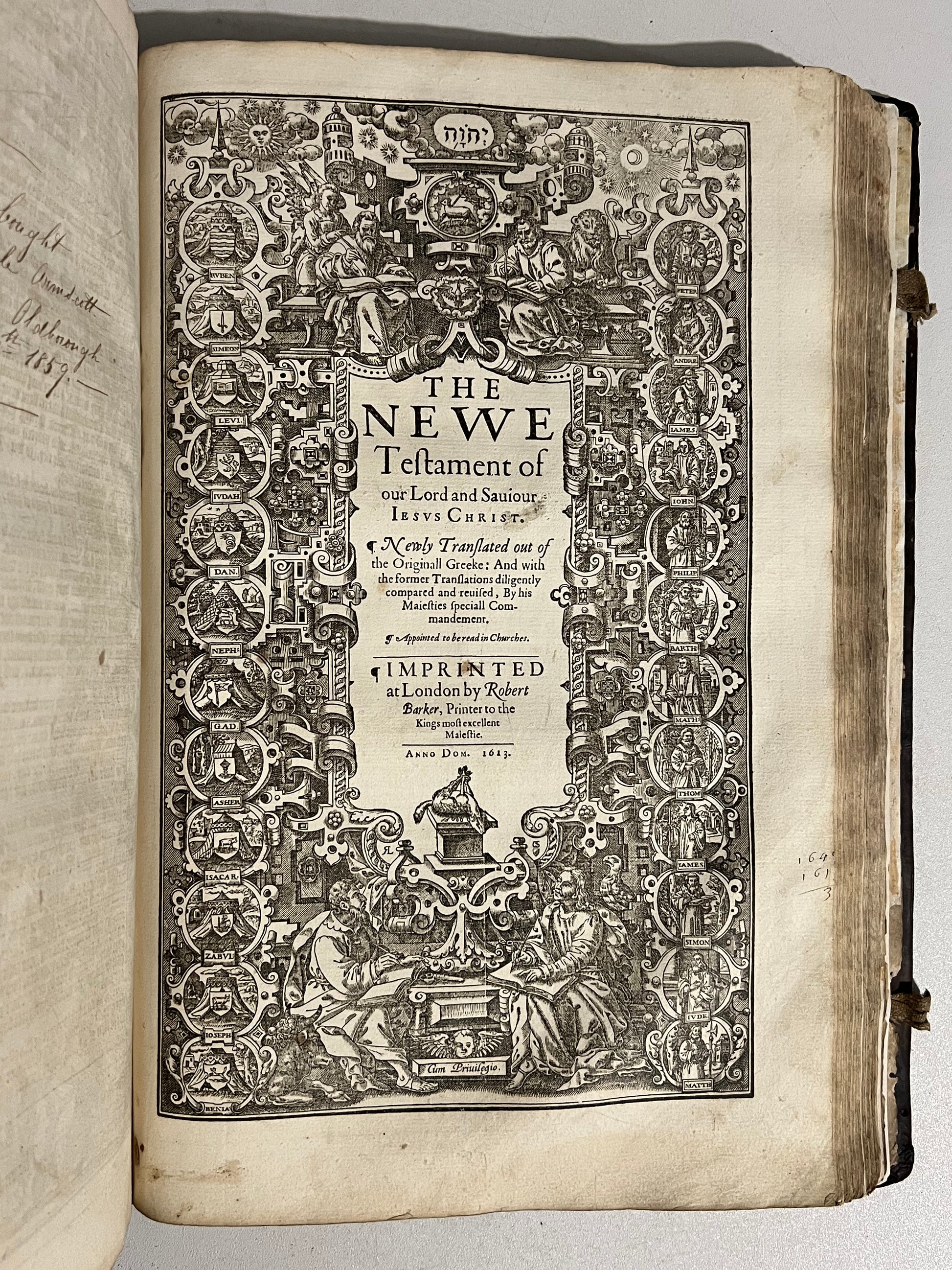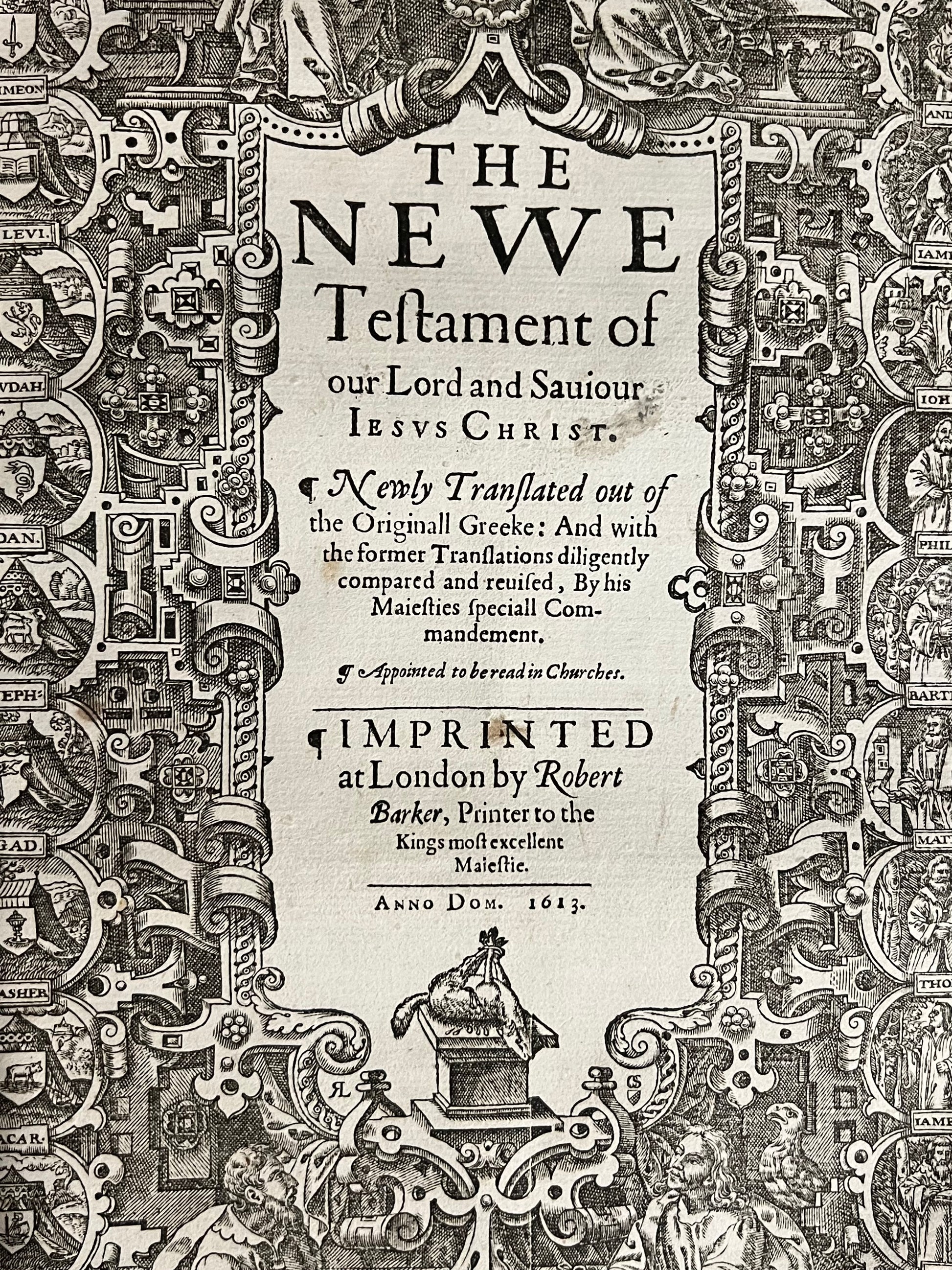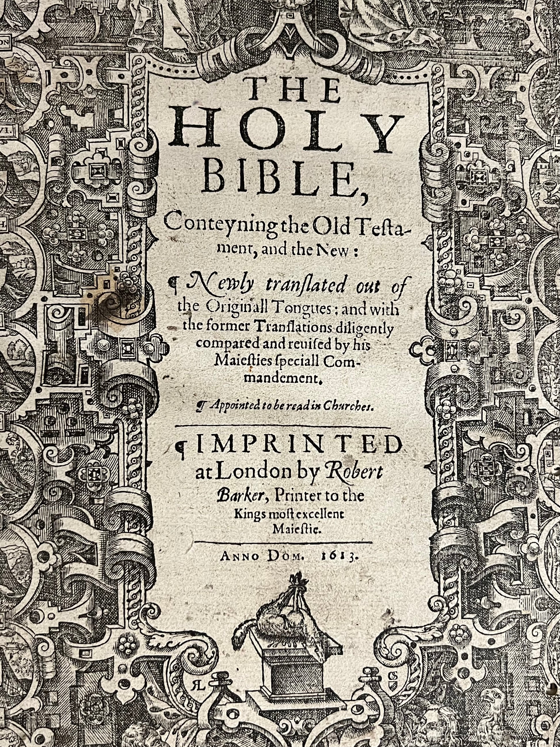 The Holy Bible, Conteyning the Old testament and the new: Newly Translated out of the Originall Tongues: and with the former Translations diligently compared and revised by his Maiesties special Commandement. Appointed to be read in Churches. London: Robert Barker, 1613, folio.