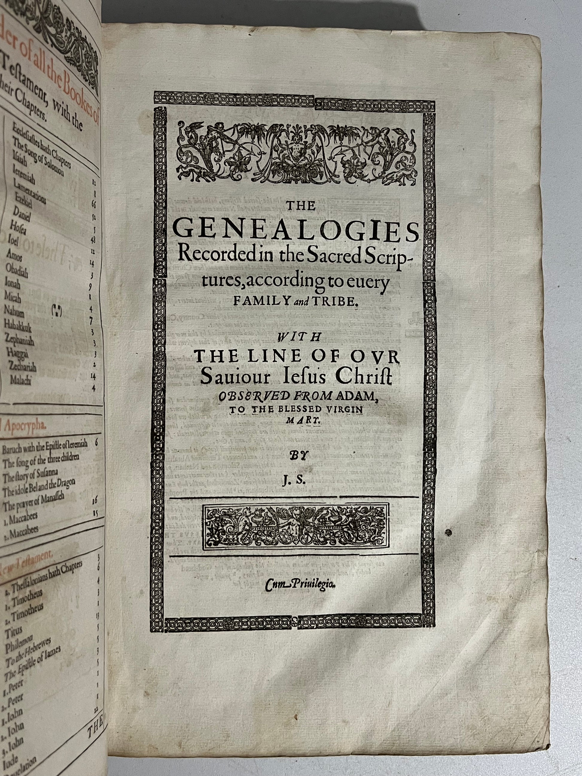 The Preliminaries and the Genealogies are extremely bright, generally clean, and overall in near fine condition, collated as complete. Old Testament collated as complete and extraordinarily bright and clean. Apocrypha collated as complete, similarly excellent condition. New Testament collates as complete, also exceptionally bright and clean, with the final few leaves of Revelation supplied in 18th century manuscript facsimile (4N2-4) and so lacks the originals of these last three leaves, the facsimile leaves occupy the collation up until 4N6, but the originals would only occupy 3 leaves with the collation terminating at 4N4 as per the bibliographies, and so only 3 leaves are lacking at the end, and not more. The collation continues uninterrupted from Genesis through to Revelation, but resets after the preliminaries & calendar and then again after the Genealogies. C1 (Jan-Feb calendar) with some loss at the foot of the leaf with some minor restoration. The cherubim in the printer's device at the foot of d4 (preliminaries) are nicely coloured by a contemporary hand. Small stain to B1-2 (OT), and R2 (OT) not obscuring text. Some very minor dampstaining in the outer blank marginal space of the F gathering (OT), not affecting text. Some minor small stains at the head of Uu3, not obfuscating textual legibility (OT). Repair of a tear to Iii2 (OT), very finely done, not affecting text, practically unnoticeable. 3T6 is the New Testament title page and so the Apocrypha ends at 3T5. Marginal repair to two leaves 4F3-4 (NT) to include some slight loss to text in the bottom right, generally only catching a few letters at the end of the lines. Some toning to leaves in the 4H gathering (NT), not affecting any legibility, and is practically imperceptible. Minor repair to the bottom right corner of 4M6 (NT), not touching any text. 4N1 (NT) torn with loss to the bottom quarter of the leaf, with the originals for 4N2-4 lacking and provided in circa 18th century manuscript facsimile (NT). In a small number of places, generally in the preliminaries, there are a few contemporary ink marks, not obscuring any text, legibility, etc. The full text block is free of marginalia, underlining, writing, etc. An exceptional text block. This edition was never issued with a map when printed (Fry's No.13).