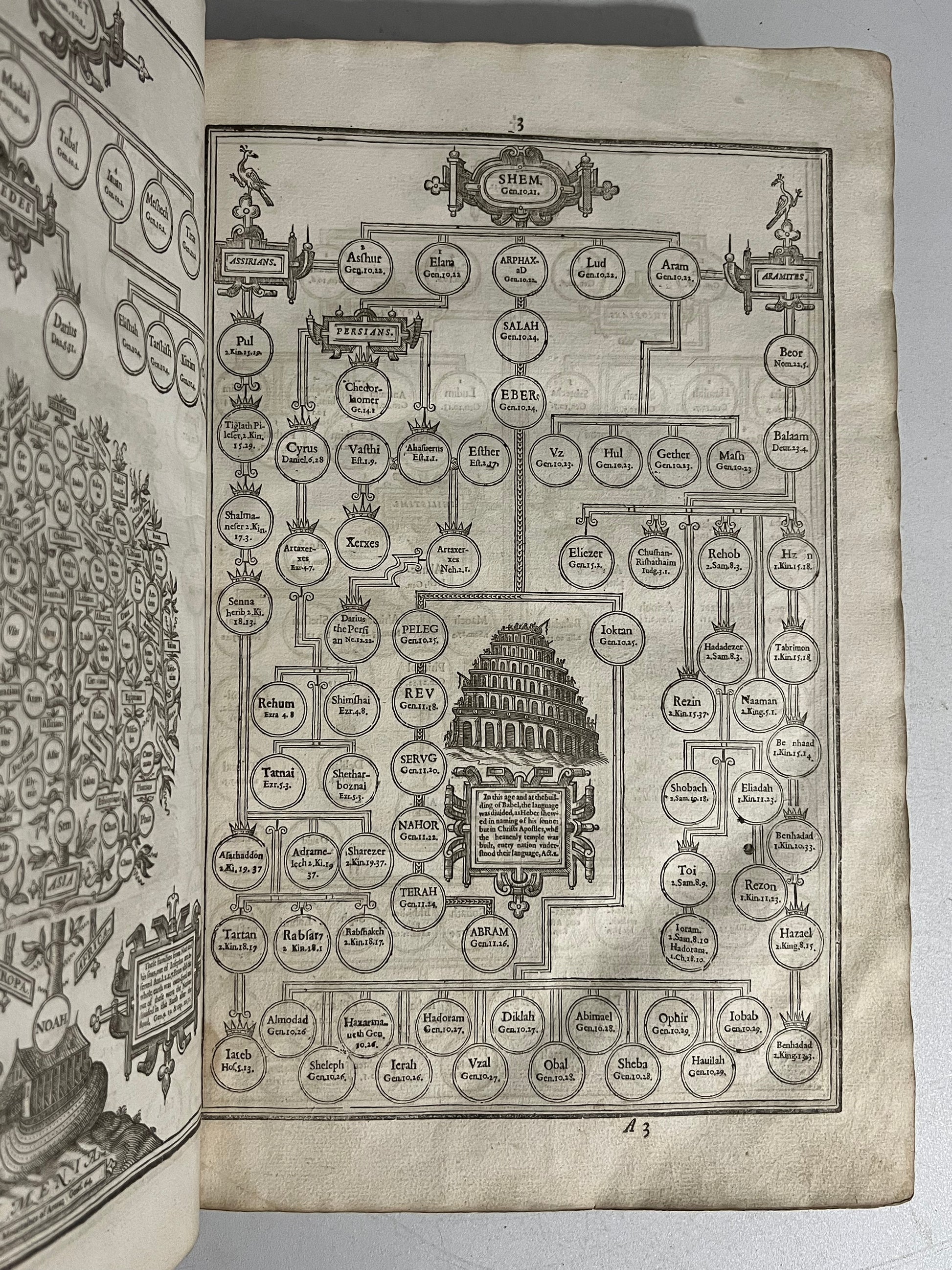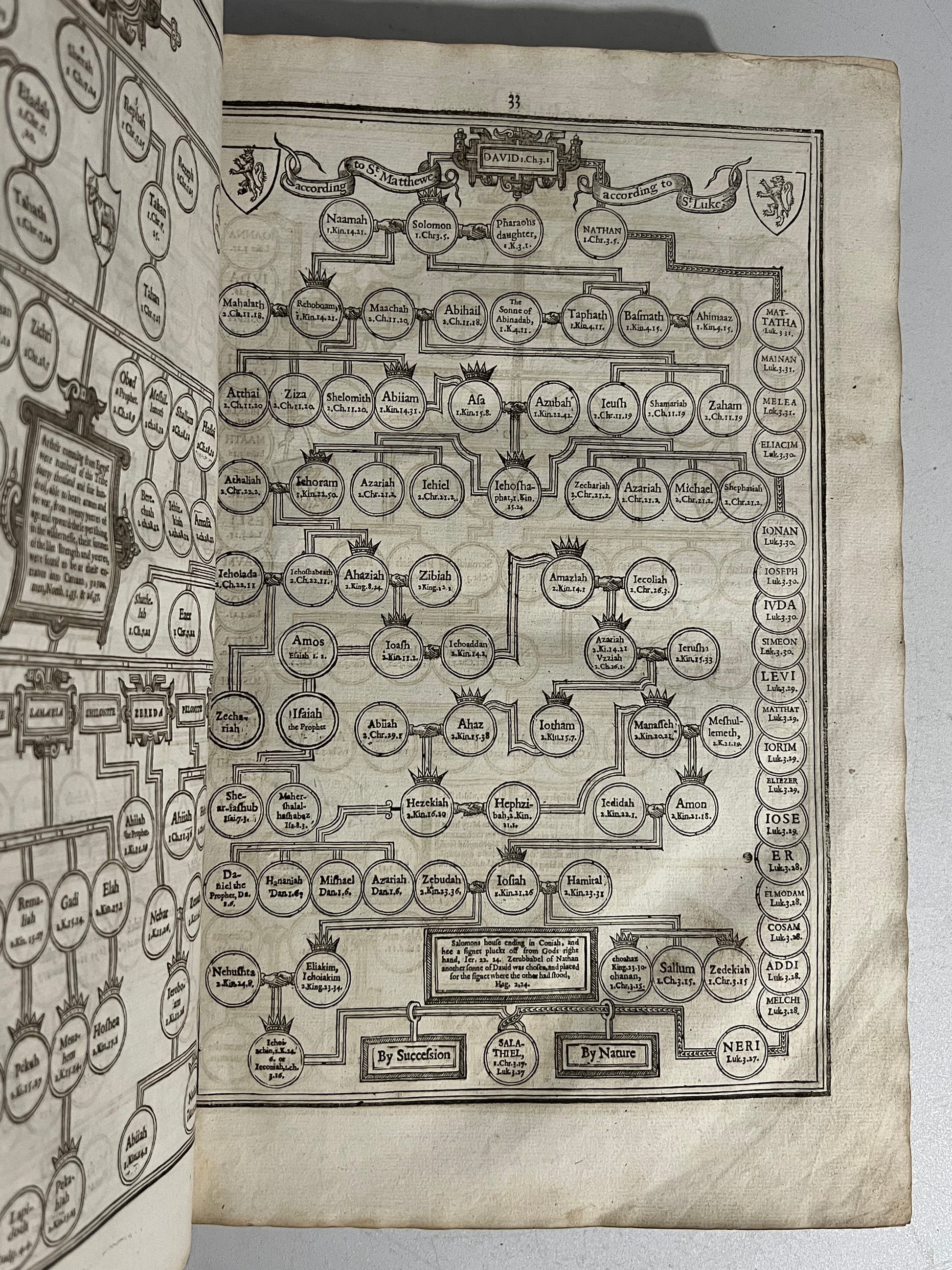 SECOND EDITION of the King James Bible, with the reading "she went into the citie" in Ruth 3:15. This is the true 1613 pulpit folio edition, with 72 lines to the full column, preceded only by the very rare 1611 folio, here reprinted with slight textual and typographical variations - the largest variation of course being 72 lines per page rather than 59. A phenomenal example of this very rare second edition of the King James Bible in one of the best obtainable conditions, complete with both original title pages and the beautiful extensive engraved genealogies.