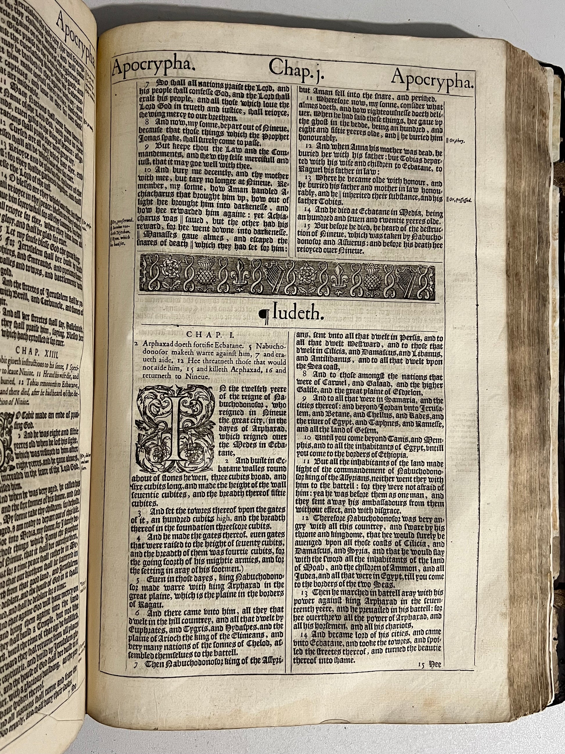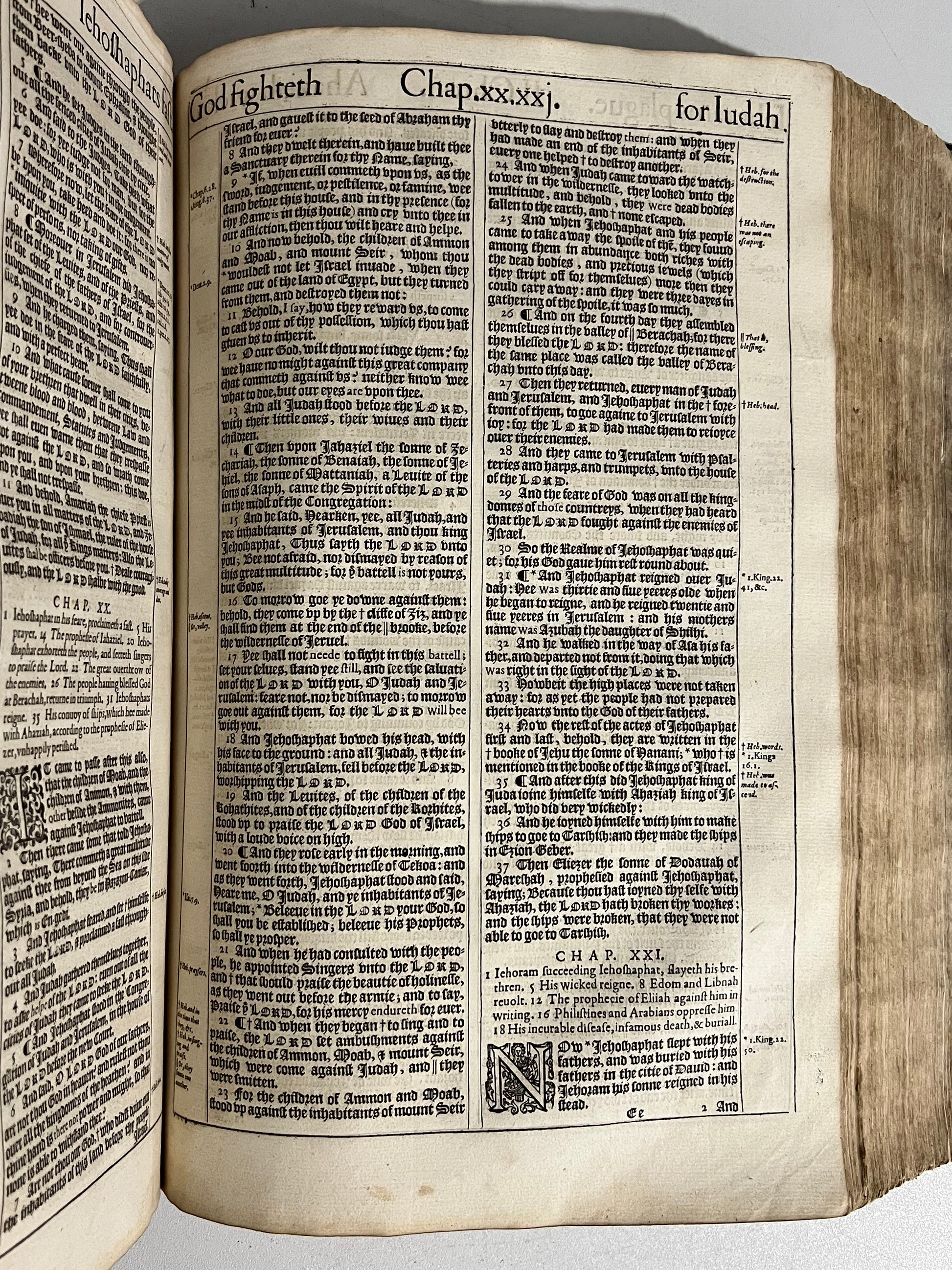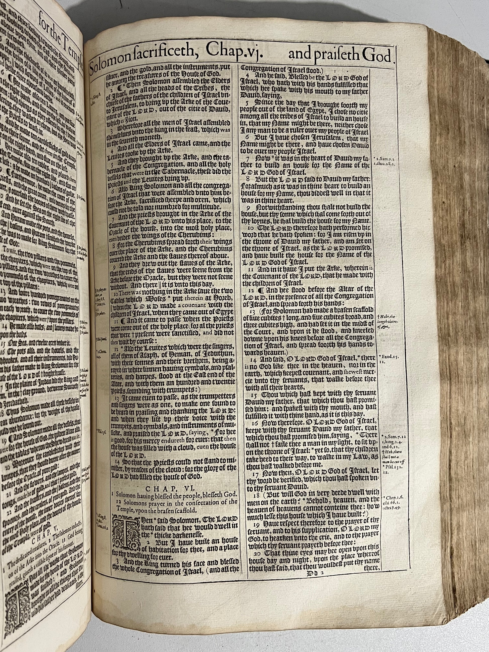 The King James Bible in its original pulpit folio format was printed in 1611, 1613 (as here), 1617, 1634, and 1640. All of these original pulpit folio editions are extremely rare to find in acceptable condition, owing to their extensive ecclesiastical use.
