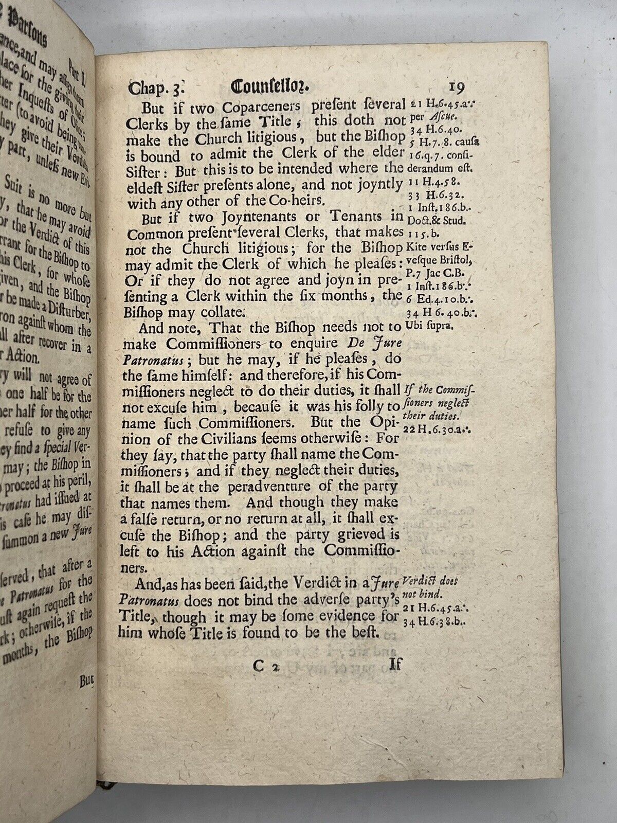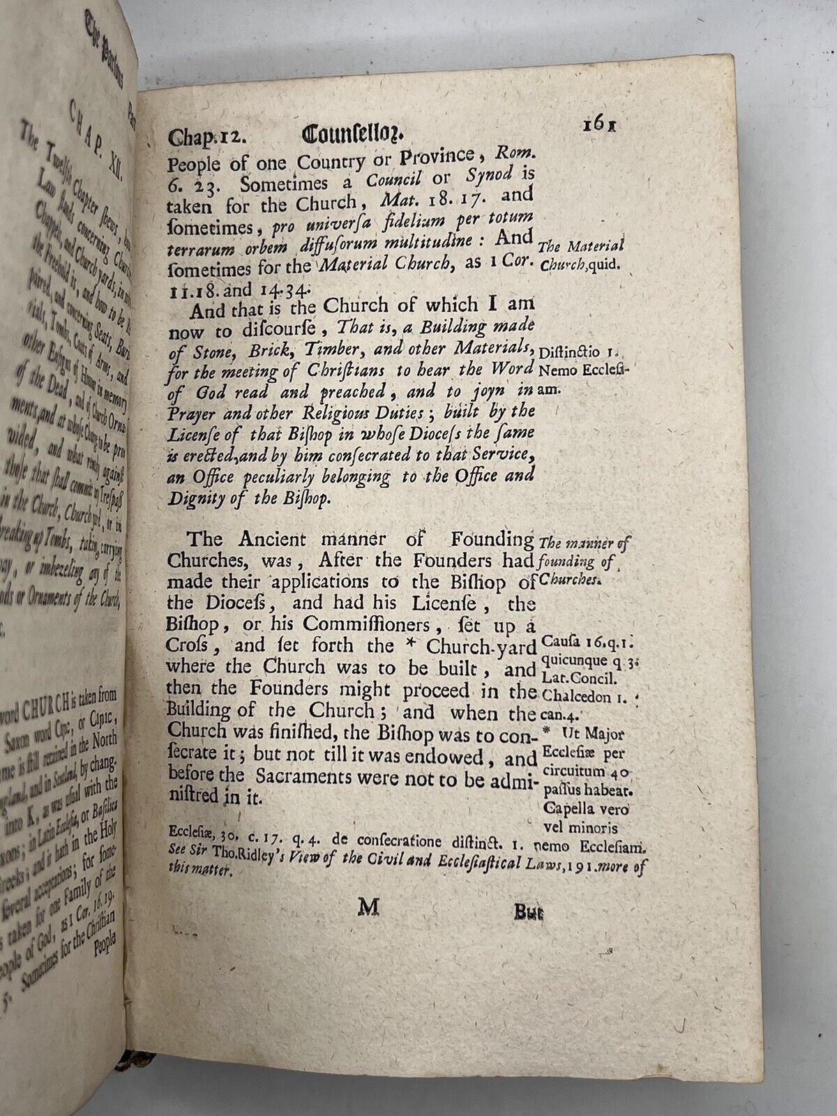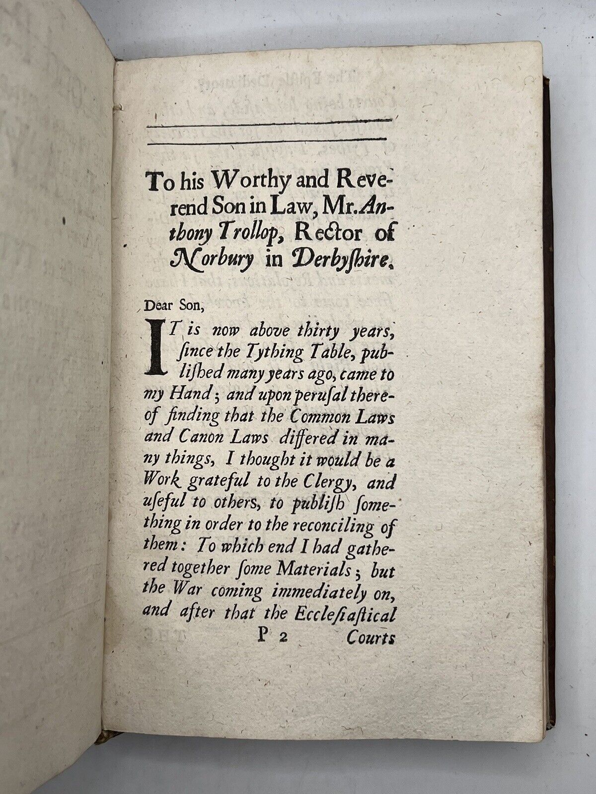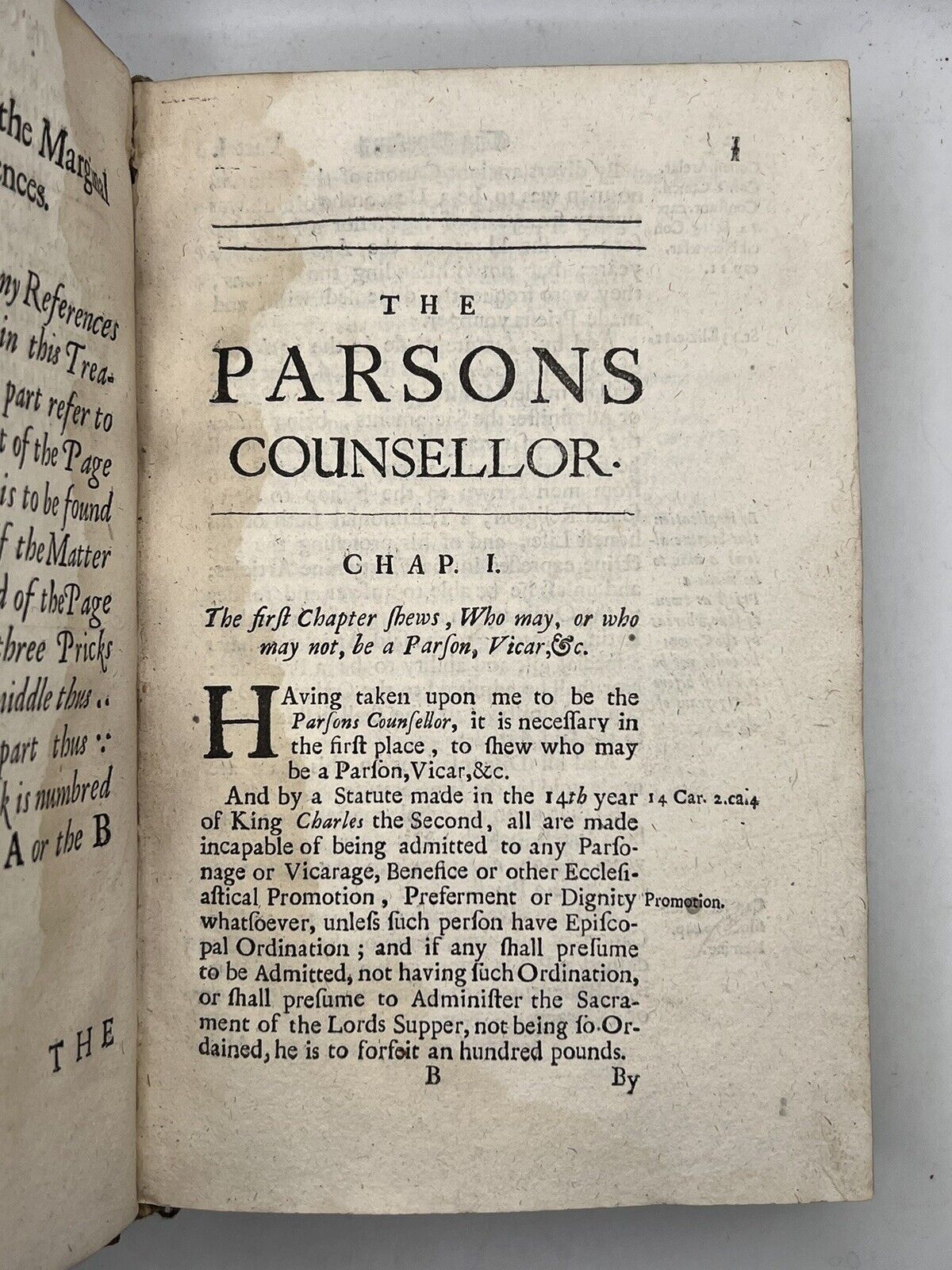 The Parson's Counsellor by Sir Simon Degge, first published in 1676 and later revised into its final edition in 1820, is a significant treatise divided into two books. Here is the fifth edition printed in 1695. The first book outlines the procedures that parsons and vicars must follow to obtain a preferment, detailing the duties imposed by such appointments and various regulations clergymen must adhere to. The second book delves into the intricate matters of tithes, offerings, mortuaries, and other church duties, elucidating relevant canon, common, and statute laws, as well as the courts and suits involving tithes. Sir Simon Degge, a distinguished judge and legal expert, authored this influential work, drawing upon his extensive experience in the legal profession and his commitment to the principles of the Church of England. The book served as a leading textbook on its subject matter for many years, reflecting Degge's expertise and his dedication to upholding the practices and regulations of the Church.