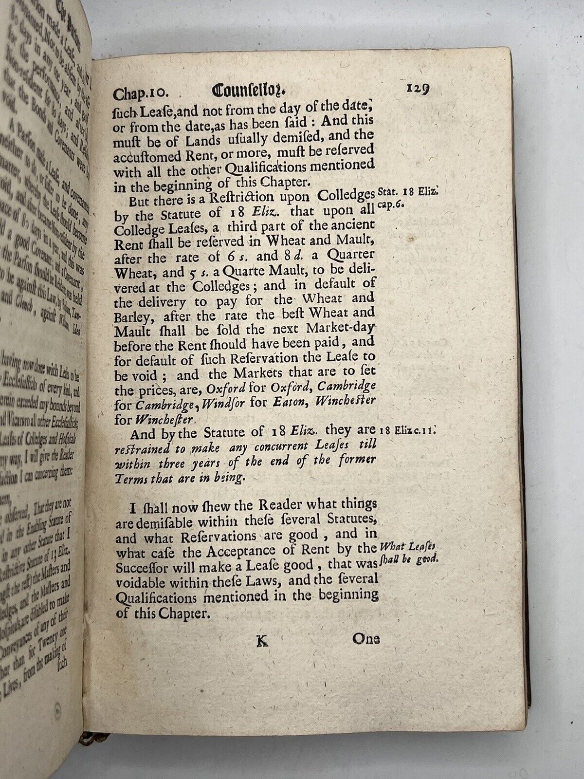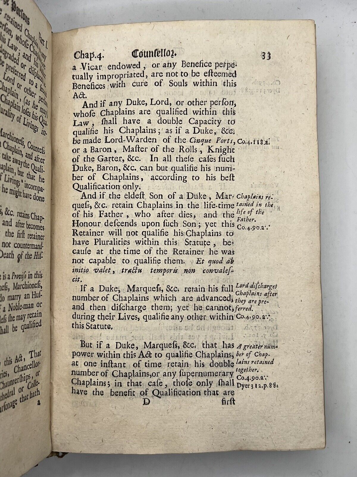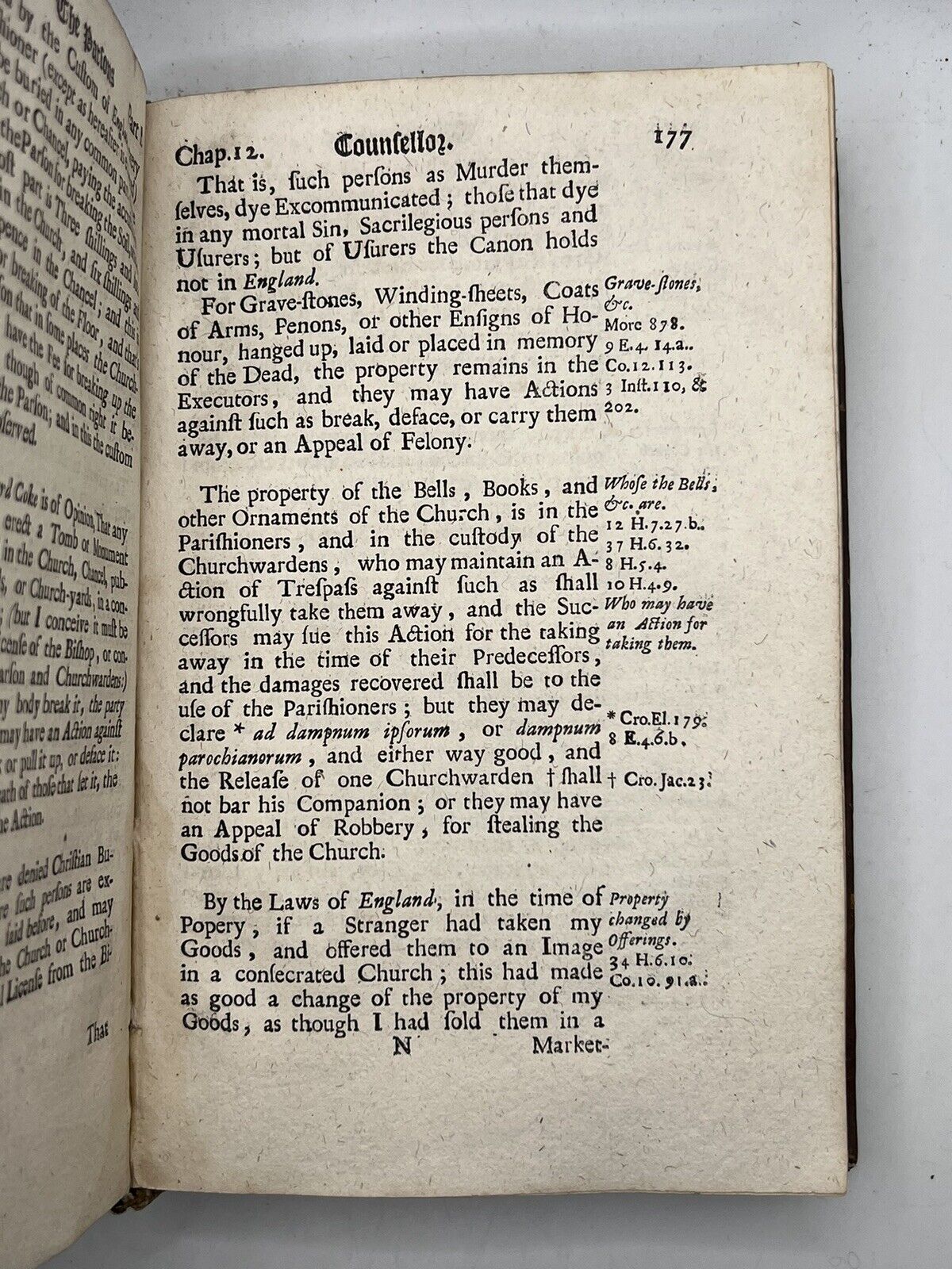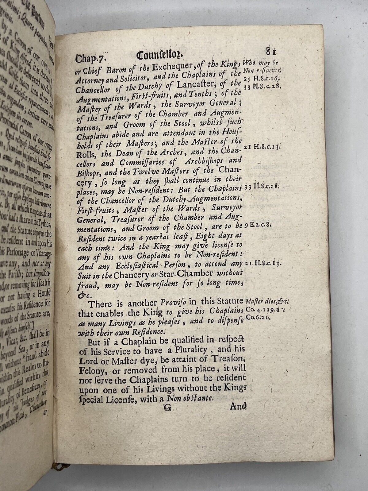 The Parson's Counsellor by Sir Simon Degge, first published in 1676 and later revised into its final edition in 1820, is a significant treatise divided into two books. Here is the fifth edition printed in 1695. The first book outlines the procedures that parsons and vicars must follow to obtain a preferment, detailing the duties imposed by such appointments and various regulations clergymen must adhere to. The second book delves into the intricate matters of tithes, offerings, mortuaries, and other church duties, elucidating relevant canon, common, and statute laws, as well as the courts and suits involving tithes. Sir Simon Degge, a distinguished judge and legal expert, authored this influential work, drawing upon his extensive experience in the legal profession and his commitment to the principles of the Church of England. The book served as a leading textbook on its subject matter for many years, reflecting Degge's expertise and his dedication to upholding the practices and regulations of the Church.