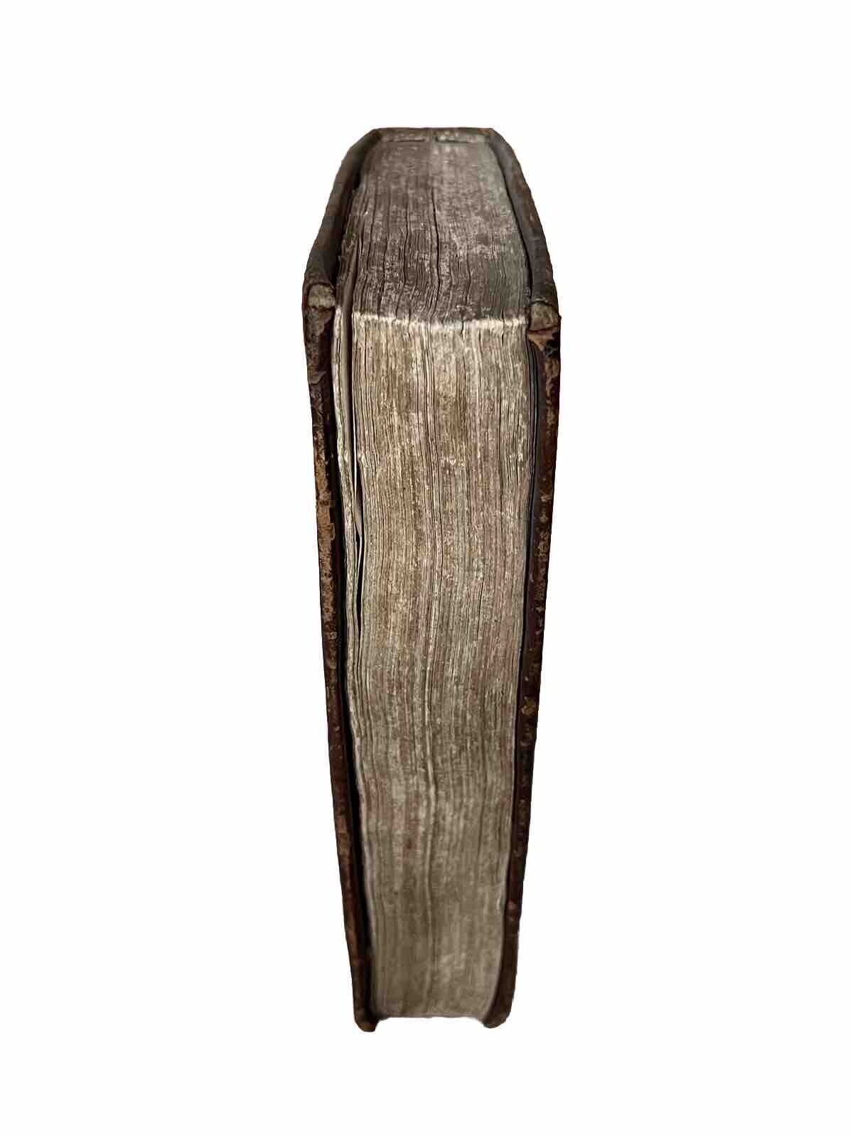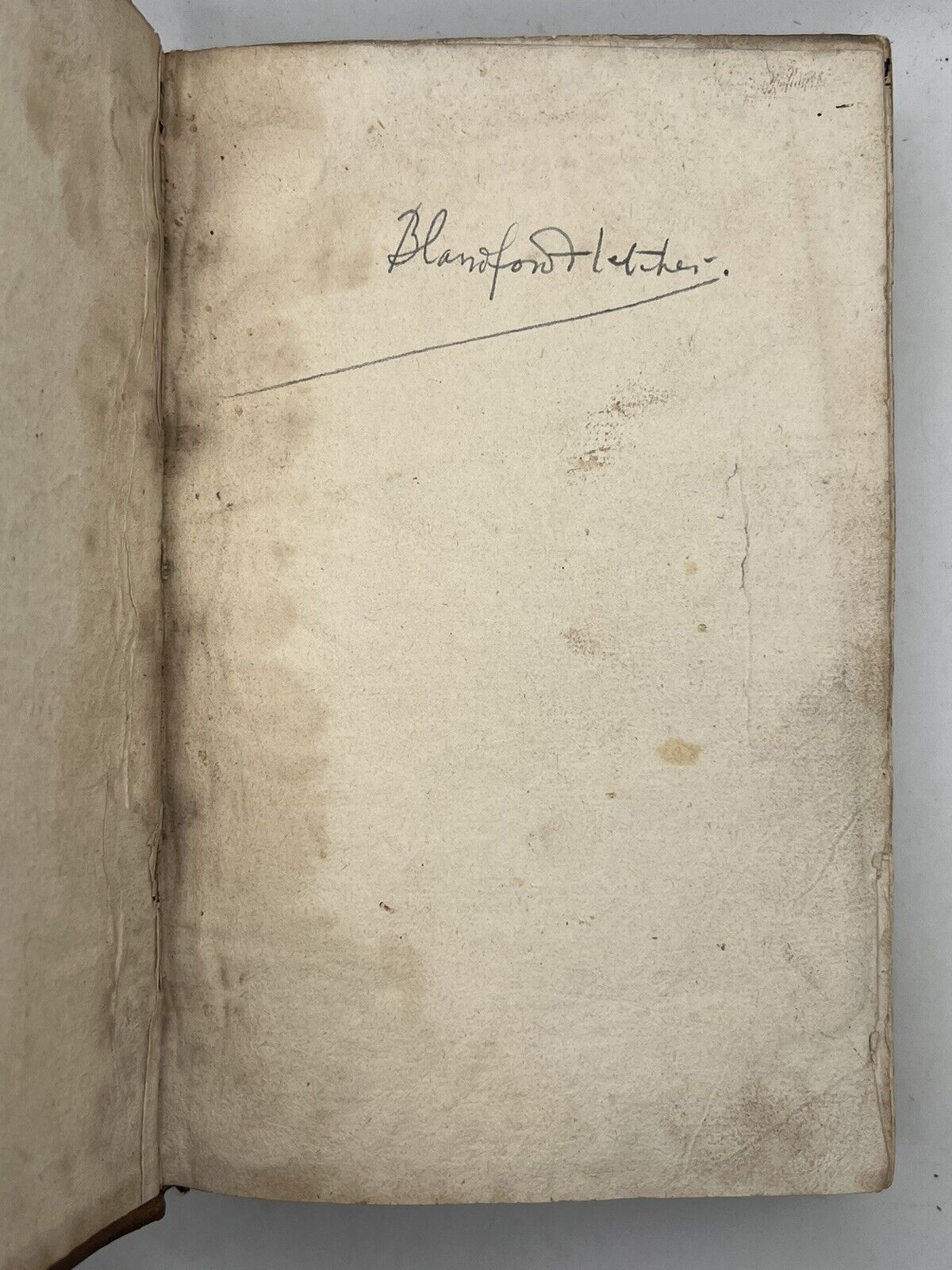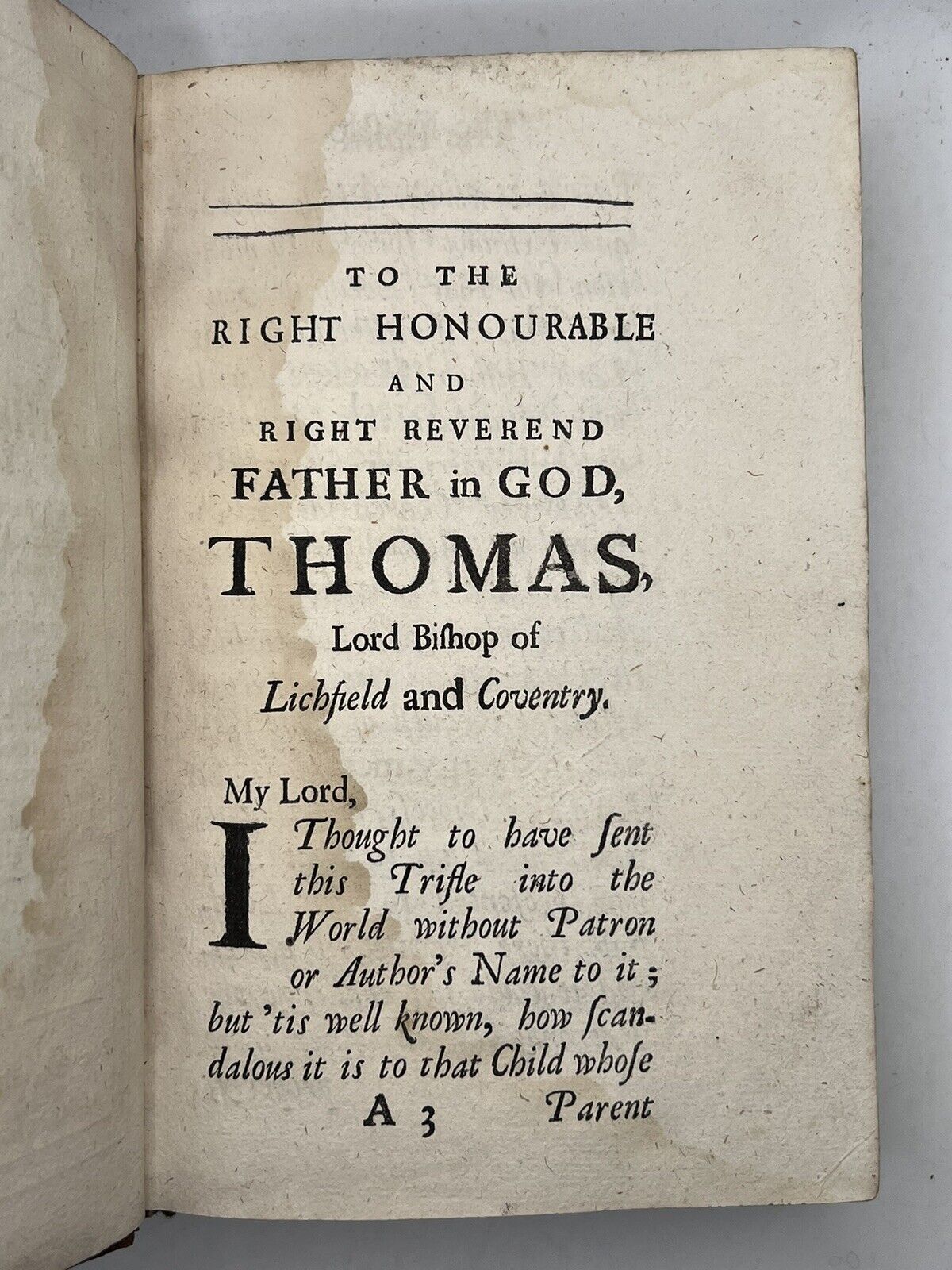 Contemporary full calf binding without external identification marks, probably as bound. Binding rubbed and a little dry, but with the binding secure, both boards securely attached, and without shelf lean. Boards slightly warped outward, also likely as bound. Boards with a blindstamped panelled design, probably bound in Oxford. Pencil ownership inscription to front blank, and an ink ownership inscription to head of title page. Dampstain in gutter from the beginning, reducing through to C1, else internally bright and very clean throughout, the full text being legible. Collates as complete including the advertisement leaf 2F8, and the scarce message from the editor bound to the verso of the title page. Pastedowns detached from the inner boards but without loss to those blanks. A lovely copy, without restoration, contemporaneously bound, and thus rather charming indeed.