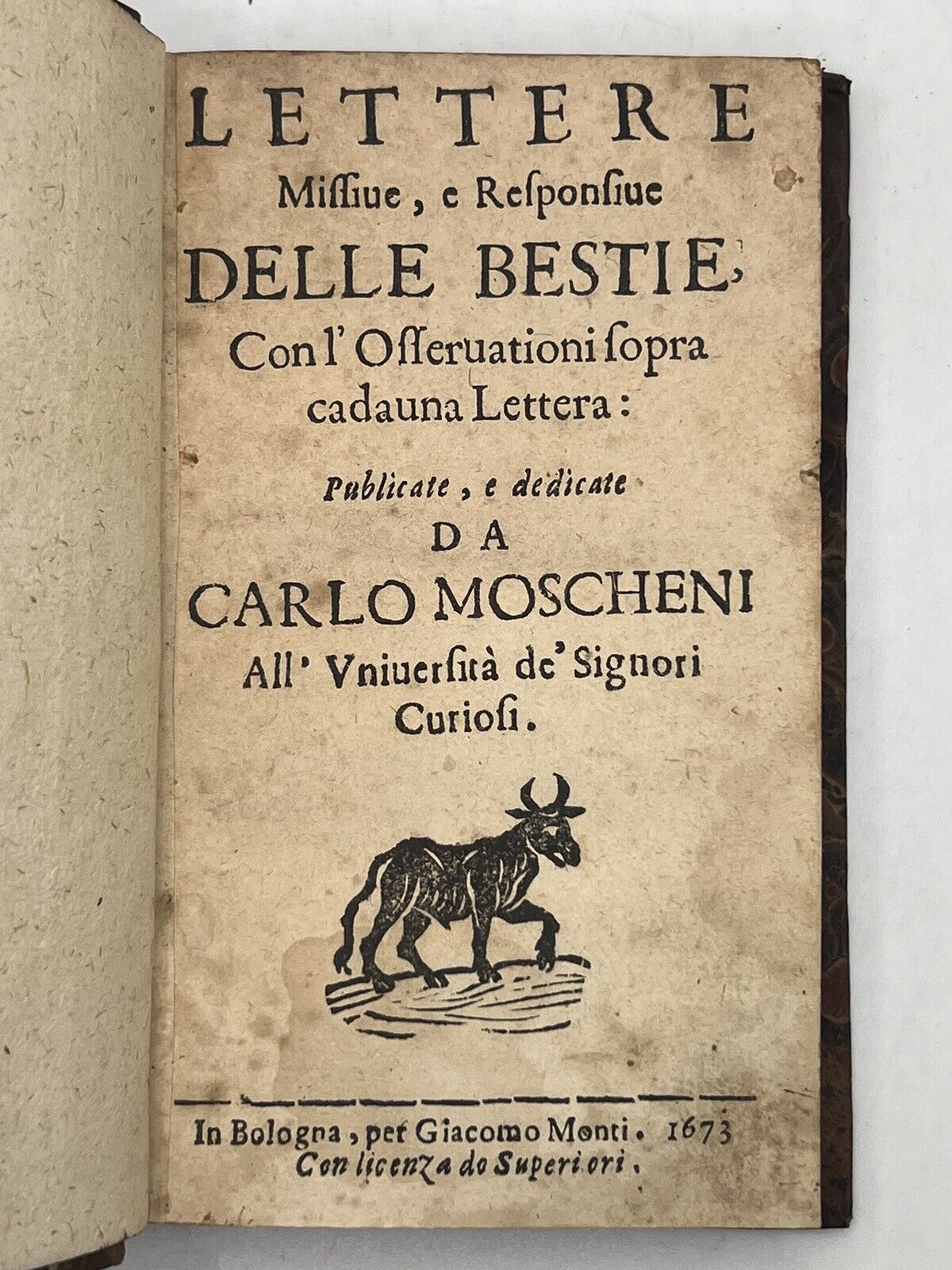 Missive and Responsive Letters of the Beasts, with Observations on Each Letter: Published and Dedicated by Carlo Moscheni to the Society of Curious Gentlemen. Bologna, by Giacomo Monti, 1673. With Permission of the Superiors.