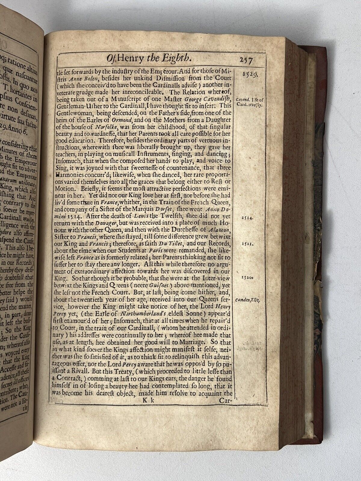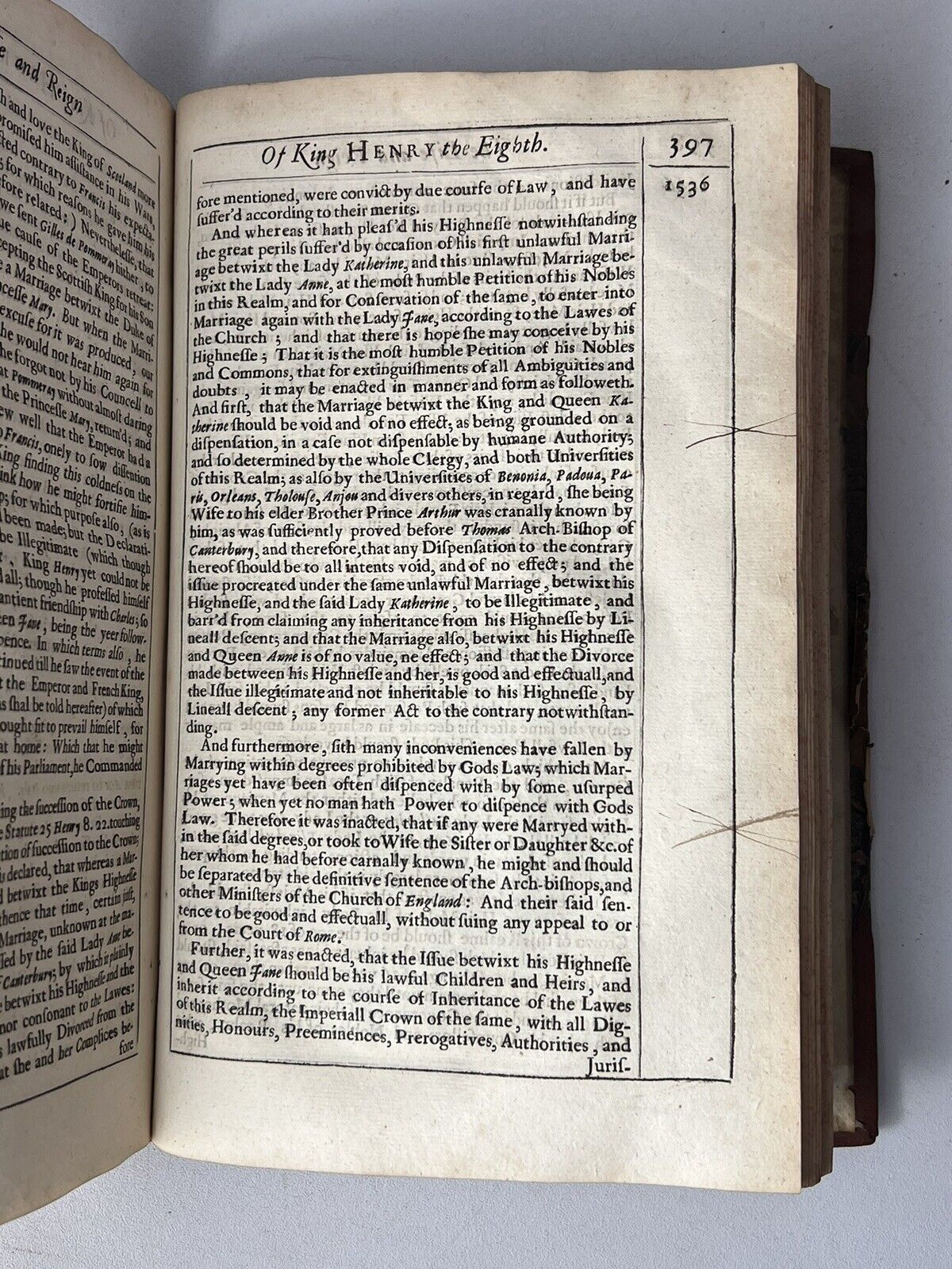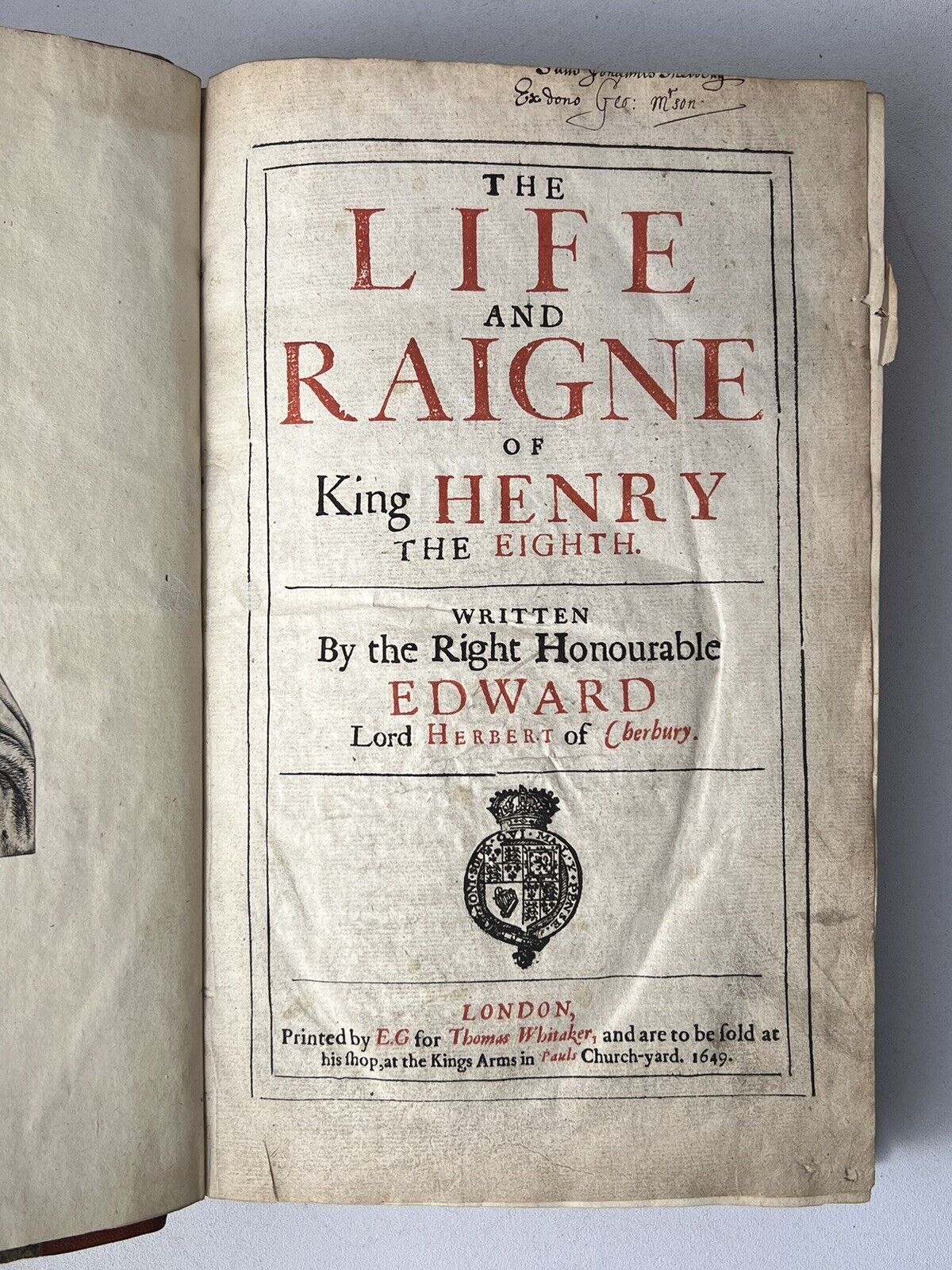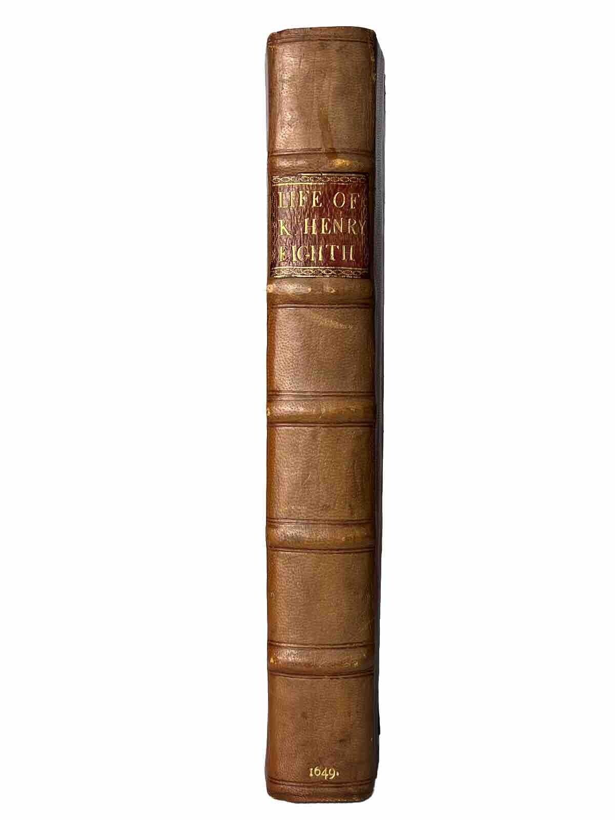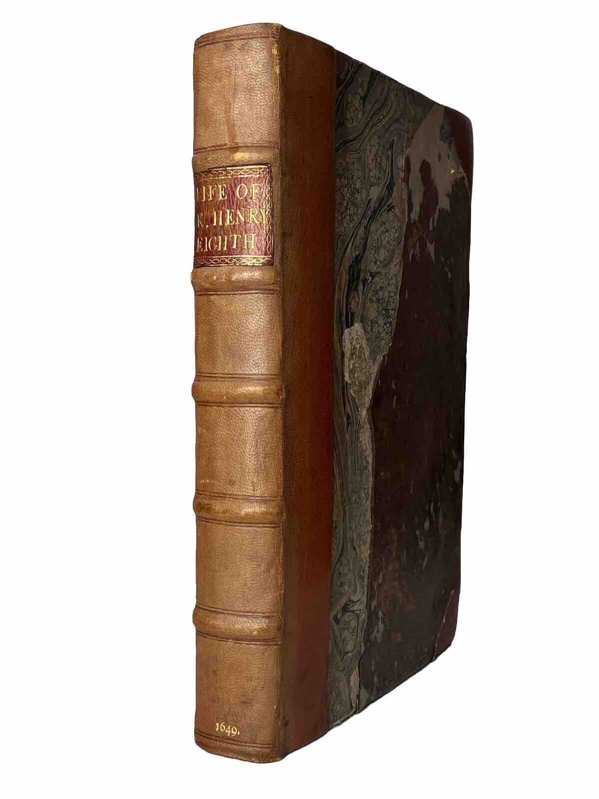 Half morocco over marbled paper backed boards, the front with some earlier leather, probably 18th century. Shows very attractively indeed on the shelf with the spine very lightly rubbed and a little sunned, but generally excellent. Preserving an earlier tooled morocco label in between raised bands with a gilt date of 1649 at the foot. Joints fine with both boards securely attached, with the hinges reinforced with cloth. Shelf and edge wear with some loss to the marbled paper at the edges as typical. Boards a little bowed but the binding is without shelf lean. Without any attached bookplates but with an ink ownership inscription to the head of the ffep of R. H. Shuttleworth and another contemporary ownership inscription to the head of the title page, partially trimmed away at the head, of George Masterson (?). Pasted cutout of Henry VIII. to the verso blank of the title page acting as a frontis, but lacking the original frontis, as often. This cutout could be taken from the original frontis, it matches the original size etc (?). Very clean throughout the text block, indeed internally excellent, just mildly toned throughout, with the odd few early ink marks in the margins throughout, nothing obscuring any text. Collated as complete except for the frontispiece.