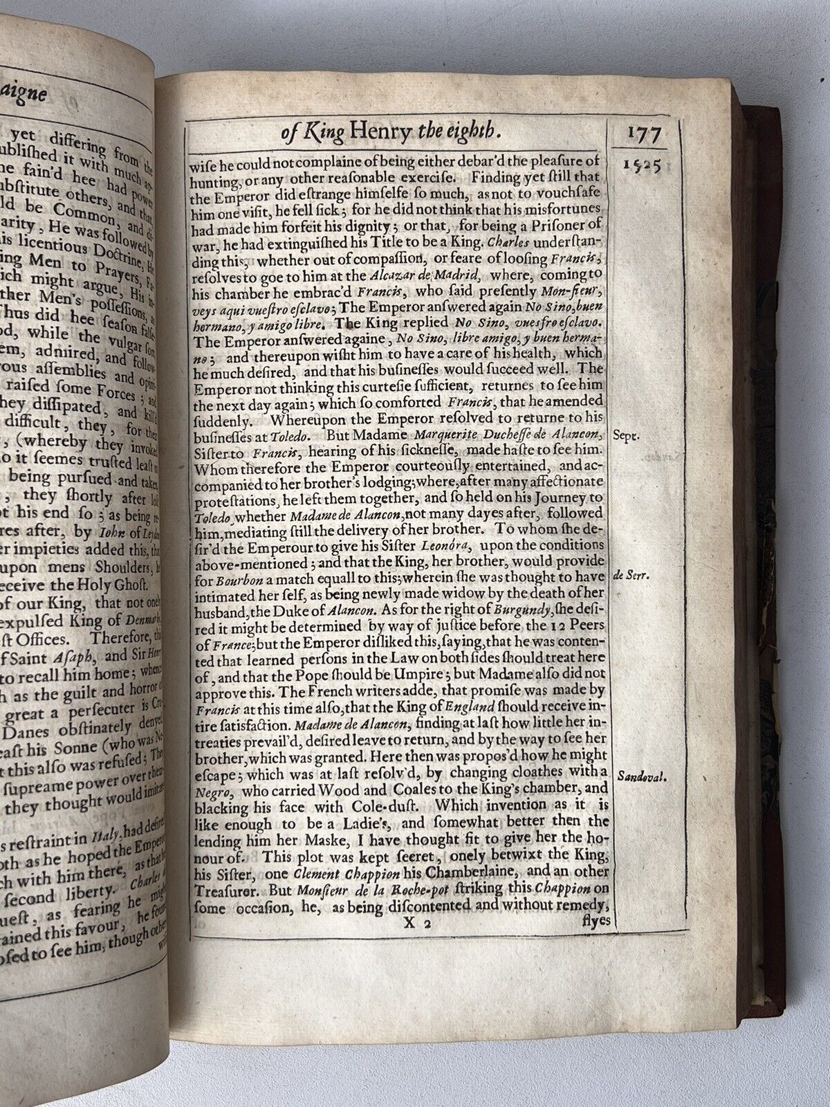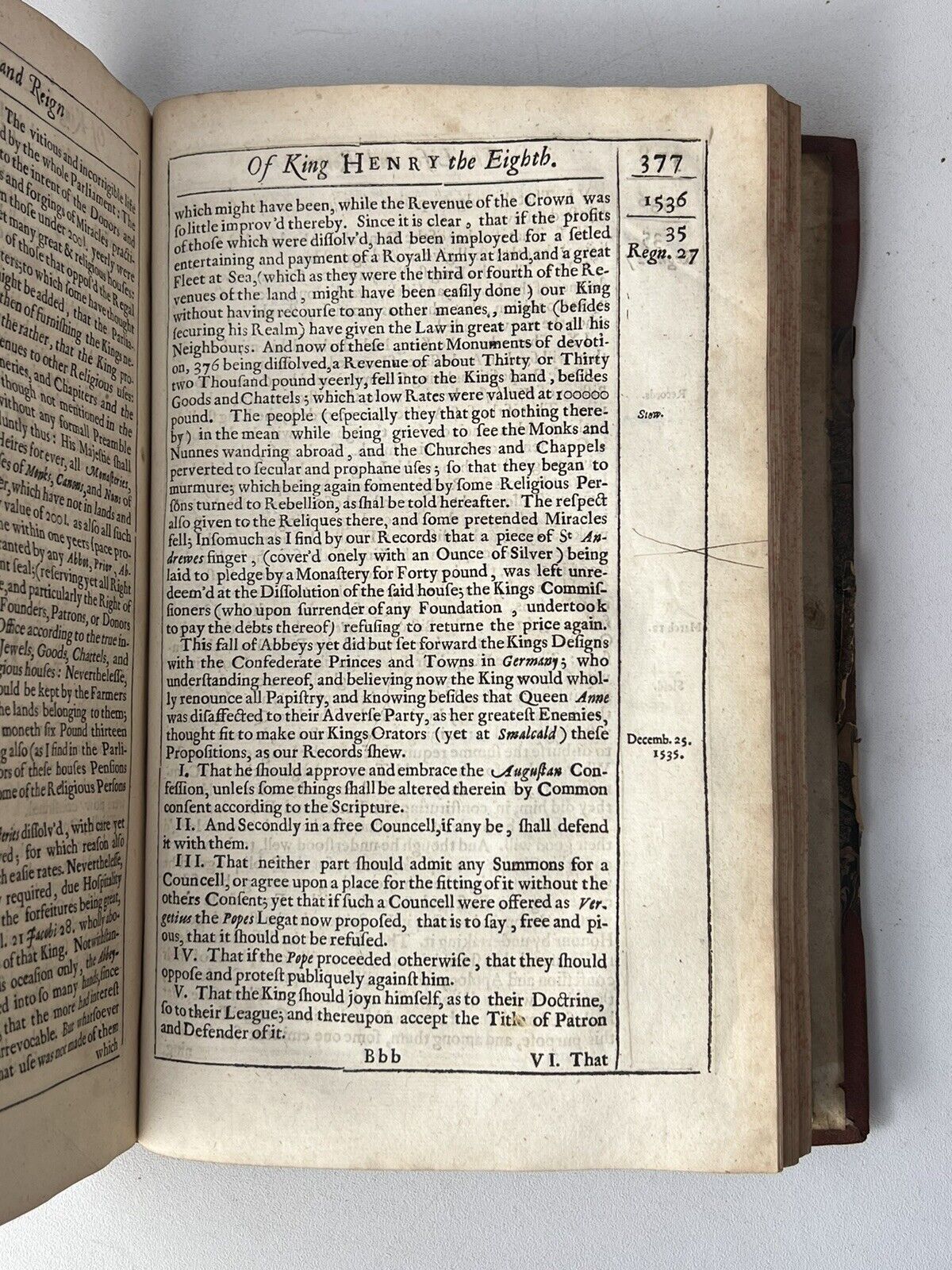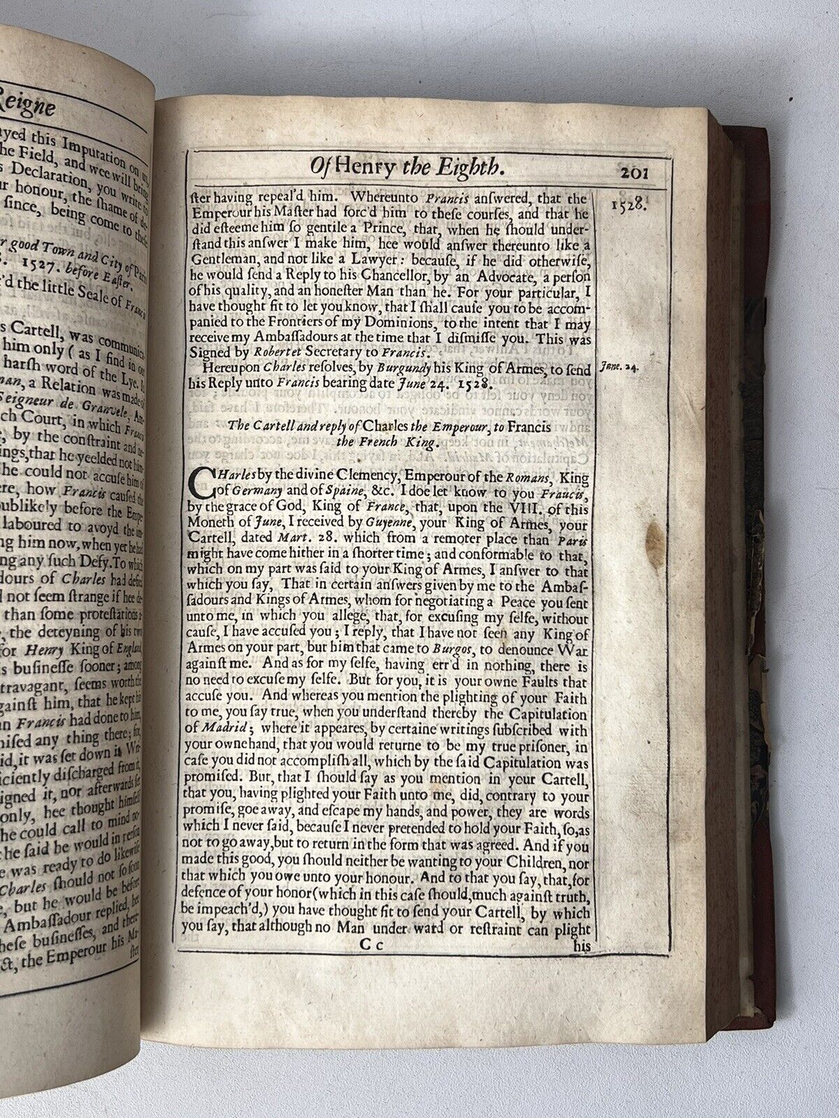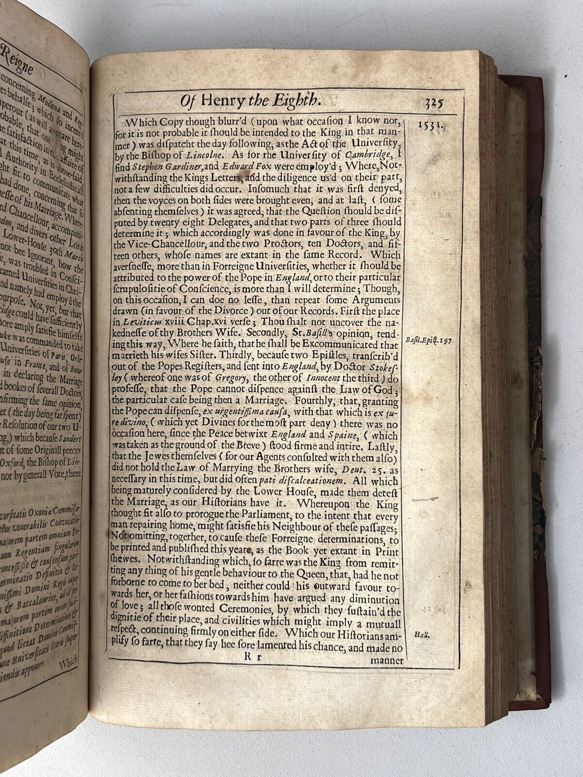 Half morocco over marbled paper backed boards, the front with some earlier leather, probably 18th century. Shows very attractively indeed on the shelf with the spine very lightly rubbed and a little sunned, but generally excellent. Preserving an earlier tooled morocco label in between raised bands with a gilt date of 1649 at the foot. Joints fine with both boards securely attached, with the hinges reinforced with cloth. Shelf and edge wear with some loss to the marbled paper at the edges as typical. Boards a little bowed but the binding is without shelf lean. Without any attached bookplates but with an ink ownership inscription to the head of the ffep of R. H. Shuttleworth and another contemporary ownership inscription to the head of the title page, partially trimmed away at the head, of George Masterson (?). Pasted cutout of Henry VIII. to the verso blank of the title page acting as a frontis, but lacking the original frontis, as often. This cutout could be taken from the original frontis, it matches the original size etc (?). Very clean throughout the text block, indeed internally excellent, just mildly toned throughout, with the odd few early ink marks in the margins throughout, nothing obscuring any text. Collated as complete except for the frontispiece.