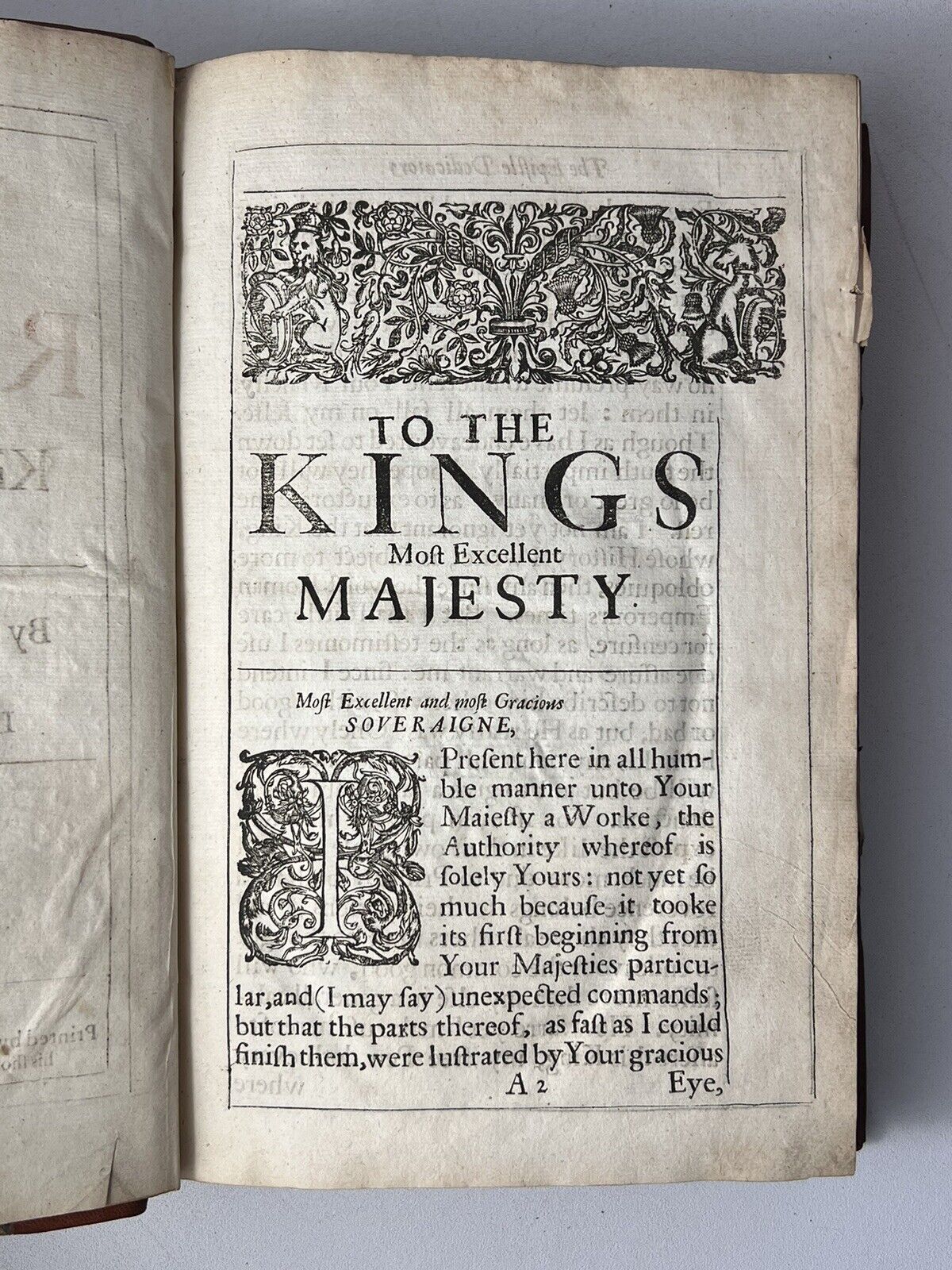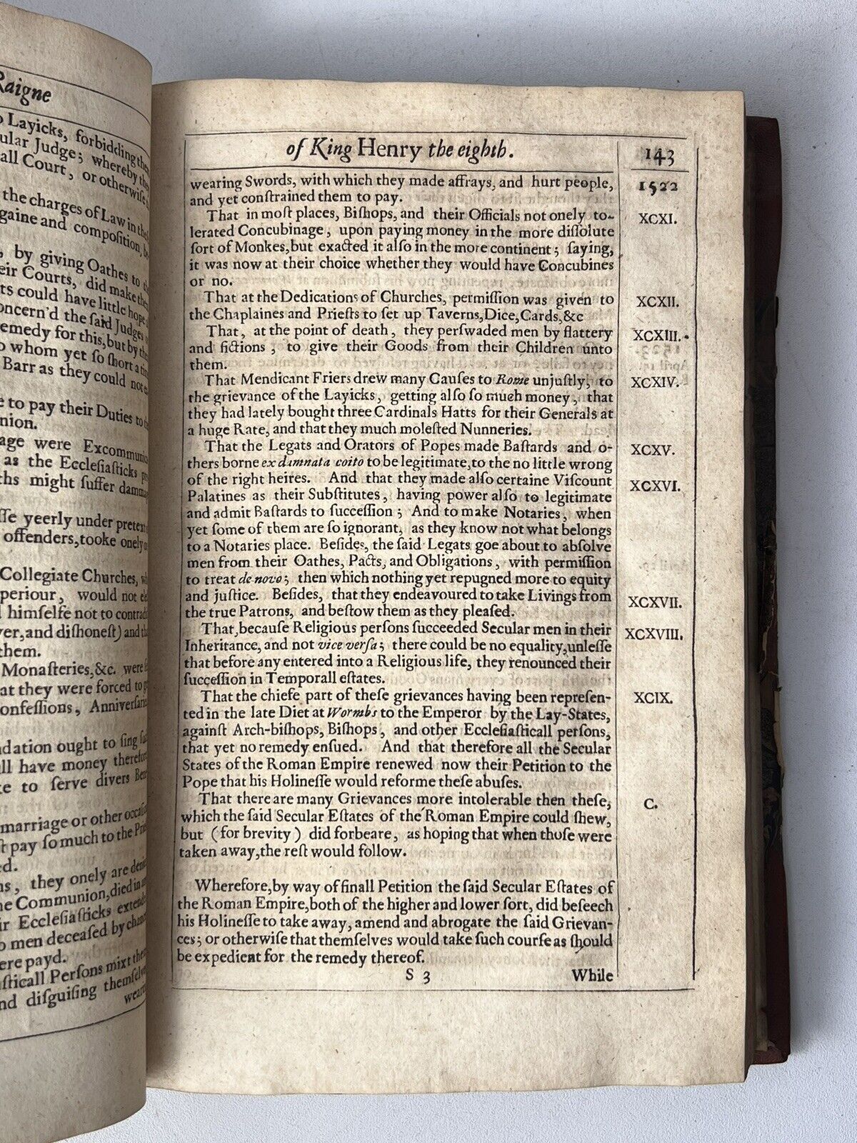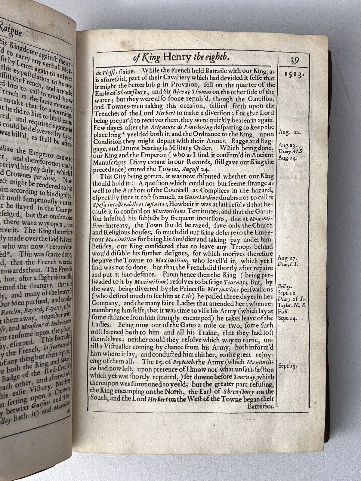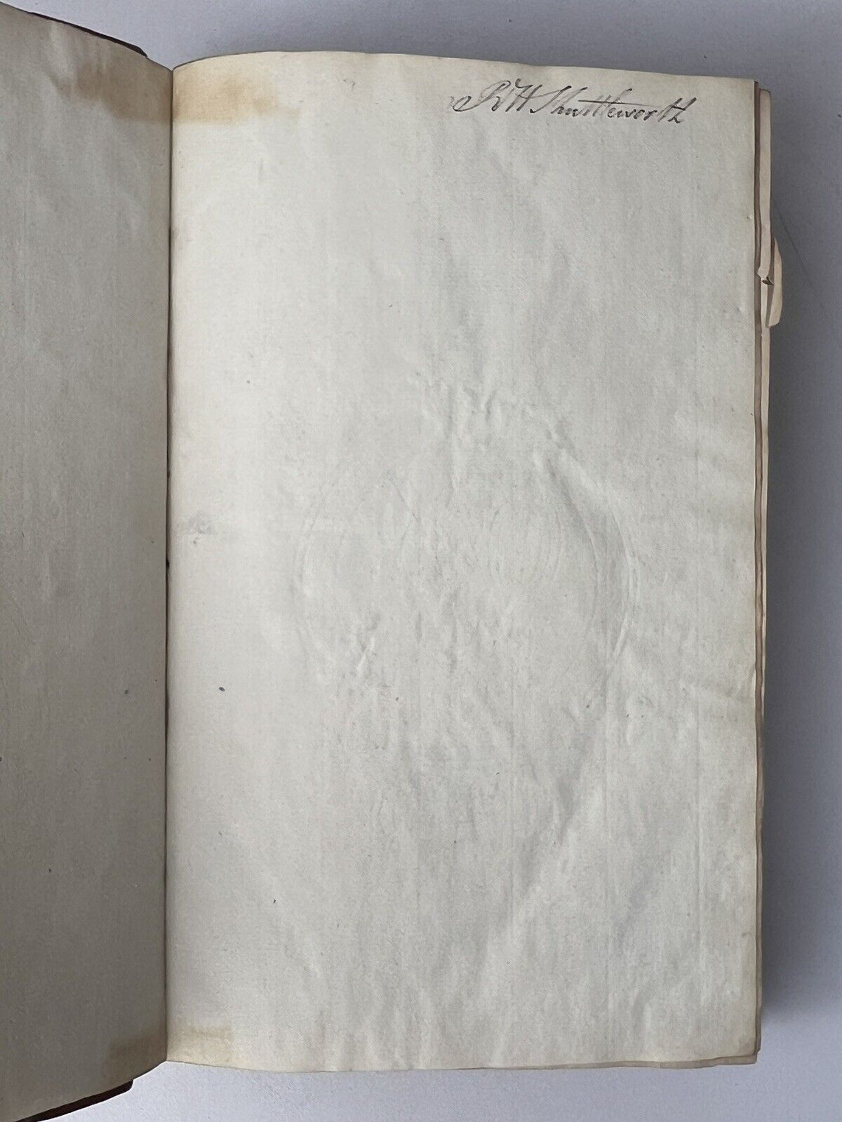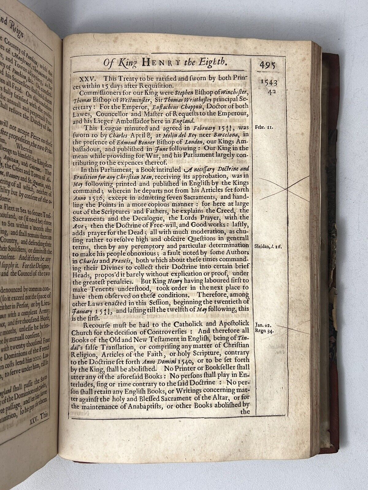 Half morocco over marbled paper backed boards, the front with some earlier leather, probably 18th century. Shows very attractively indeed on the shelf with the spine very lightly rubbed and a little sunned, but generally excellent. Preserving an earlier tooled morocco label in between raised bands with a gilt date of 1649 at the foot. Joints fine with both boards securely attached, with the hinges reinforced with cloth. Shelf and edge wear with some loss to the marbled paper at the edges as typical. Boards a little bowed but the binding is without shelf lean. Without any attached bookplates but with an ink ownership inscription to the head of the ffep of R. H. Shuttleworth and another contemporary ownership inscription to the head of the title page, partially trimmed away at the head, of George Masterson (?). Pasted cutout of Henry VIII. to the verso blank of the title page acting as a frontis, but lacking the original frontis, as often. This cutout could be taken from the original frontis, it matches the original size etc (?). Very clean throughout the text block, indeed internally excellent, just mildly toned throughout, with the odd few early ink marks in the margins throughout, nothing obscuring any text. Collated as complete except for the frontispiece.