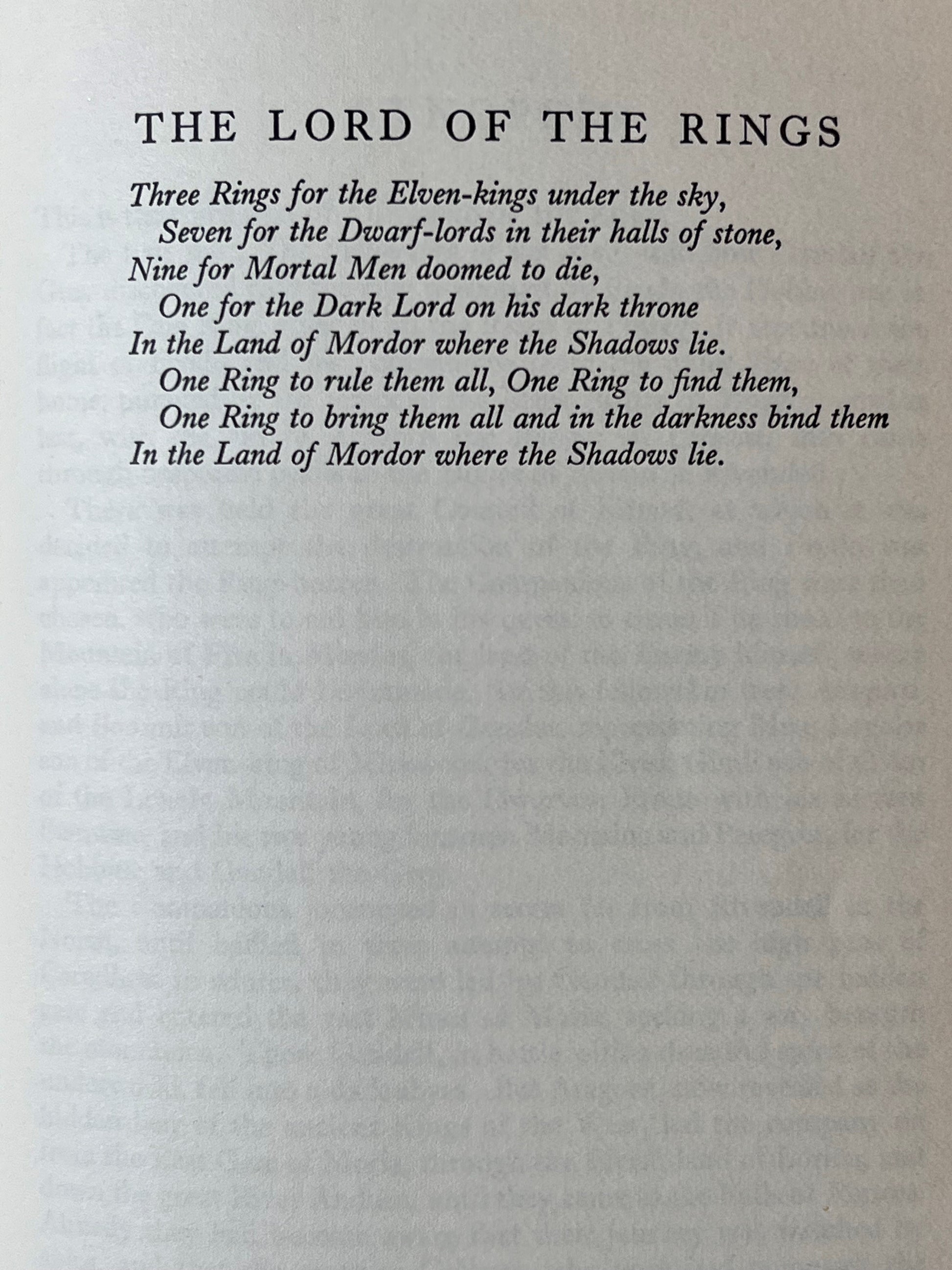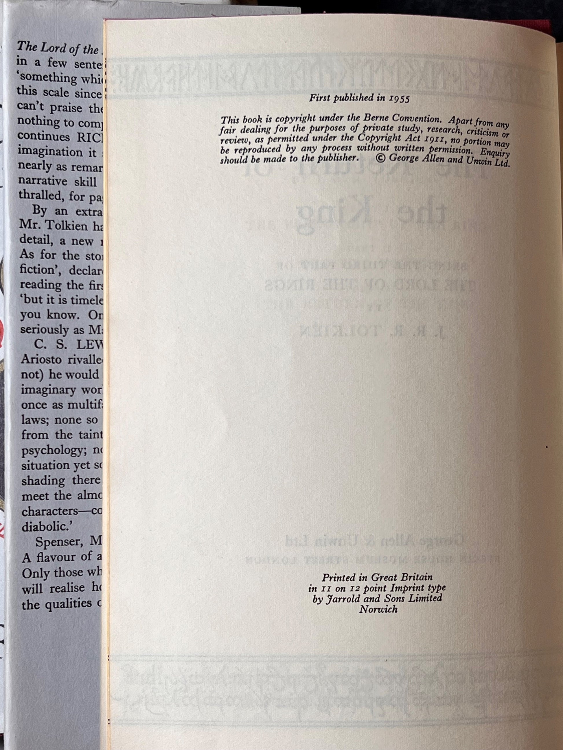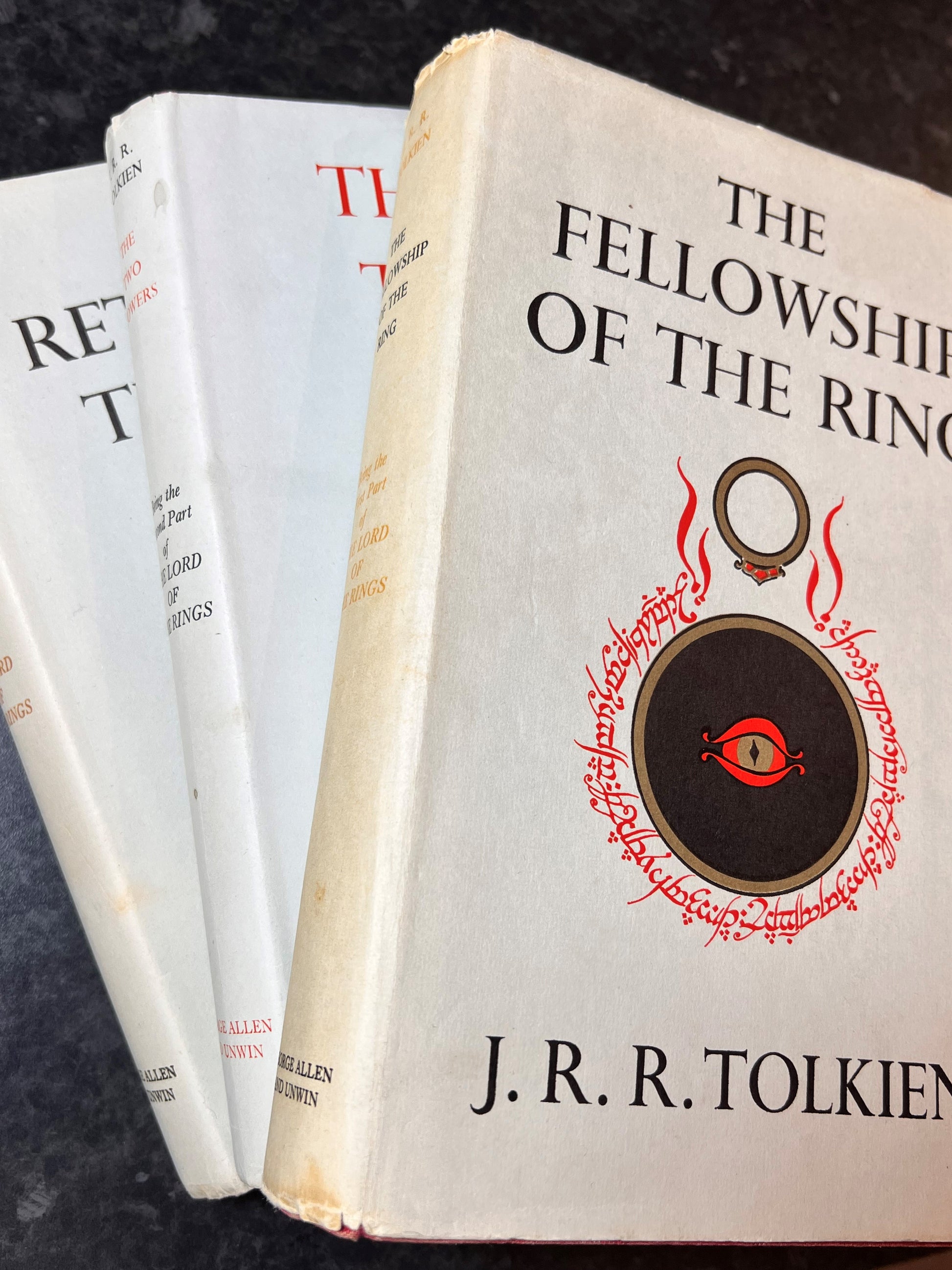 The Lord of the Rings by J.R.R. Tolkien, Comprising The Fellowship of The Ring, The Two Towers, and The Return of the King. Published by George, Allen, and Unwin between 1954 and 1955.