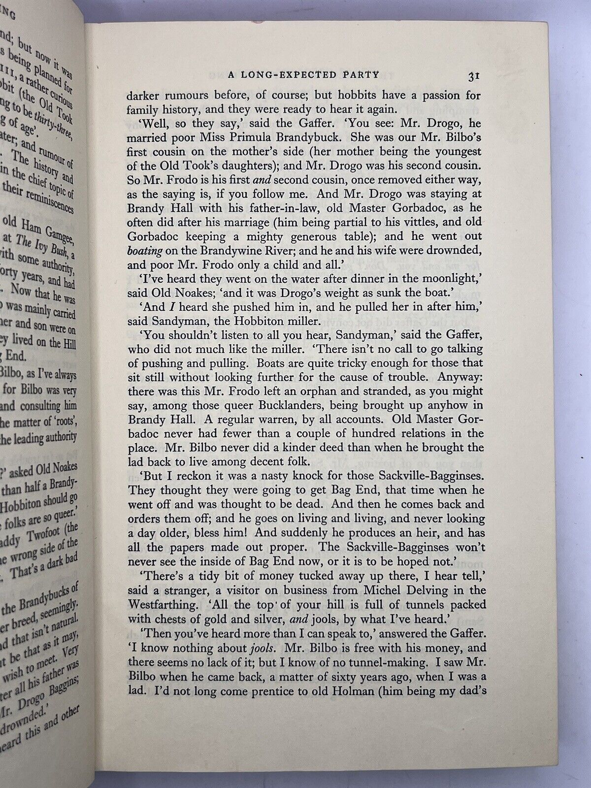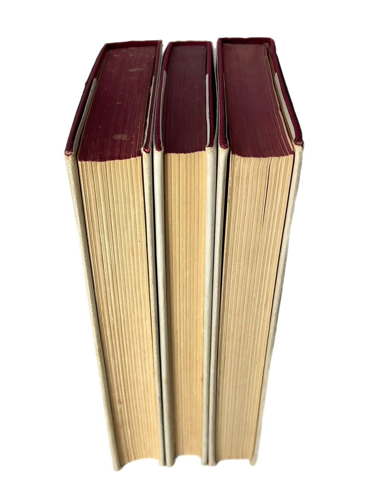 The set is without shelf lean. The binding of FOTR is slightly cocked but structurally very secure, as are all three volumes. All three bindings near fine to fine, indeed externally excellent. Some extremely minor shelf/edge wear else one of the best examples one might encounter. Some light stains to top page edge of FOTR and extremely minorly to The Two Towers, else page edges very good. Some offsetting to ffep and rfep of each volume, presumably of tape from now removed protective sleeves for the dust jackets. Map slightly folded at the edge in the Two Towers, perhaps as published (?), else each volume is internally very fine through the text blocks with the maps similarly very fine. Internally excellent. Each volume collates as complete with no missing pages and each volume retains the original foldout map.