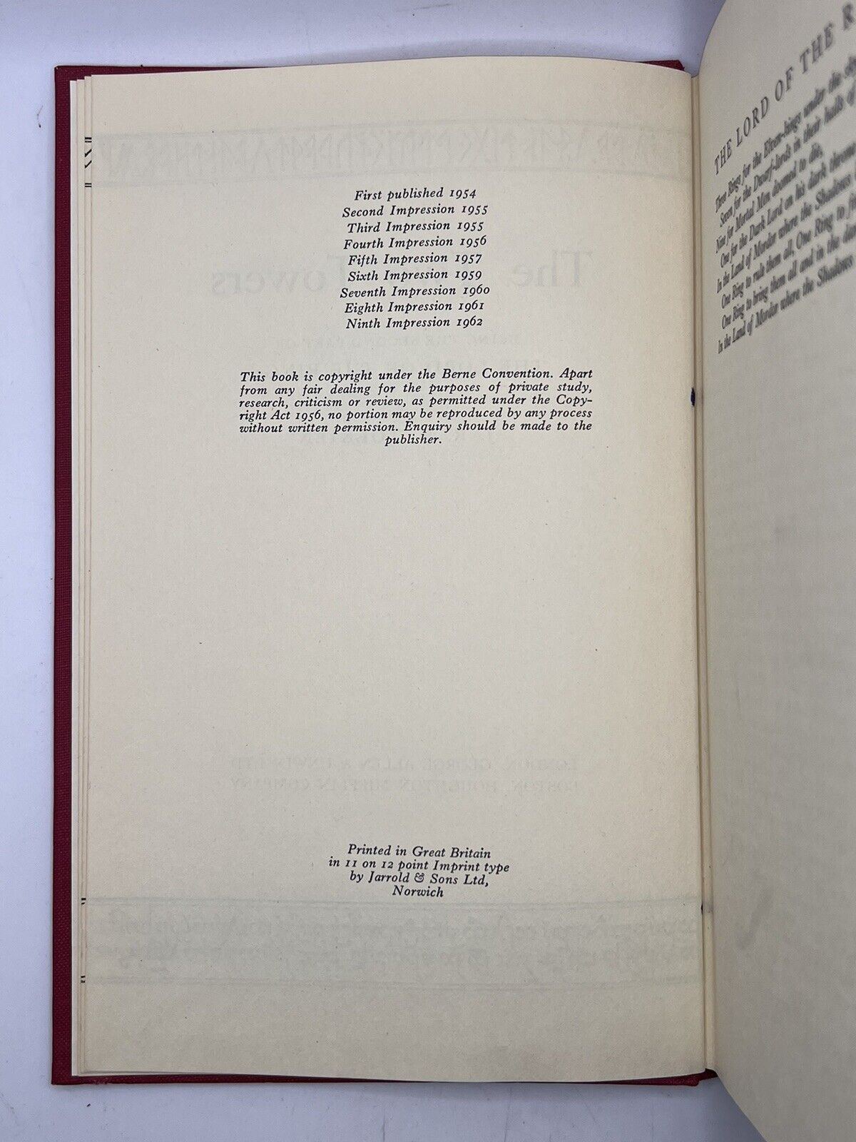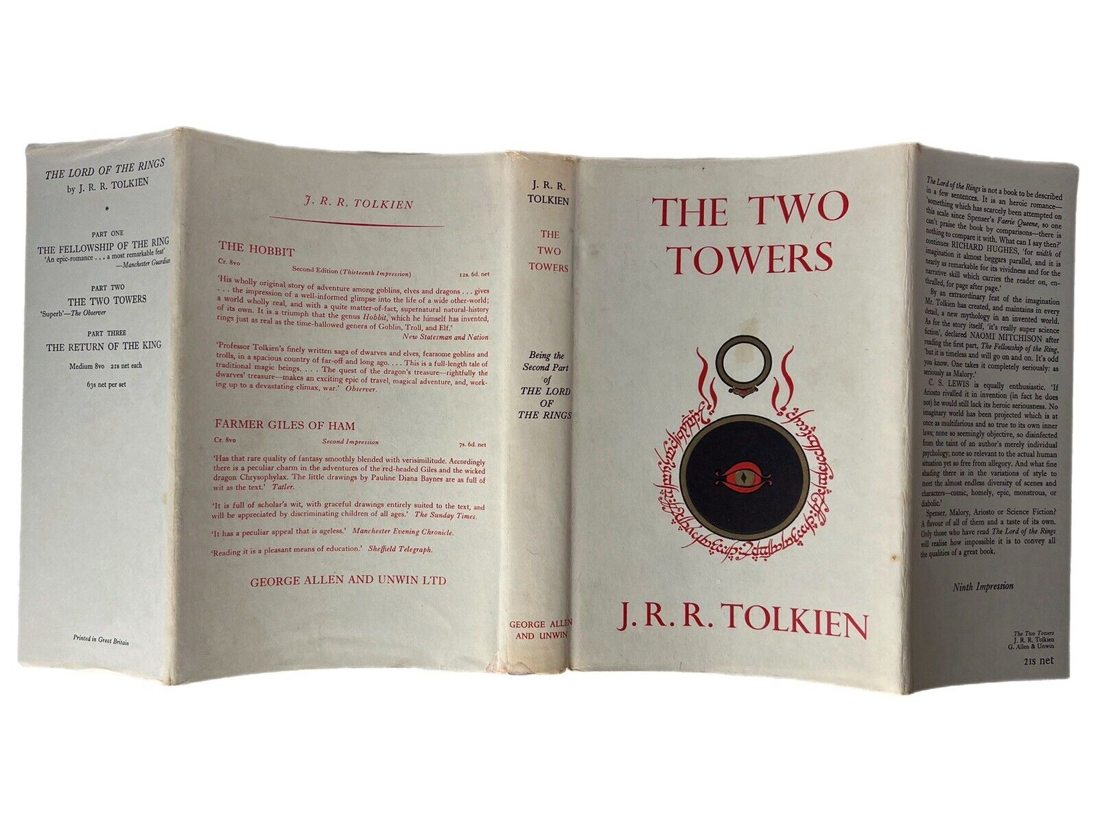 The Fellowship of the Ring is the twelfth impression from 1962 in its original dust jacket, The Two Towers is a ninth impression from 1962 in its original dust jacket, and The Return of the King is a ninth impression from 1962 in its original dust jacket. A rare set presumably all originally purchased at the same time and kept together since then. A beautiful set of the first edition of Tolkien's masterpiece with the dust jackets in remarkably bright original condition.