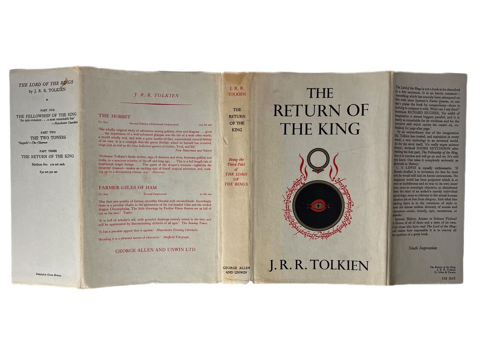 The spine panels of the dust jackets are remarkably bright, significantly better than typical examples. There is some toning at the extremities, most to the Return of the King at the top of the spine. Some minor wear at the extremities including a small amount of loss at the foot of The Fellowship of the Ring's dust jacket spine panel. The joints for each panel of each dust jacket are secure with the dust jackets all structurally secure. Dust jackets a little toned with the odd small areas of discolouration, but again remain significantly better than typically encountered. A small circular stain to the front panel of The Fellowship of the Ring dust jacket where the title is, this is faint and not particularly intrusive. Verso of each dust jacket near fine or better, generally without fault.