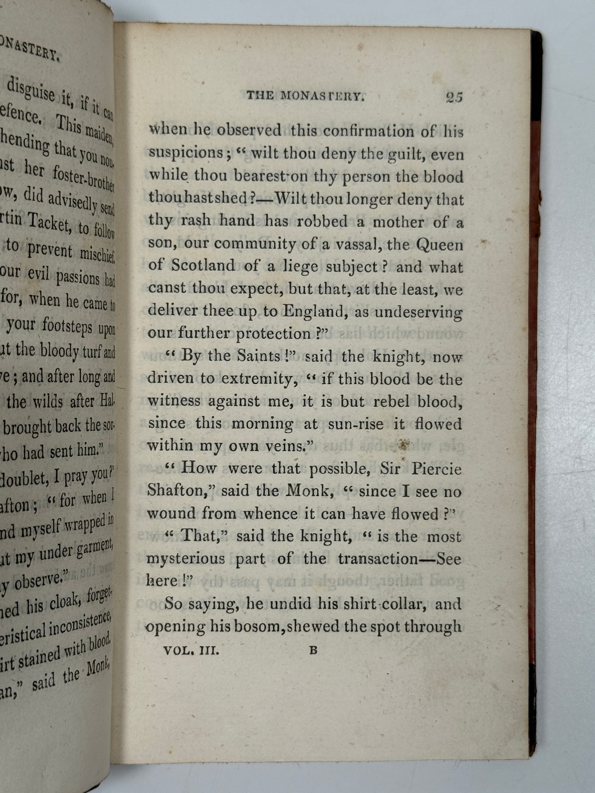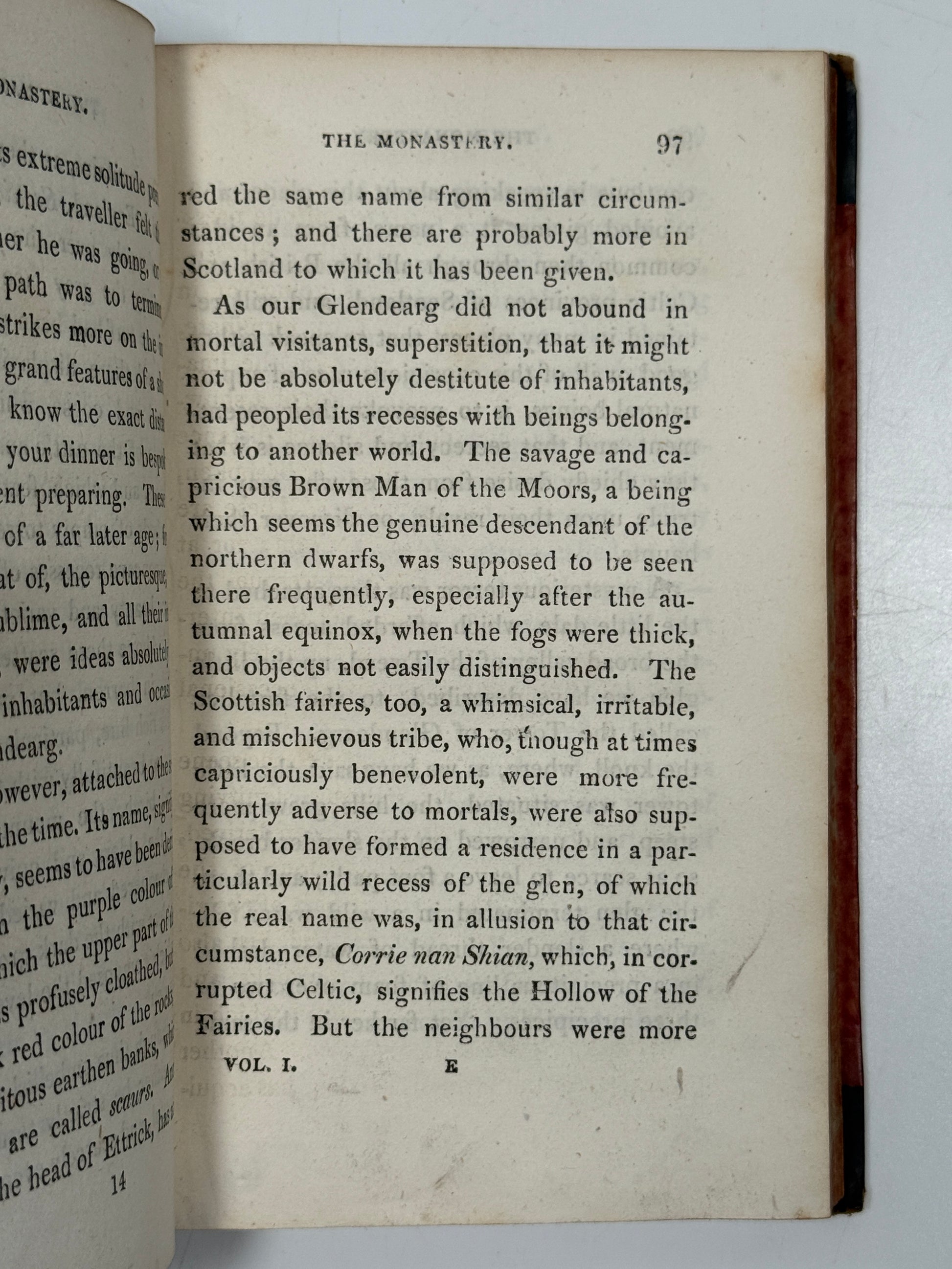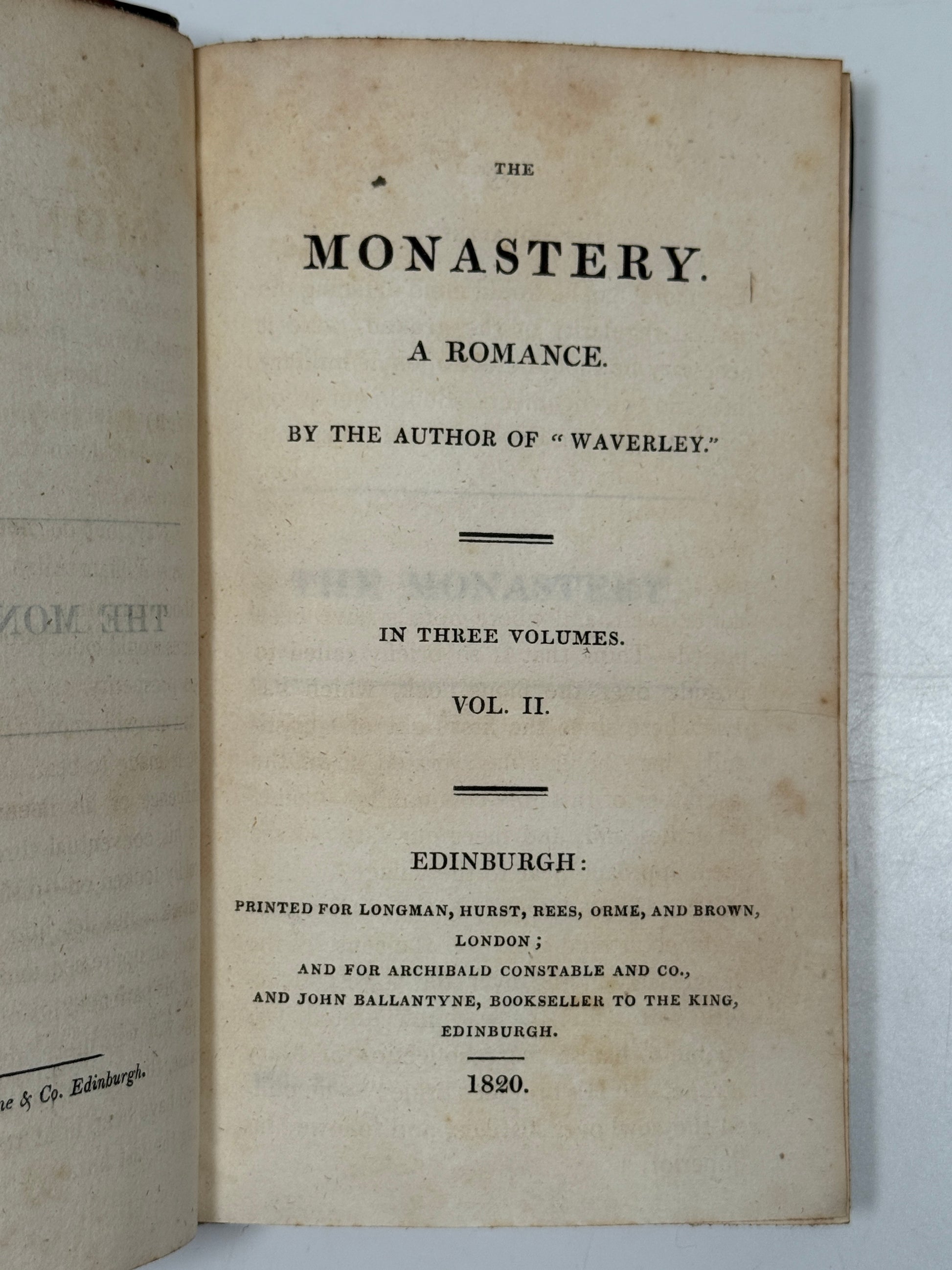 The Monastery. A Romance. By the Author of "Waverley." [Walter Scott]. In Three Volumes. Edinburgh: Printed for Longman, Hurst, Rees, Orme, and Brown, London; and for Archibald Constable and Co., and John Ballantyne, Bookseller to the King, Edinburgh. 1820.