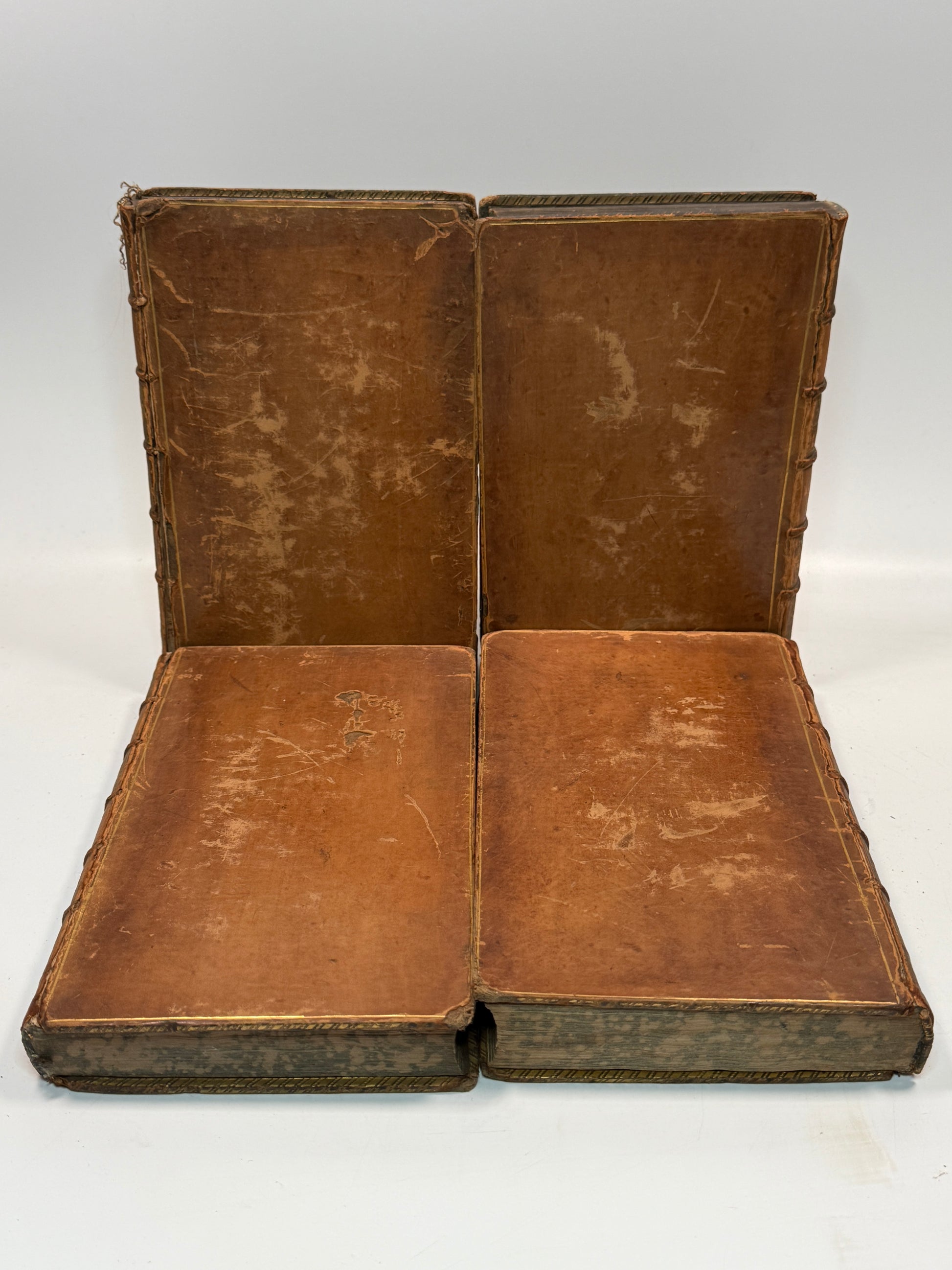 Full calf bindings with decorative gilt in compartments to the spines. Tooled labels lacking. Bindings rubbed and scuffed with some scratches. Most boards attached, joints and hinges starting or cracked, thus fragile, front board of volume one detached. Some headcaps and tailcoats lacking, some present headcaps and tailcaps are worn. Shelf and edge wear. Marbled page edges dulled. Armorial bookplate and pencil inscriptions to front blanks in all volumes. Text blocks lightly toned with occasional foxing. Uncollated. Volume two half title and title page partially detached, remaining attached at the top. Volume three lacks title leaf. Volumes one through to nine only, of ten, lacking the final volume.