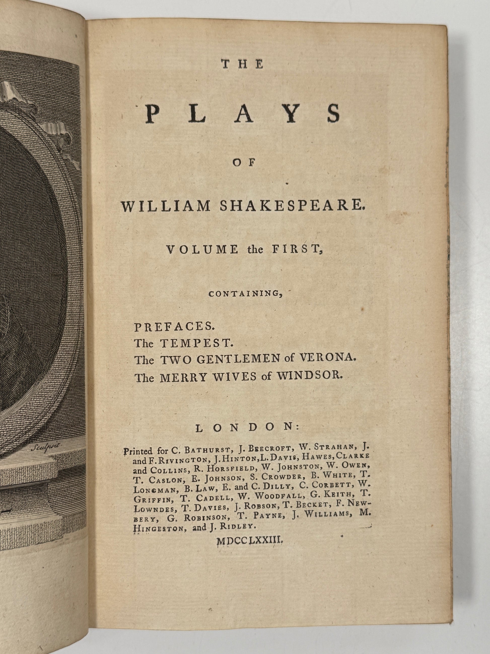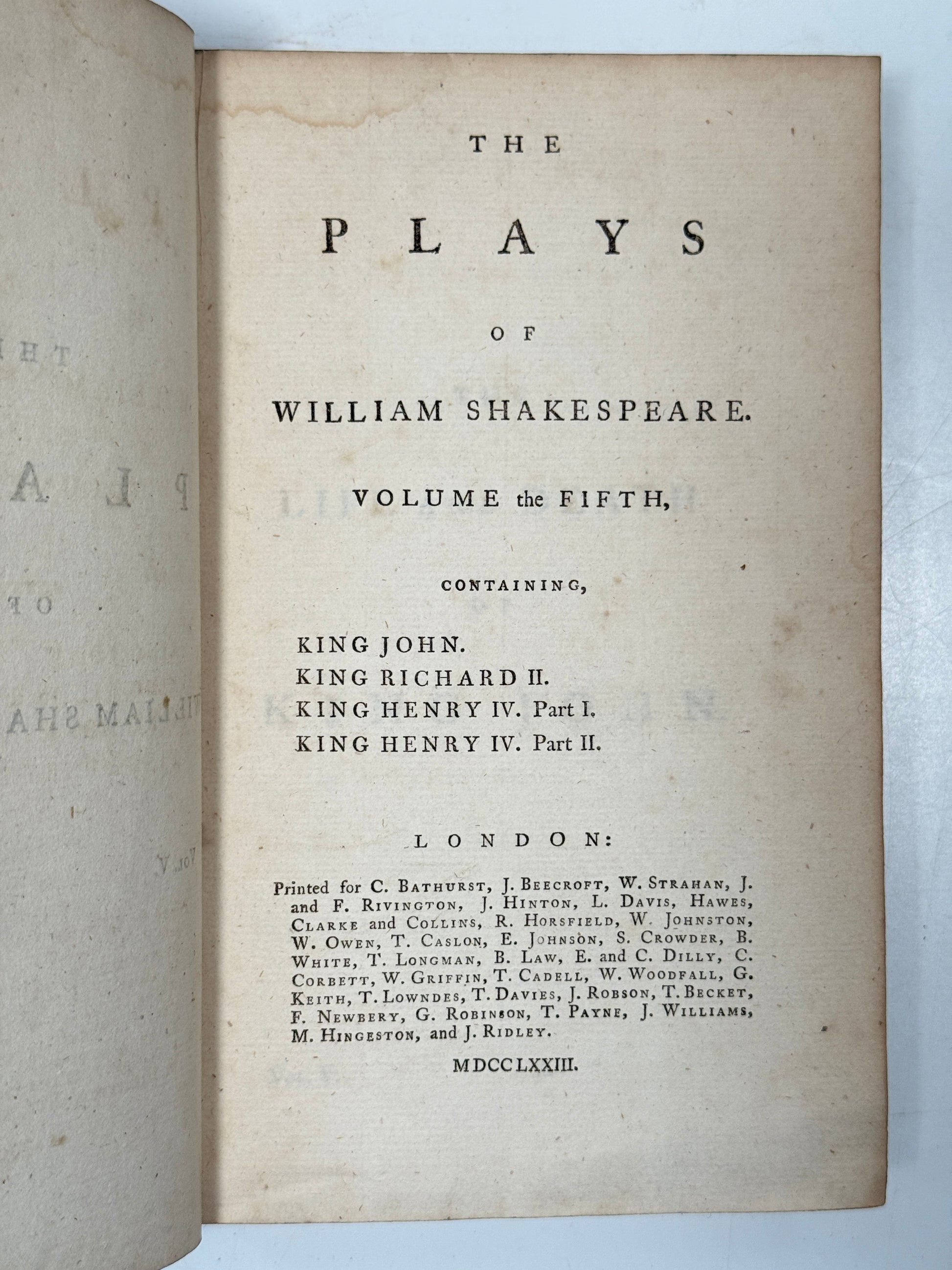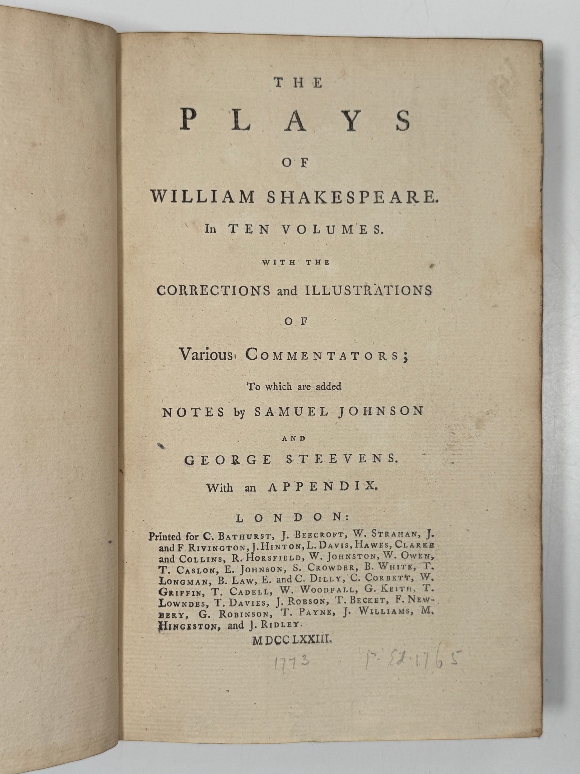 The Plays of William Shakespeare. In Ten Volumes [without the tenth volume]. With the Corrections and Illustrations of Various Commentators; to Which is Added Notes by Samuel Johnson and George Steevens. With an Appendix. London: Printed for C. Bathurst, et al., MDCCLXXIII (1773).