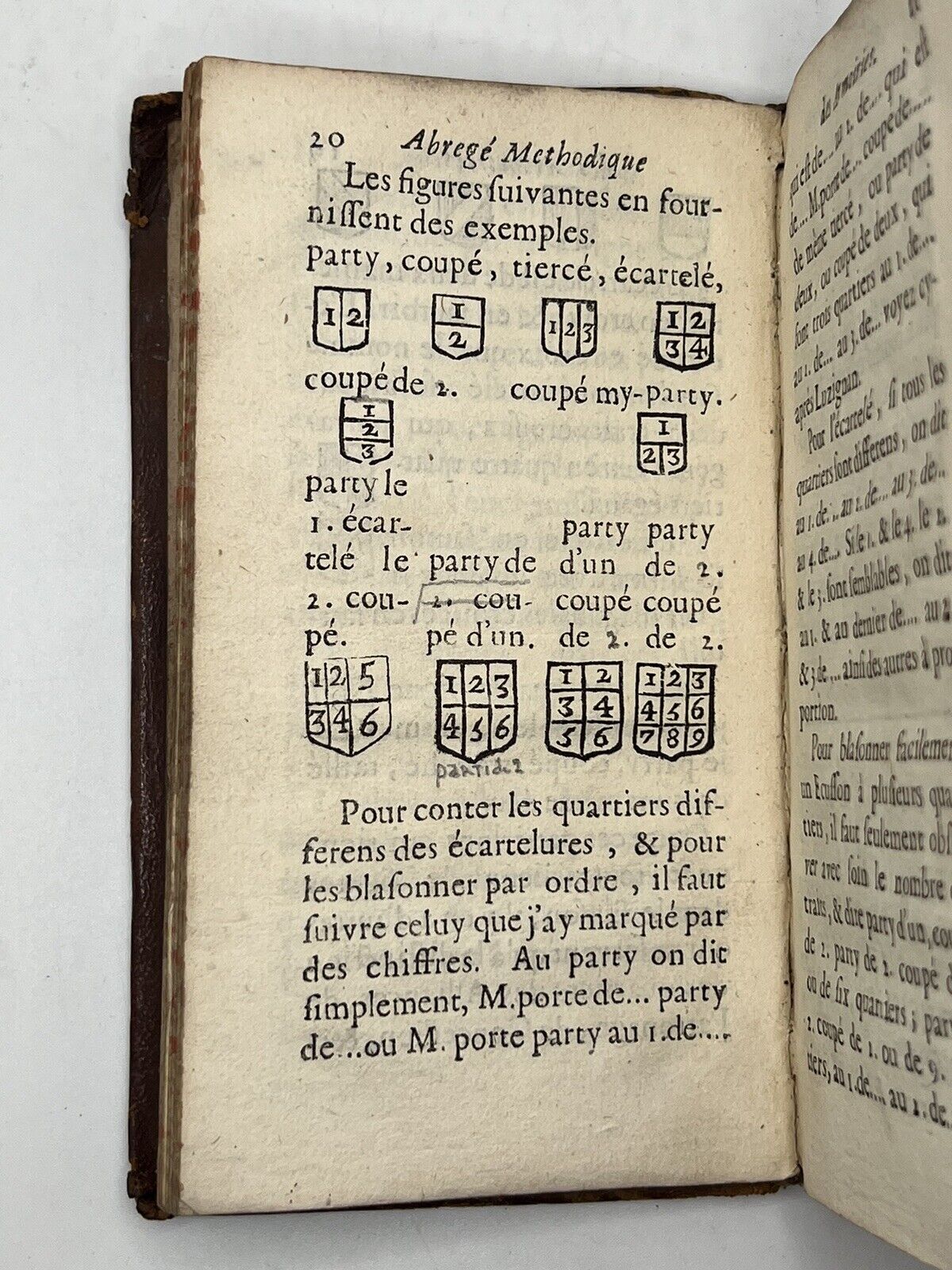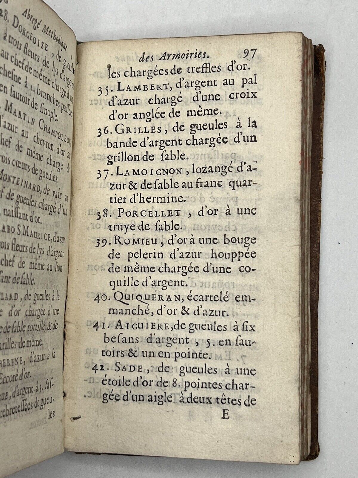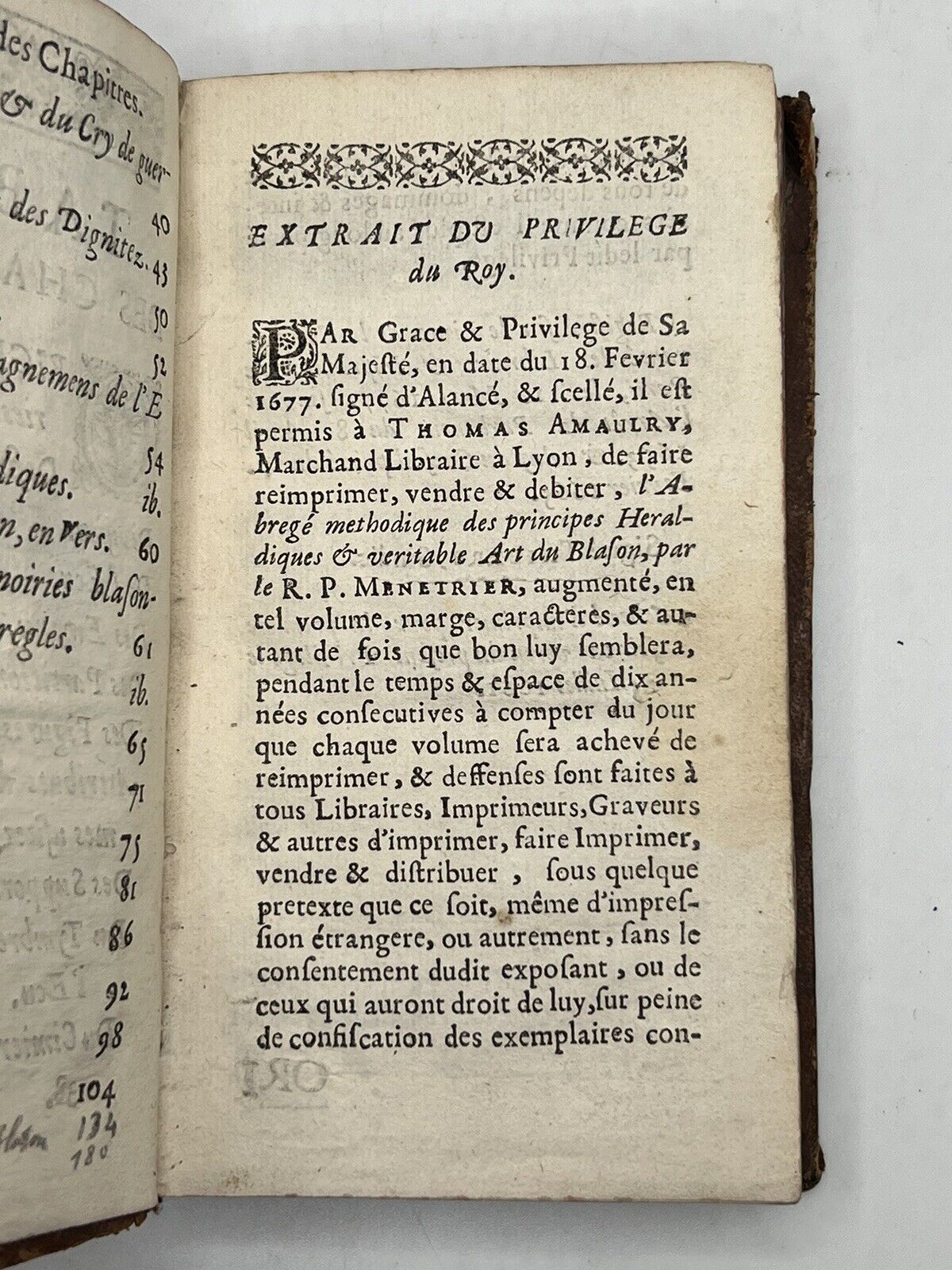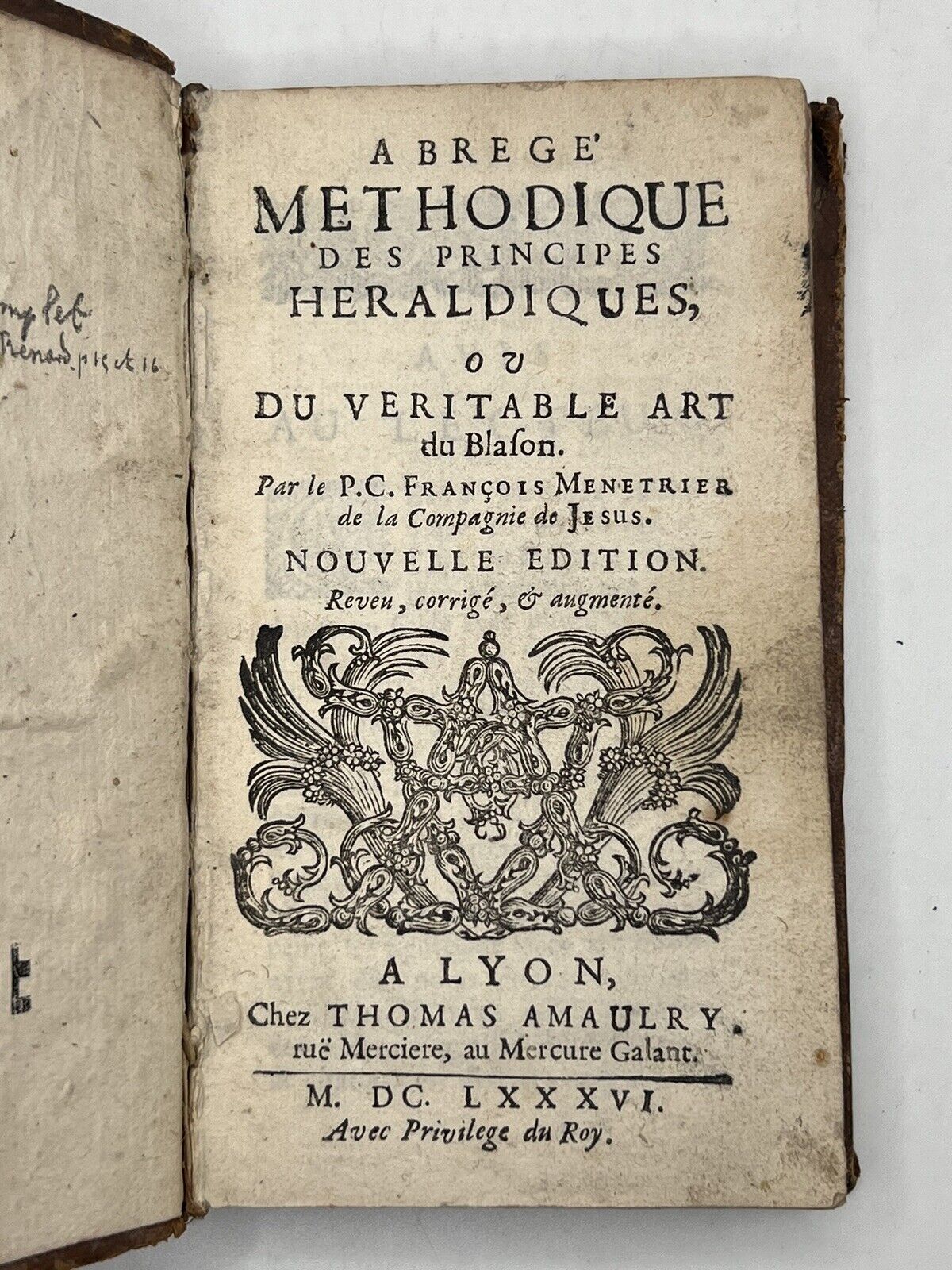 Abrege Methodique des Principes Heraldiques, ou du Veritable art du Blason. Par le P.C. Francois Menetrier de la Campagnie de Jesus. Nouvelle Edition. A Lyon, chez Thomas Amaulry, 1686.