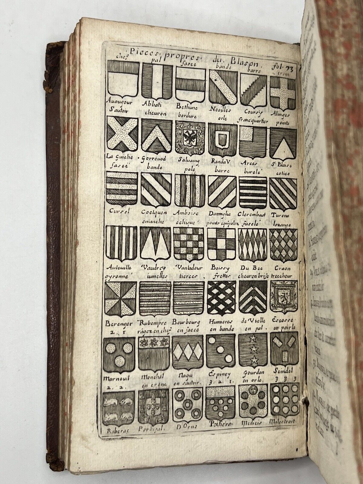 Contemporary full calf, spine finely tooled in gilt between raised bands. Binding rubbed with a little loss in places with the leather of the backstrip slightly raised in places. Joints rubbed but with both boards securely attached, the binding secure, and without shelf lean. Page edges a little non-uniform, without any gatherings detached or partially detached; this seems to stem from the page block being originally misbound. Corners bumped with a little loss as often. Lacks frontispiece, as often, and front blank, else collates as complete. Small bookseller sticker to foot of front pastedown with some ink and pencil inscriptions to pastedowns and rear blank. Text block mildly toned, free of foxing or dampstaining, but with a little marginal worming to the last few gatherings, text without loss of sense. Page block slightly split in the gutter of the verso of pp.73. Stain to verso of final blank. A lovely heraldry book with incredible engraved plates.