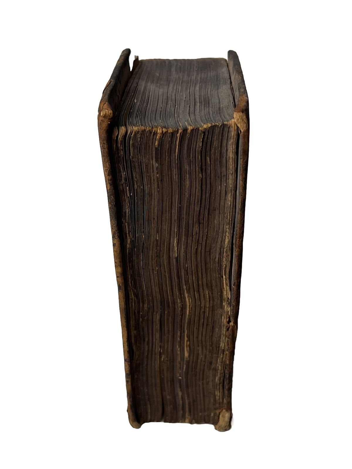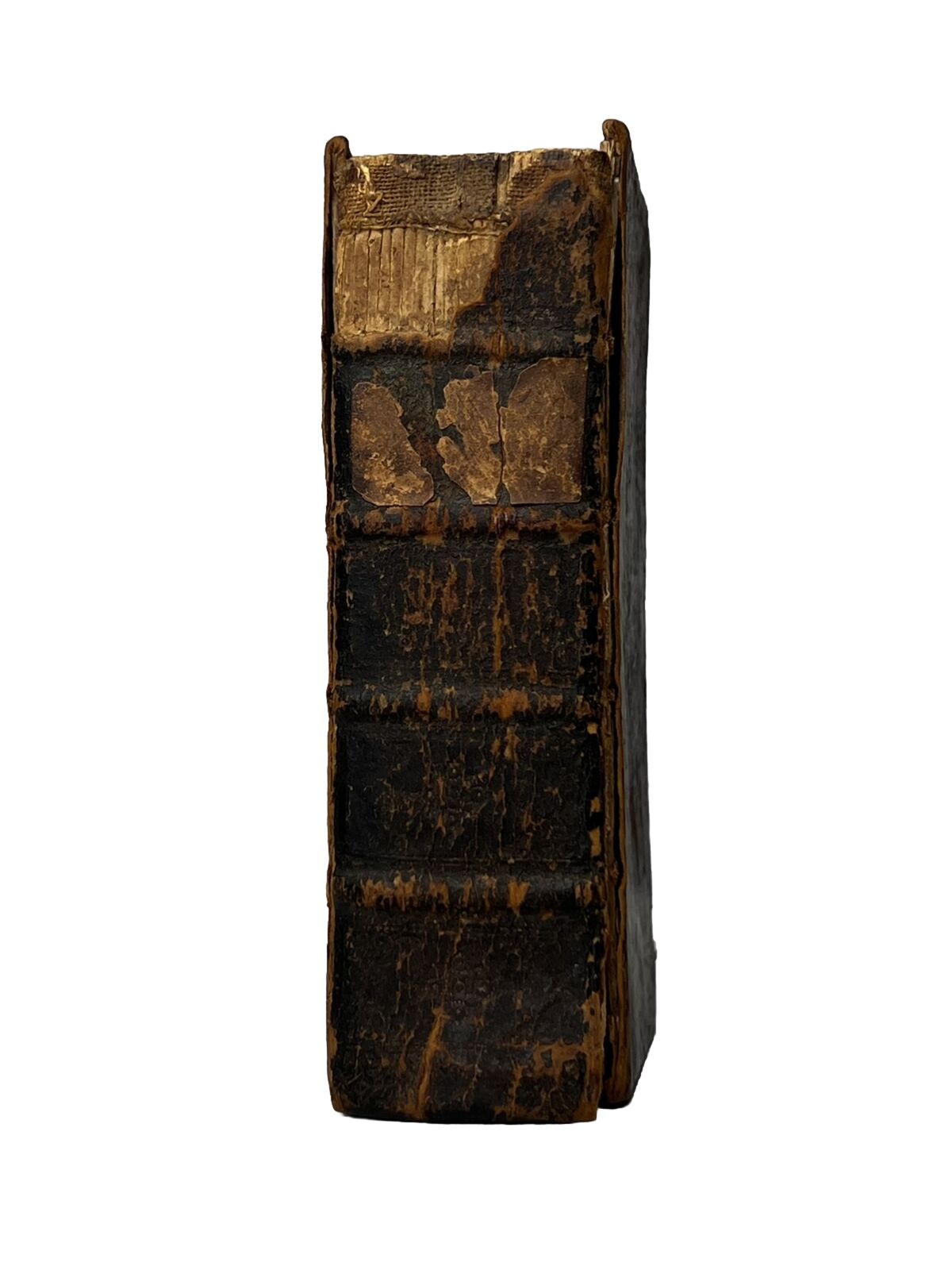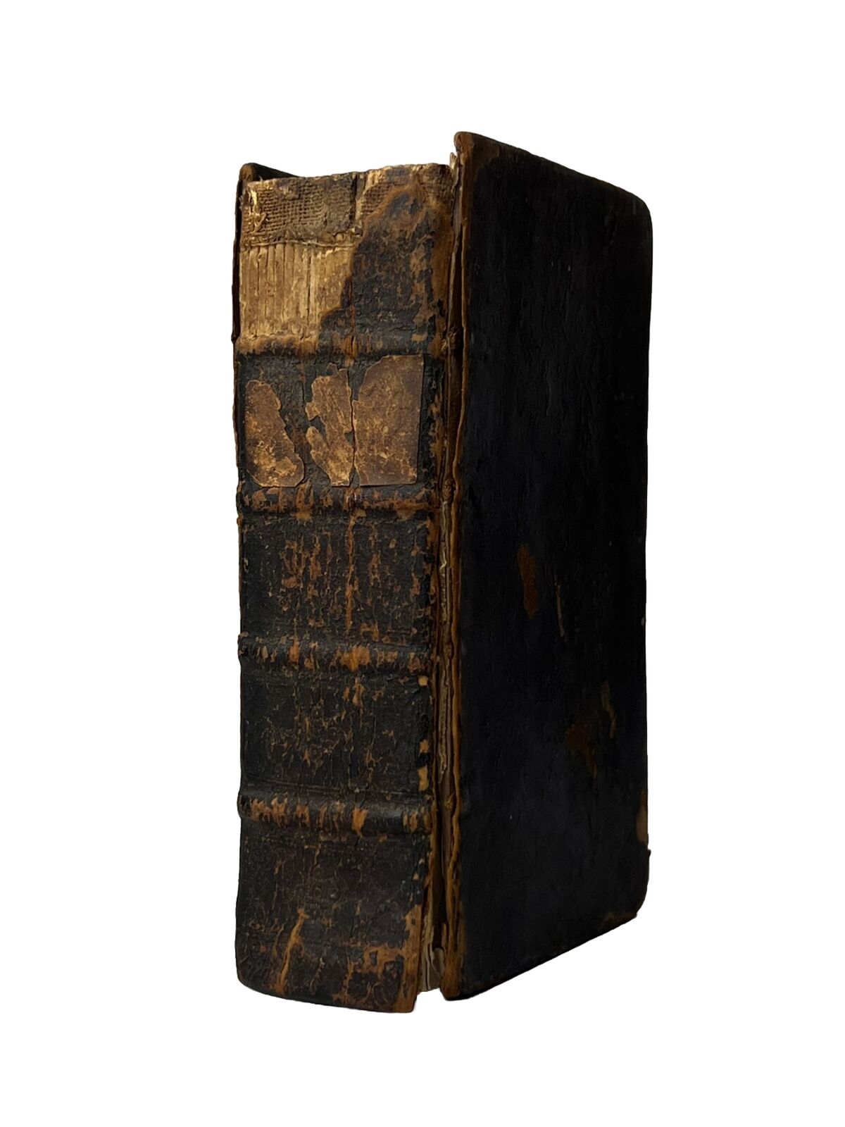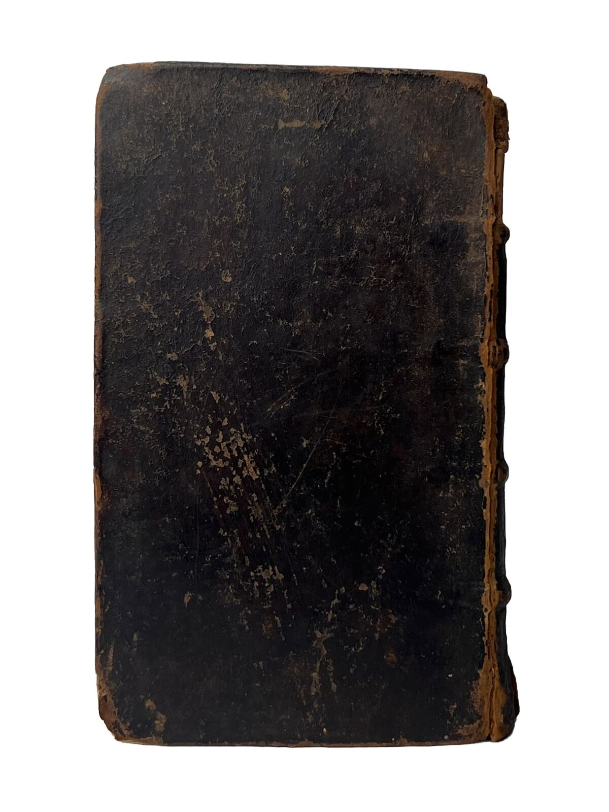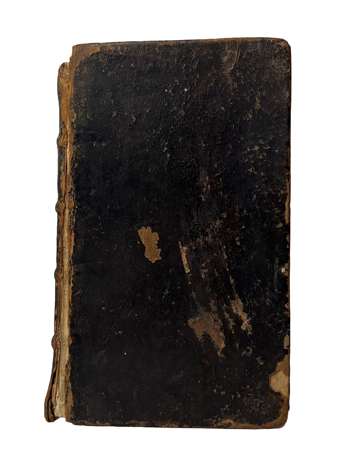 Probably original or very near contemporary full leather binding, rubbed and worn with joints cracked and front board detached. Some loss at the head of the spine with a identification label to the spine fragmented and thus currently illegible. The leather at the edge of the detached board is already raised and so would be fairly easy for a bookbinder to reattach/reback. Edge toning to endpapers as commensurate with the calf binding. Text block toned throughout but generally very clean without any loss to the text. Collated as complete including the lovely illustration frontispiece. Early ink ownership initials to head of frontis reading 'RB' thus otherwise unidentified.