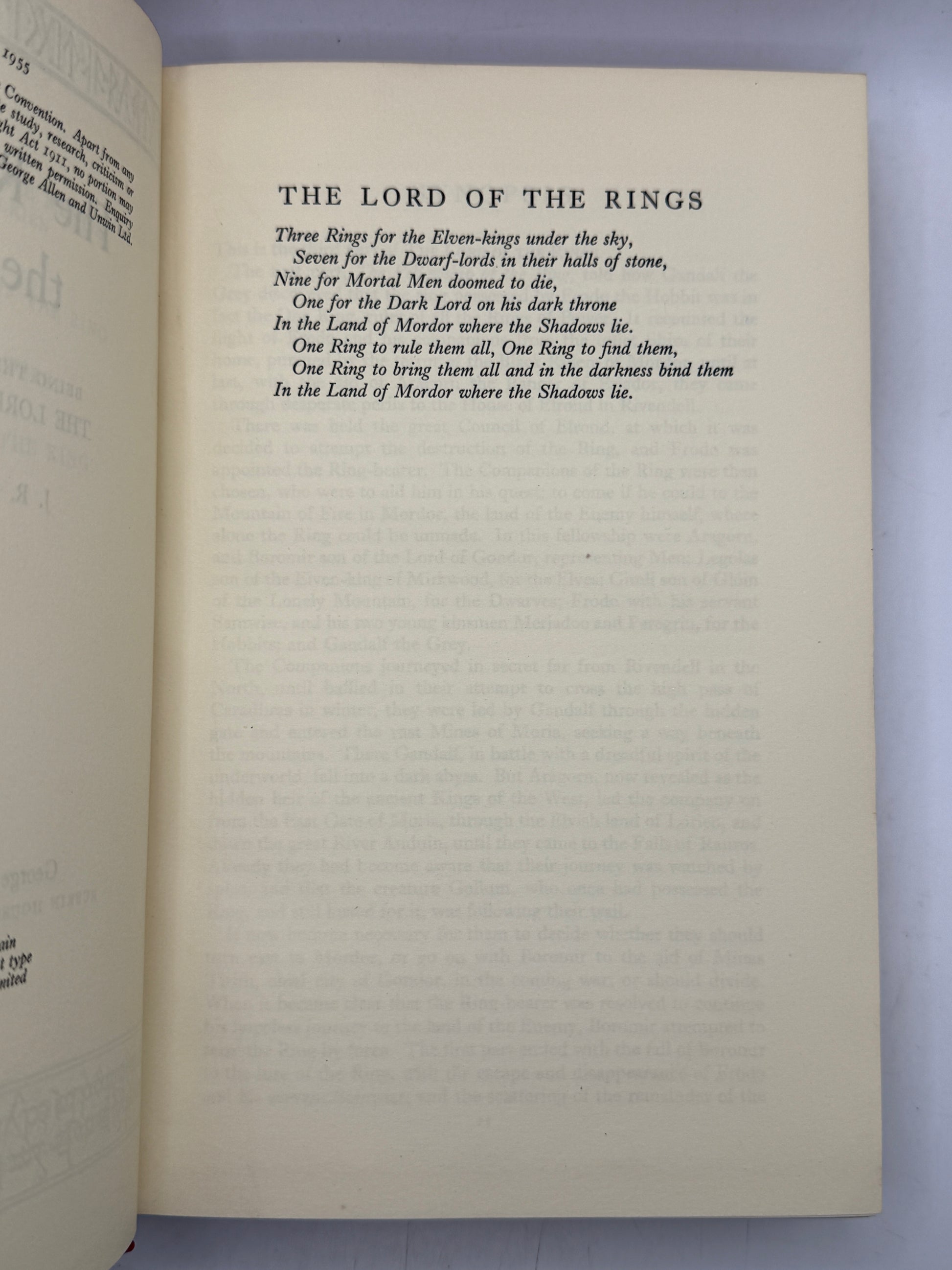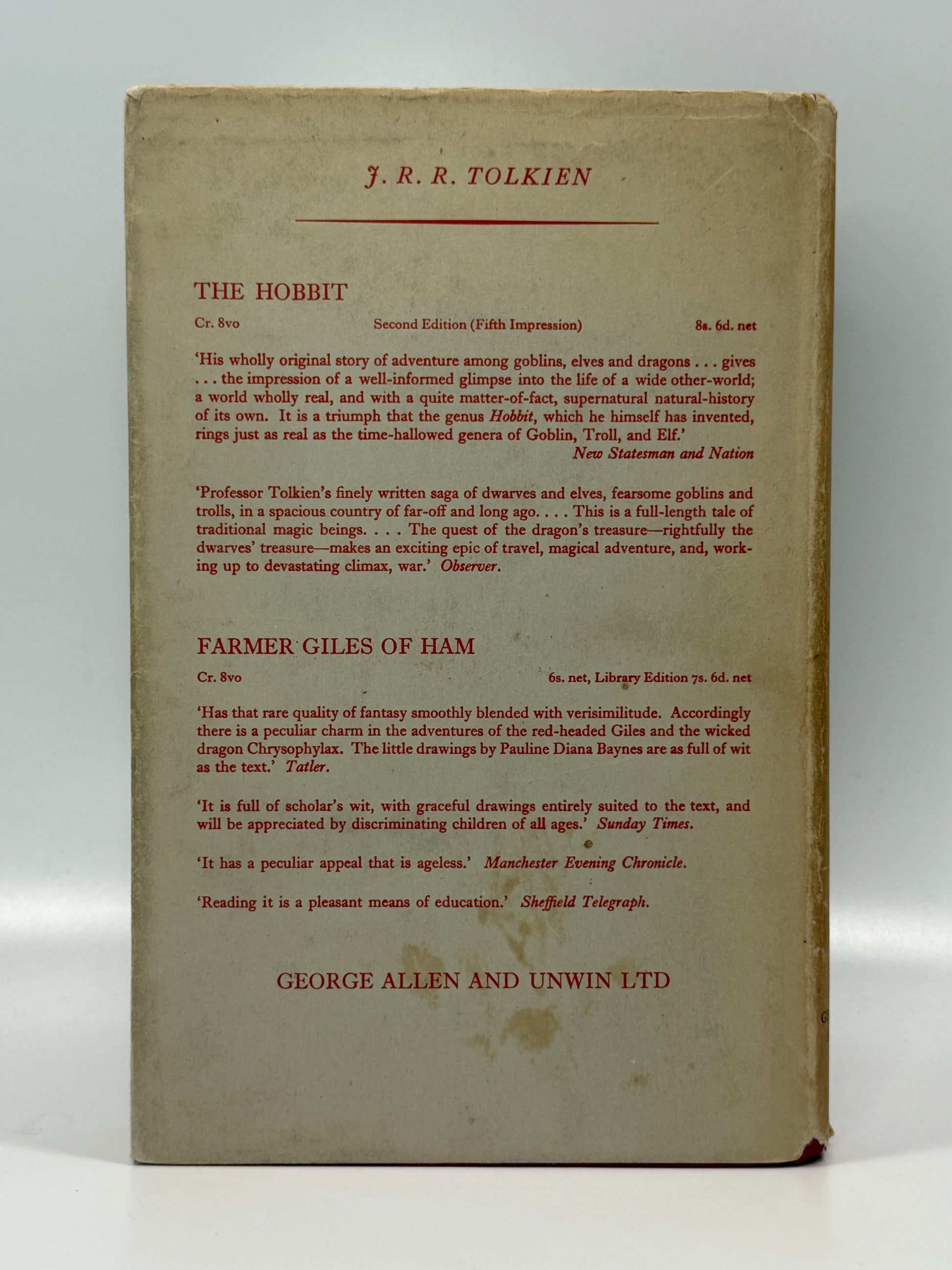A beautiful first state copy, the dust jacket is a true example of the first impression without reviews to the rear flap. This example has the signature '4' on pp.49 with the closed gap and "Men" on pp.281. First state dust jacket with the three titles for the The Lord of the Rings without the reviews printed below. The first state dust jacket is notably scarce.