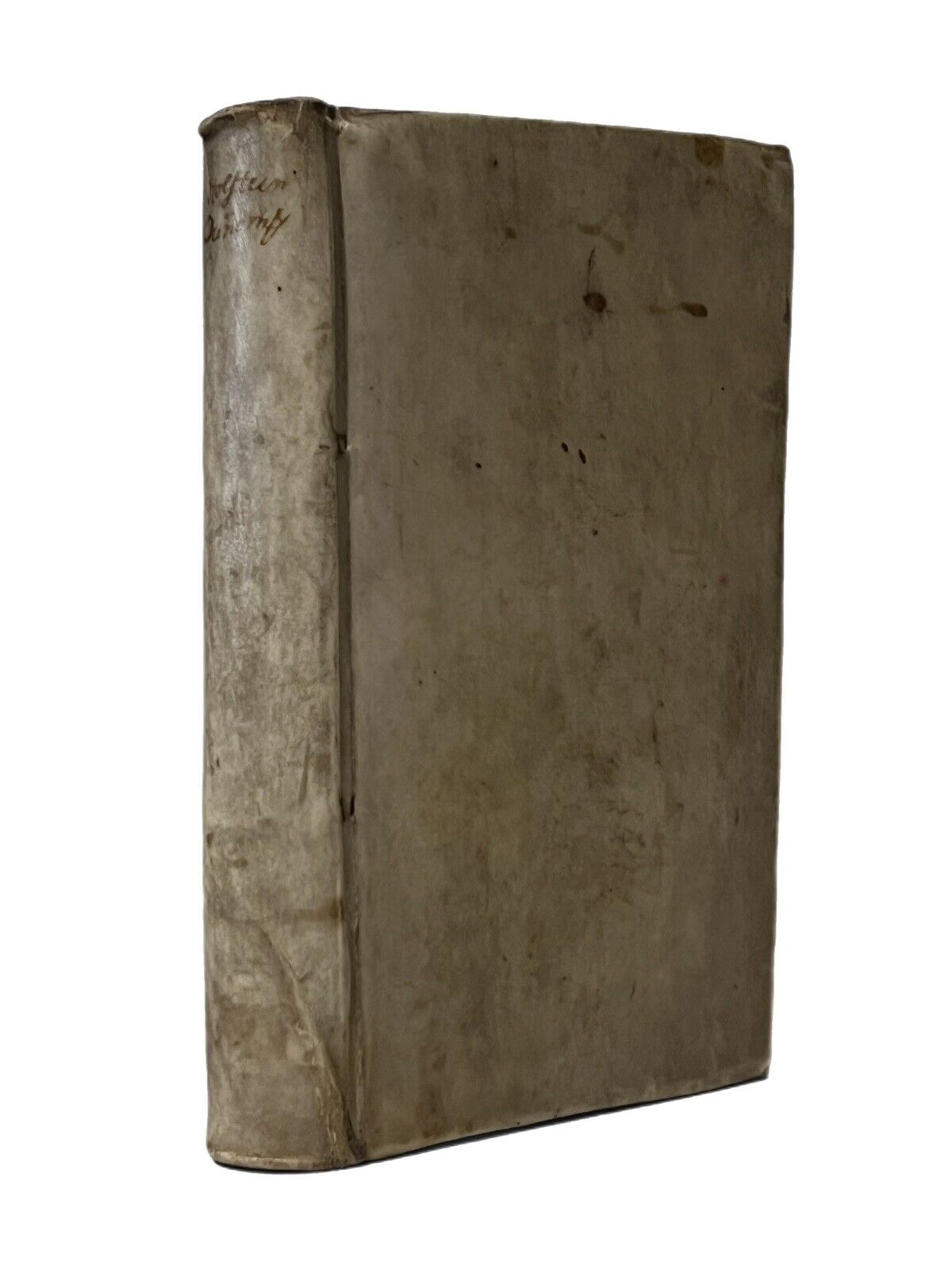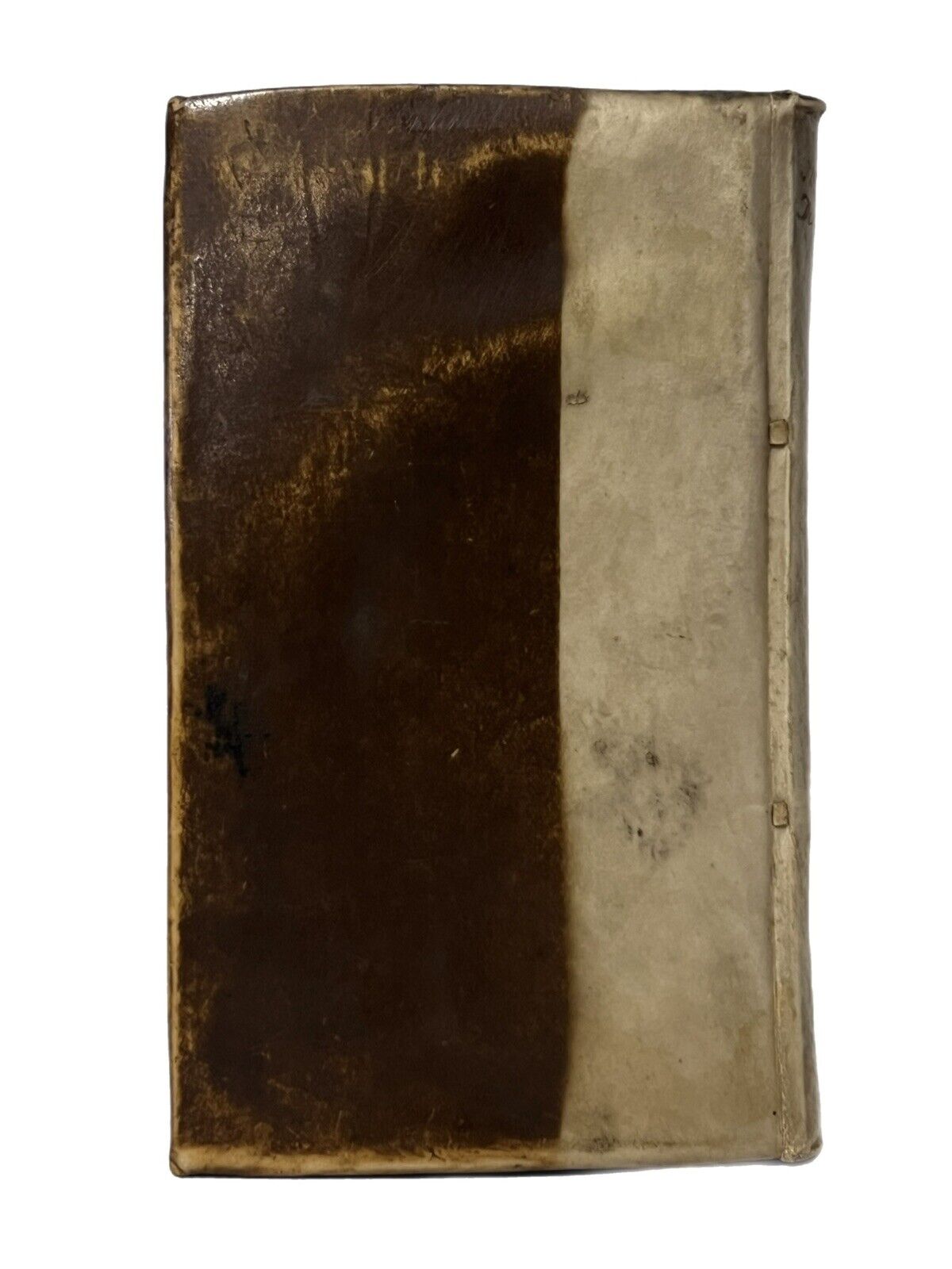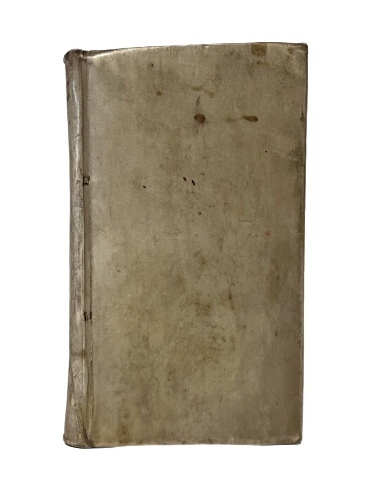 Full vellum with ink title to the head of the spine. Binding rubbed and scuffed with some marks, and with a prominent discolouration to the rear board. Both boards securely attached with minor wear to joints and hinges. Boards slightly warped. Shelf and edge wear. Red page edges somewhat dulled. Attached bookplate to front pastedown. Ink inscription to the front blank, the second title page and the half title. Text block fairly clean with light toning, occasional foxing, and occasional damp staining. Very small wormholing to the rear pastedown. White piece of paper attached to the rear pastedown. Very small edge tear to A4 of the third text, after the half title, as well as A3 bound with a crease.