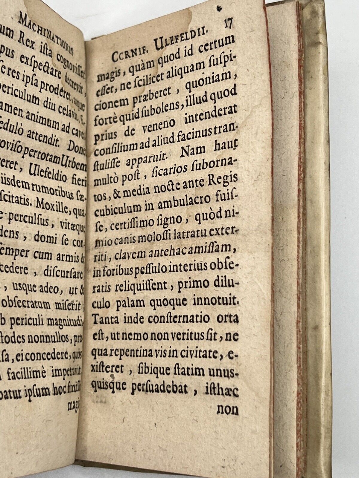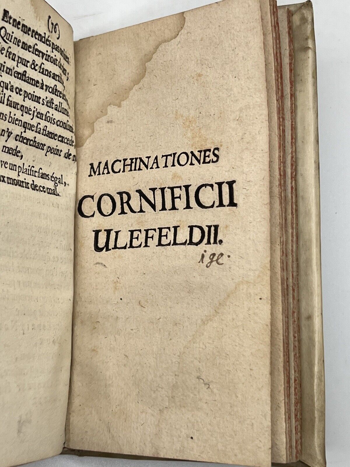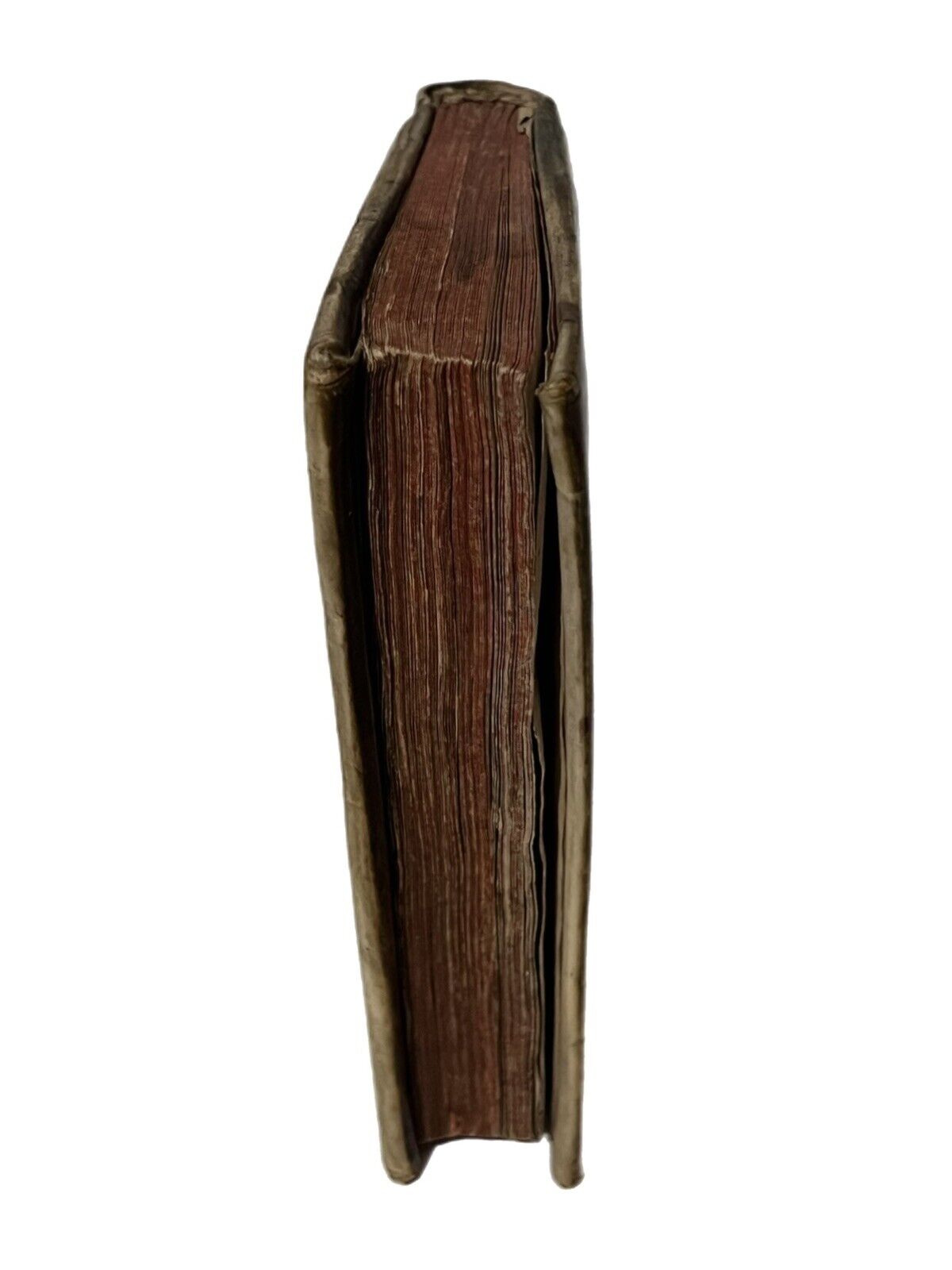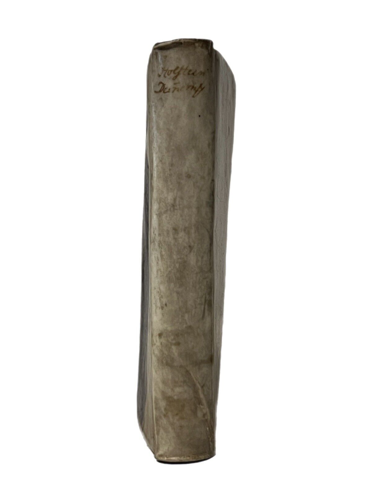 Full vellum with ink title to the head of the spine. Binding rubbed and scuffed with some marks, and with a prominent discolouration to the rear board. Both boards securely attached with minor wear to joints and hinges. Boards slightly warped. Shelf and edge wear. Red page edges somewhat dulled. Attached bookplate to front pastedown. Ink inscription to the front blank, the second title page and the half title. Text block fairly clean with light toning, occasional foxing, and occasional damp staining. Very small wormholing to the rear pastedown. White piece of paper attached to the rear pastedown. Very small edge tear to A4 of the third text, after the half title, as well as A3 bound with a crease.