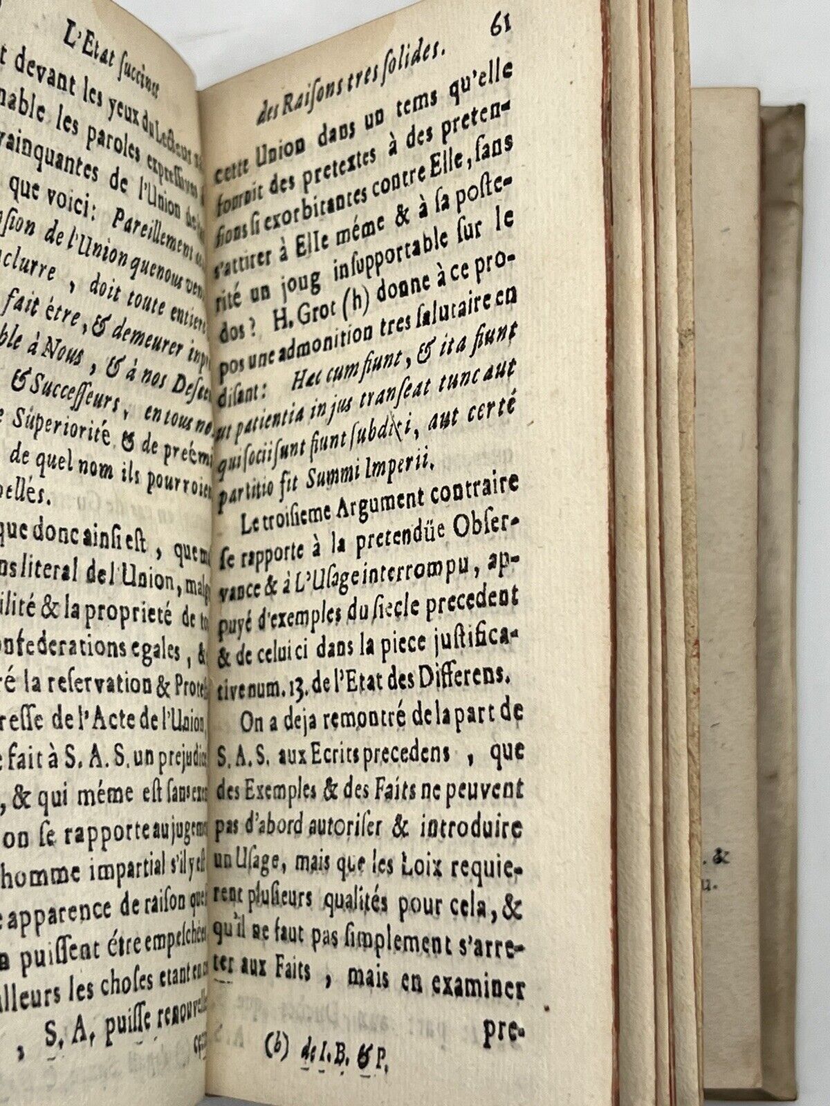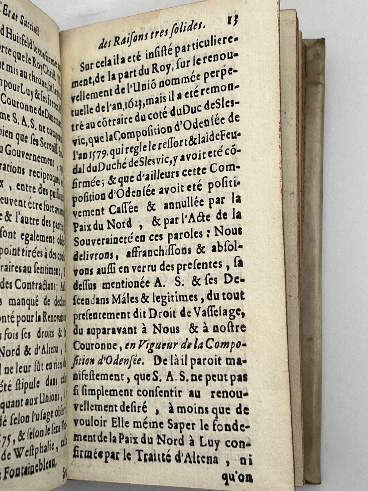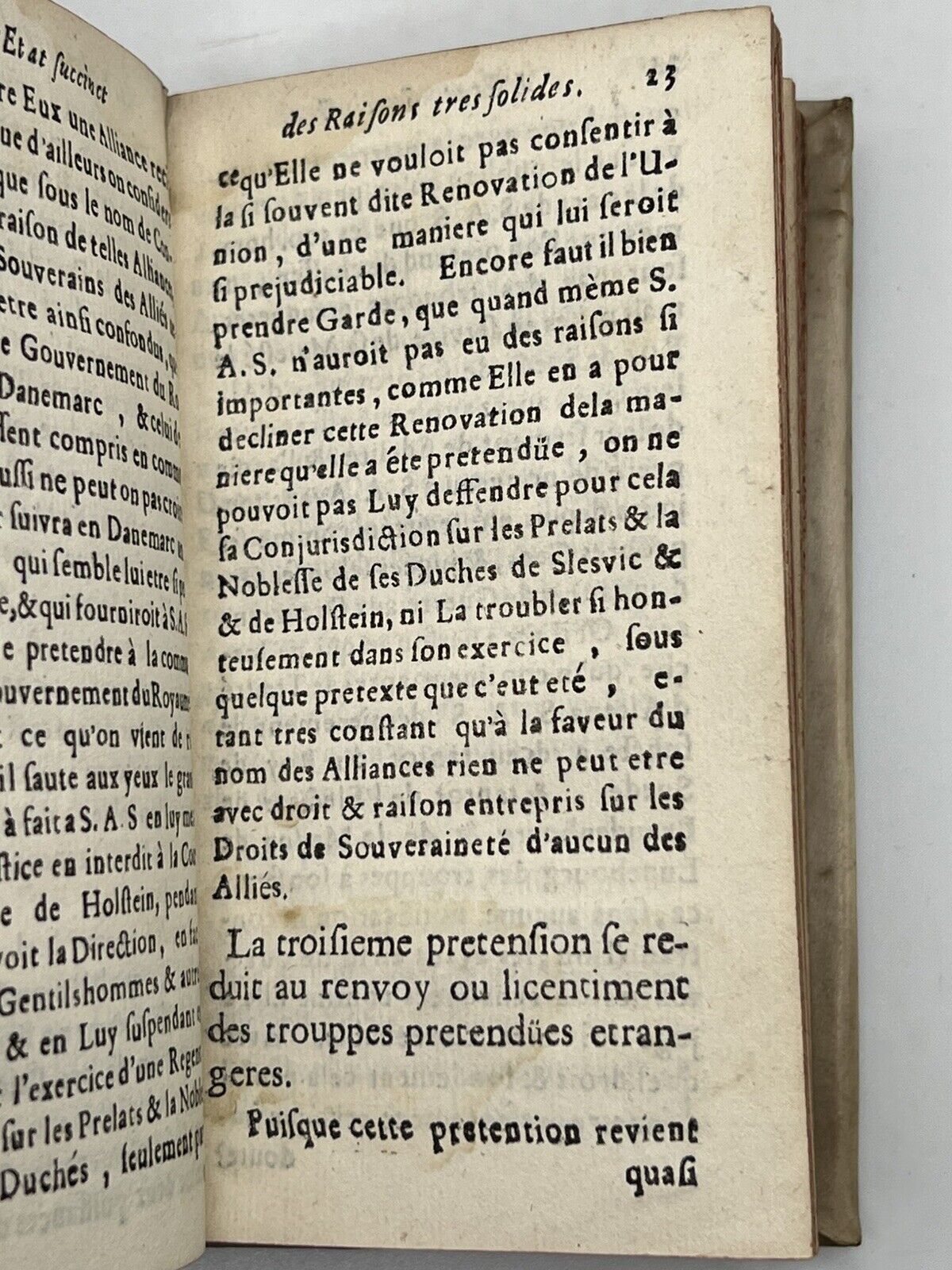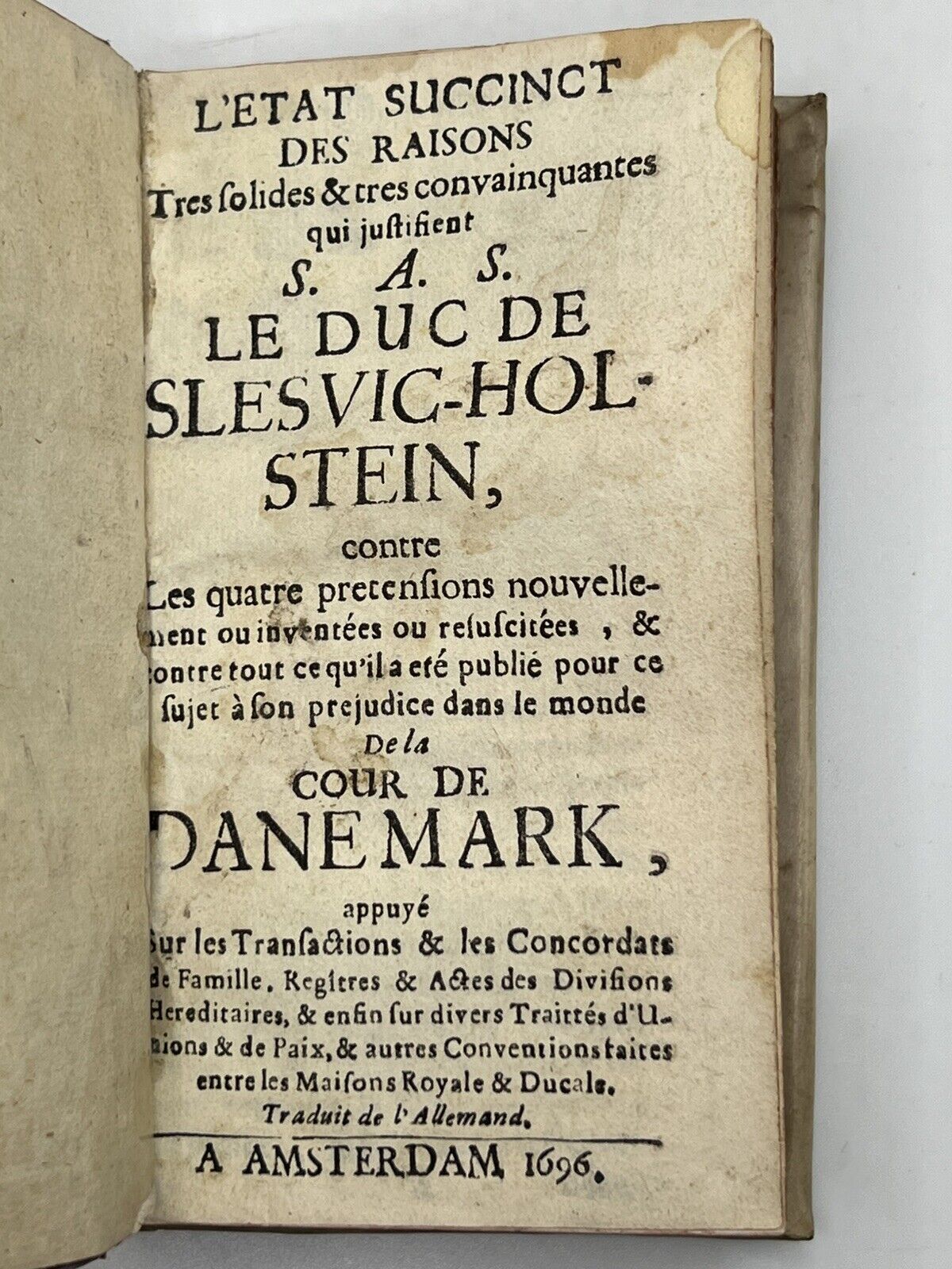 L'Etat Succinct Des Raisons Tres Solides & Tres Convainquantes Qui Justifient S. A. S. Le Duc De Slesvic-Hol-Stein, Contre Les Quatre Pretensions Nouvelle-nent Ou Inventees Ou Resuseitees, & Ontre Tout Ce Qu'Il A Été Publie Pour Ce Sujet A Son Prejudice Dans Le Monde De La Cour De Danemark, Appuye Sur Les Transactions & Les Concordats De Famille, Regitres & Actes Des Divisions Hereditaires, & Enfin Sur Divers Traittes D'U-nions & De Paix, & Autres Conventions Faites Entre Les Maisons Royale & Ducale. Traduit De L'Allemand. A Amsterdam, 1696.