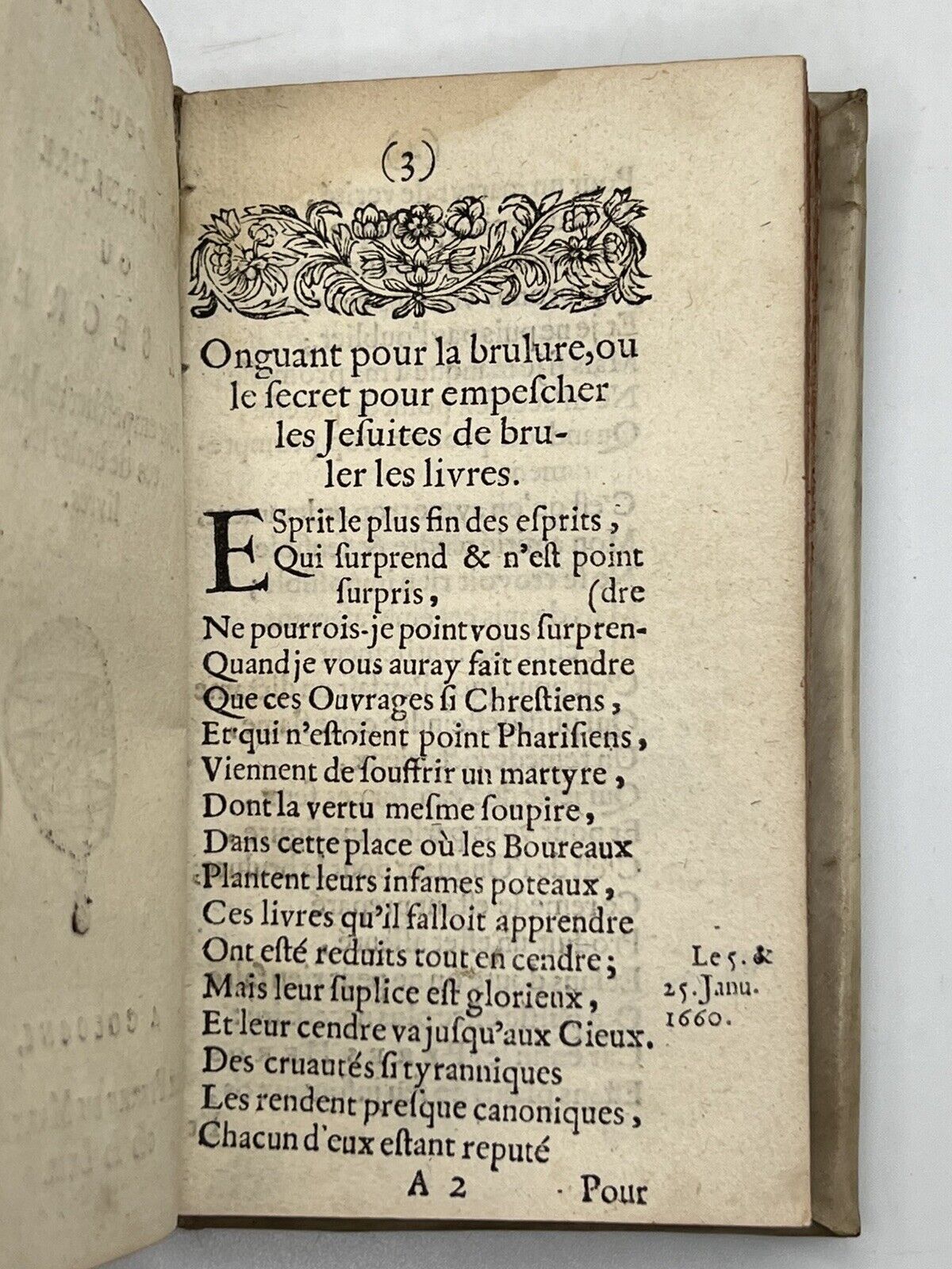 Onguant Pour La Brulure Ou Le Secret Pour Empescher Les Jusuites De Bruler Les Livres. A Cologne, Chez Pierre Du Marteau, MDLXIX.