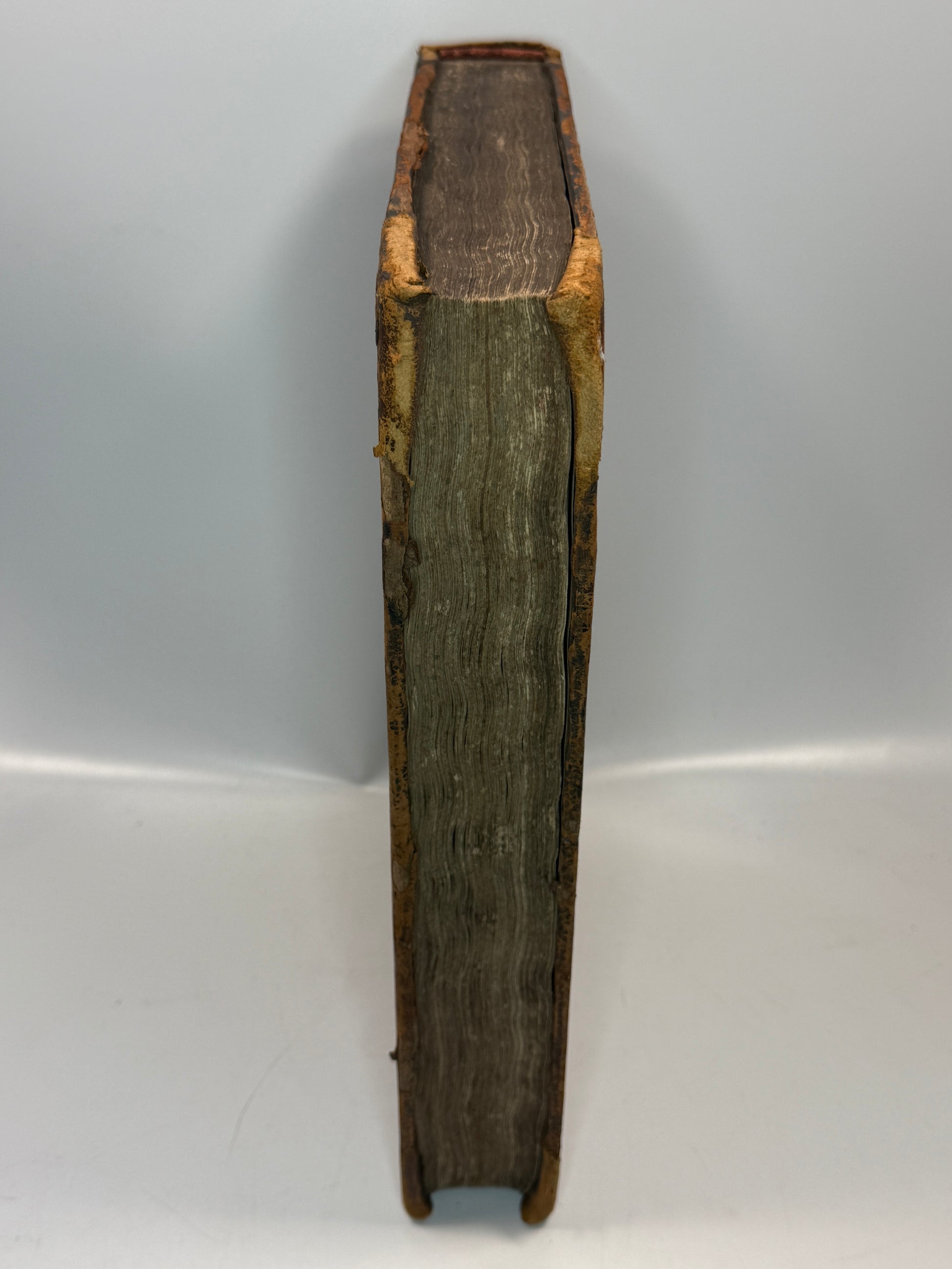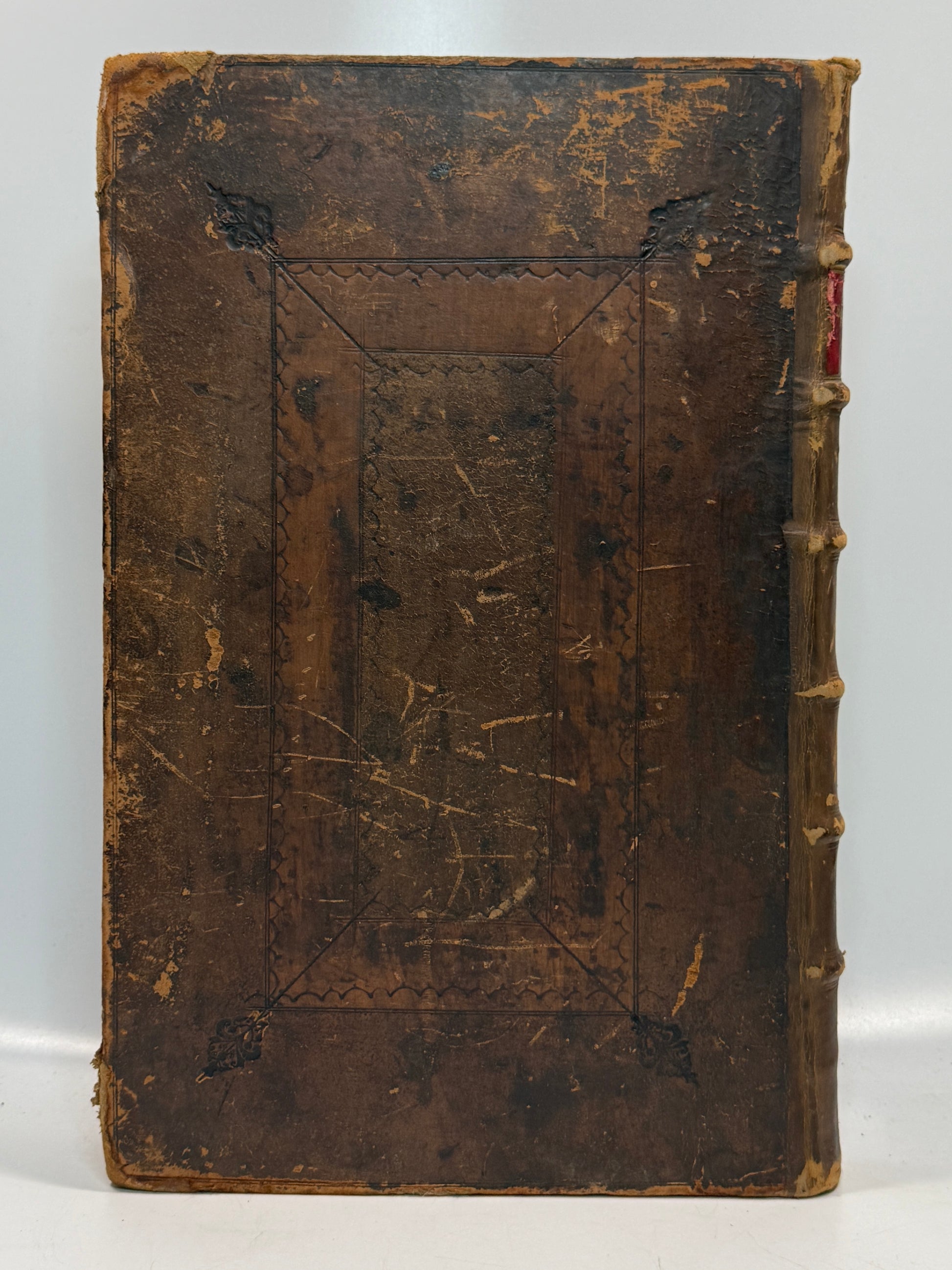 Contemporary boards in Cambridge panelled design, binding rebacked circa the mid 19th century, attractive on the shelf. Both boards are securely attached and the binding is secure. Tooled red morocco label laid down to spine with ‘1714’ date in blind to foot. Binding rubbed with minor loss to leather, shelf wear, spine sunned.