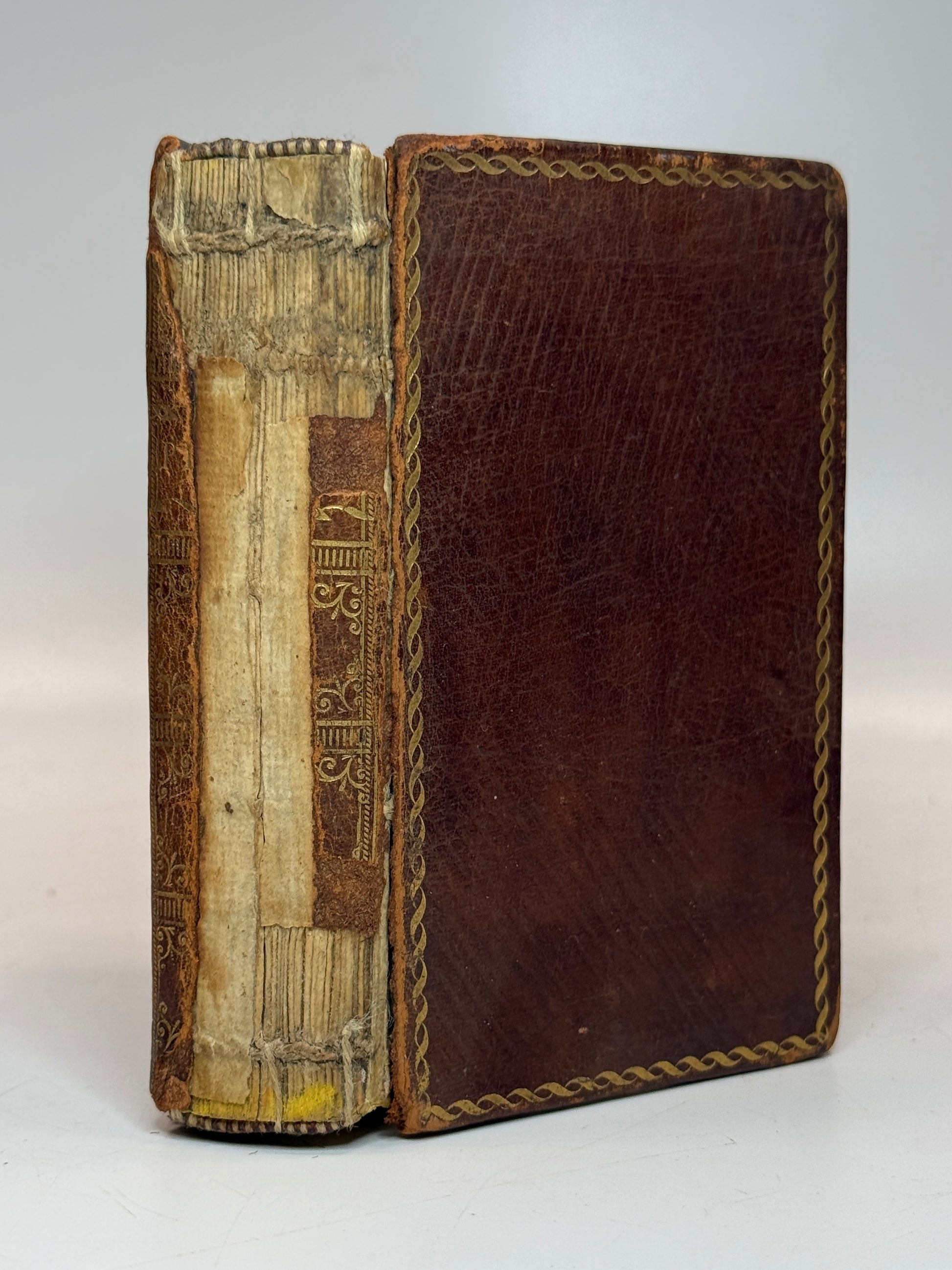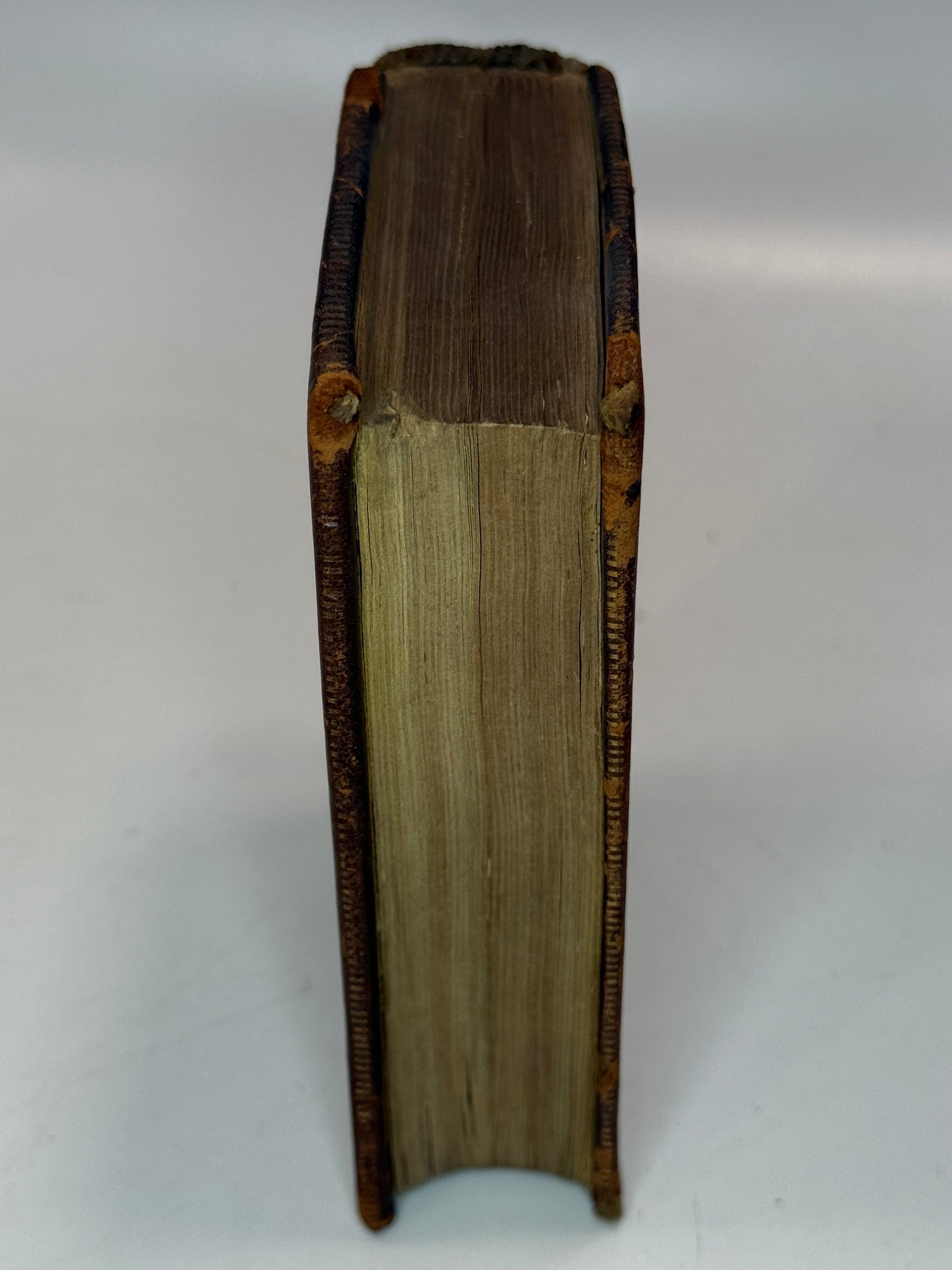 Full brown calf binding, lacking most of the backstrip, lightly rubbed and scuffed. Both boards attached with cracked joints and hinges starting. Shelf and edge wear. Page edges toned. Ink inscriptions to front blank and title page. Text block fairly clean with light toning, occasional foxing, and sporadic ink marginalia. Edge toning to endpapers as commensurate with the full leather binding. This copy has 621 consecutive pages plus blanks.