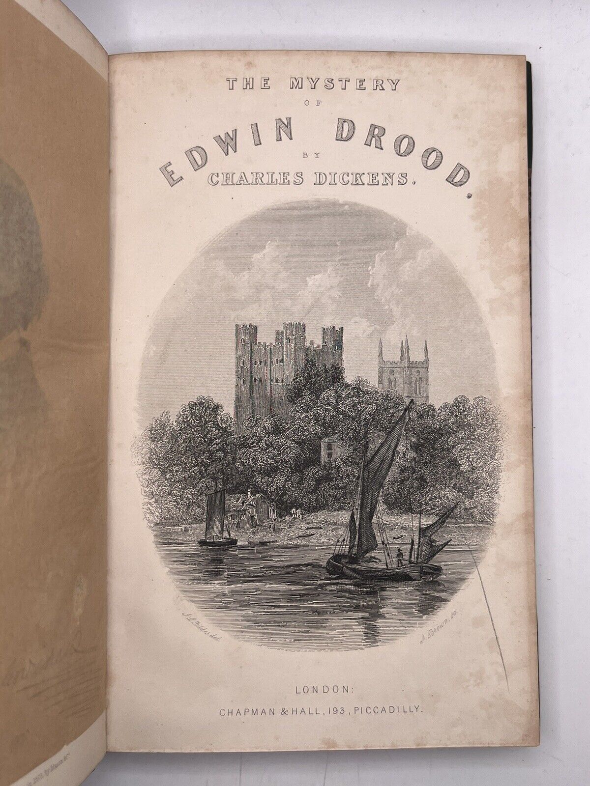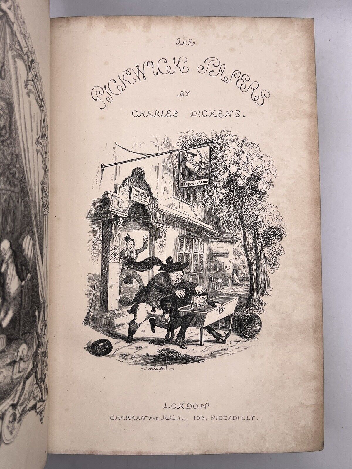 Some plates coloured-in by previous owner, probably a child, in the Edwin Drood volume. Pp.201-204 detached in the Pickwick Papers, but present. Plate between pp.296-7 mostly detached and with a closed tear, attached with a small part at the top, but present. Pp.103-106 in Nicholas Nickleby detached and with toning and very small edge tears, but present. Pp.209/210 attached very loosely at the top, mostly detached with very small tears to edges, but present. Plate between pp.389 and pp.399 detached in the Old Curiosity Shop, but present. Pp.259-270 partially detached at the bottom in Dombey and Son. Plate between pp.422 and pp.423 detached in Bleak House, but present.