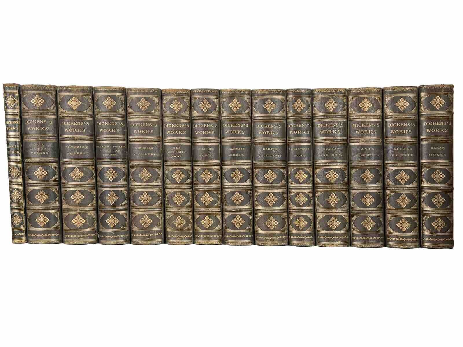 All uniformly bound apart from Edwin Drood which is bound in a very similar manner, thus appearing nicely on the shelf with the rest of the set. This is probably due to this volume being smaller and was almost certainly bound contemporaneously with the other volumes in the set. Half calf over paper backed boards with gilt titles between raised bands, other compartments with gilt tooling. Spines lightly rubbed, more so to extremities. All boards securely attached with rubbing along joints. Boards with very minor superficial scratches and rubbing, some somewhat sunned. Few boards have very small fragments of leather peeling/lacking, see photos for reference. Bindings secure, few volumes with minor shelf lean, remaining upright. Shelf and edge wear. Dulling to page edges, with top page edges darkened as typical. Some leaves stick out past the remaining page edges in some volumes. Text blocks very clean with minor foxing, more so to the first few and the last few leaves, as well as leaves surrounding plates. Most plates very clean with edge toning, some with minor foxing.