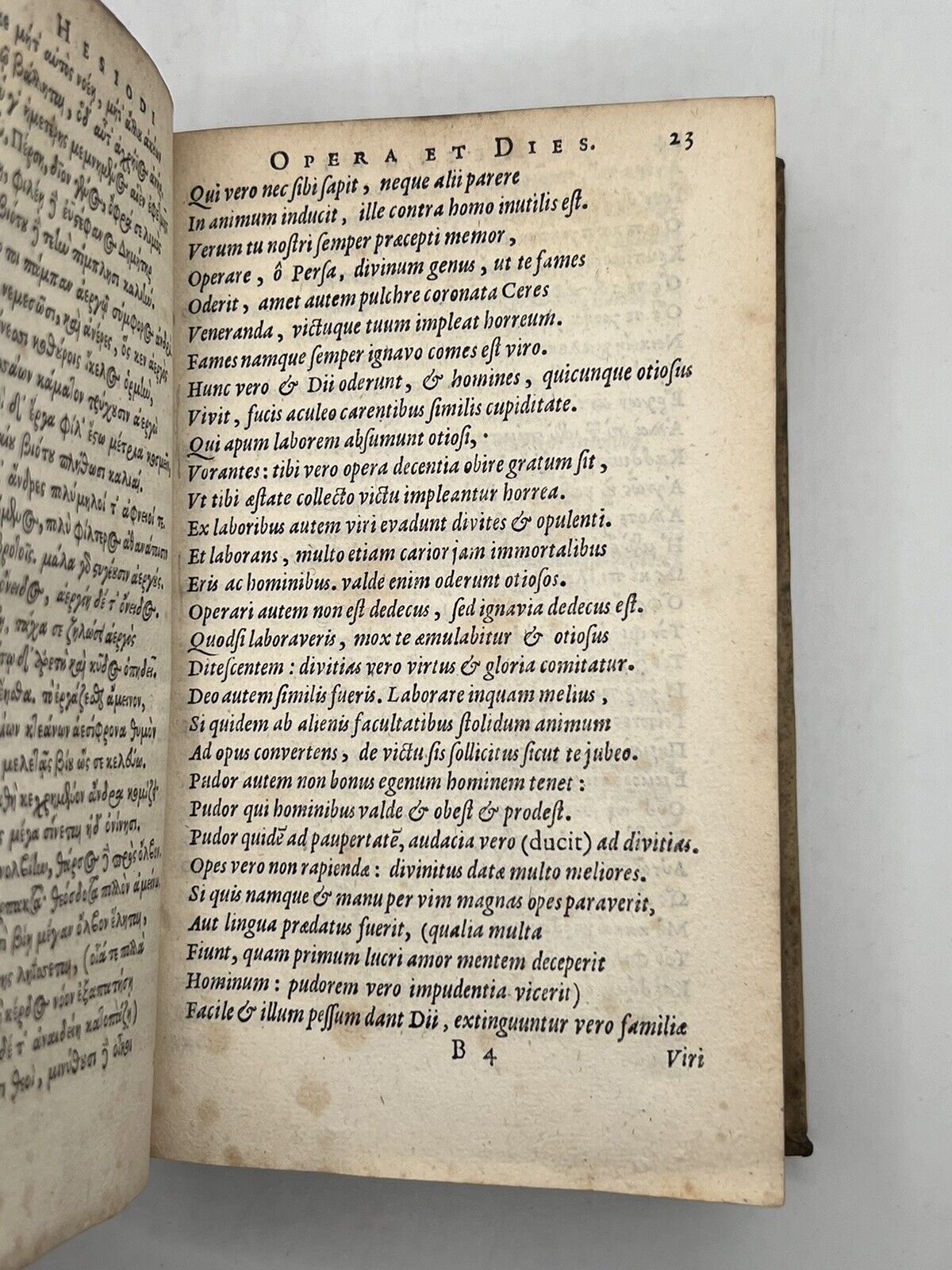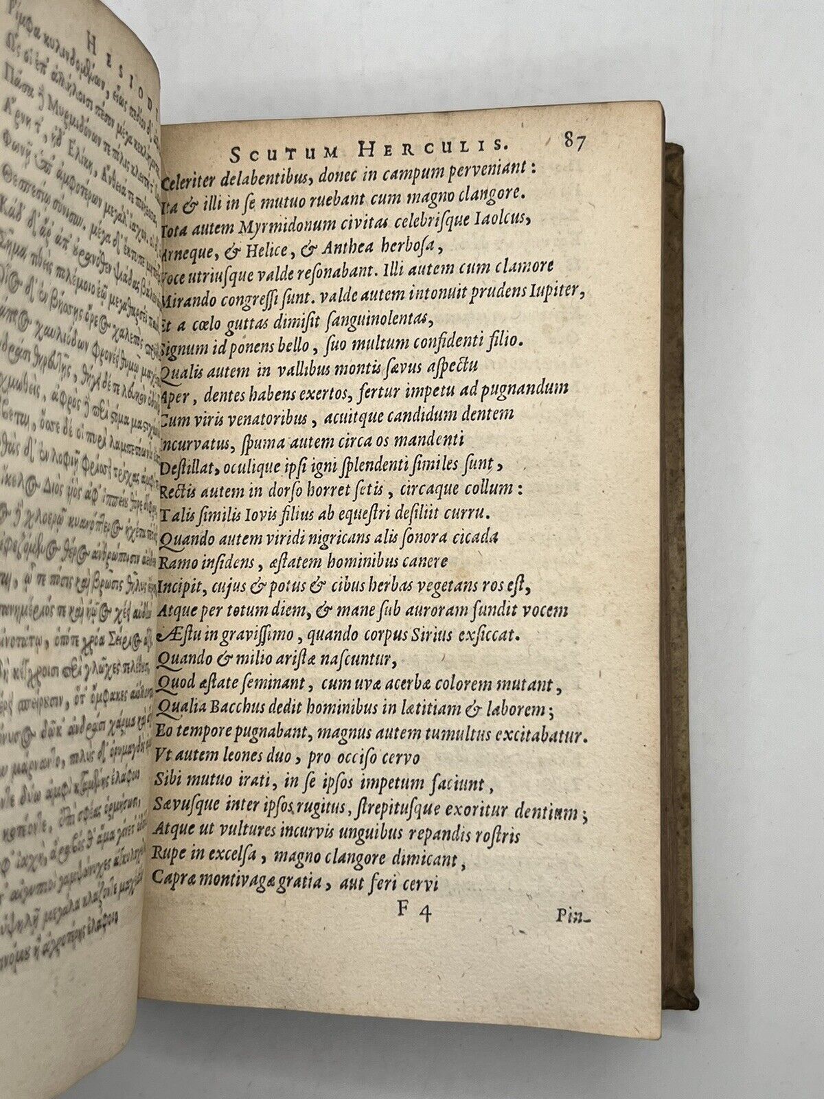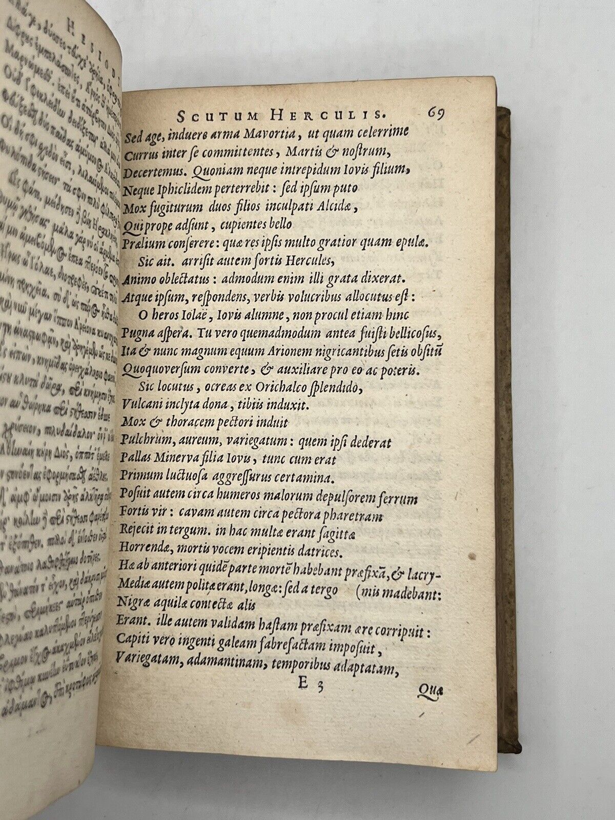 A beautiful bright copy of the Elzevir Press edition of Hesiod, with their characteristic printer's device to the title page. An excellent bilingual edition with the original Greek and Latin translation on opposing pages. This copy is bound with Lectiones Hesiodeae with the notes of Scaligeri and Guieti, also published in 1667.
