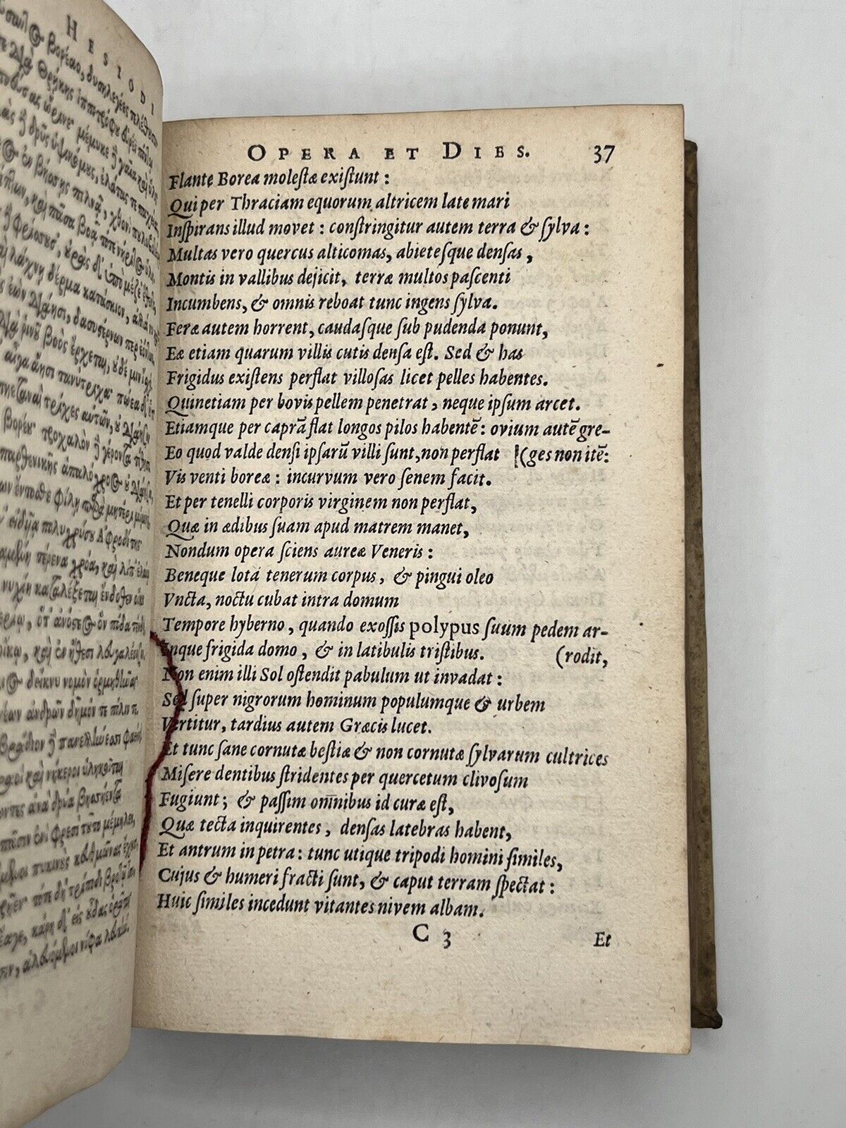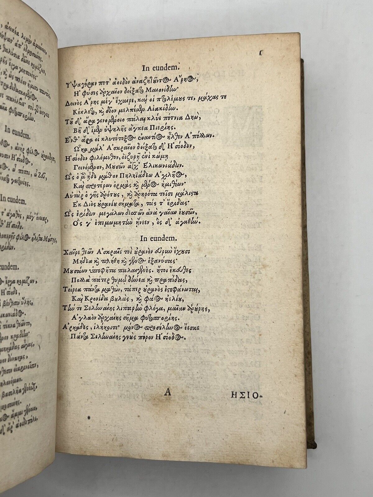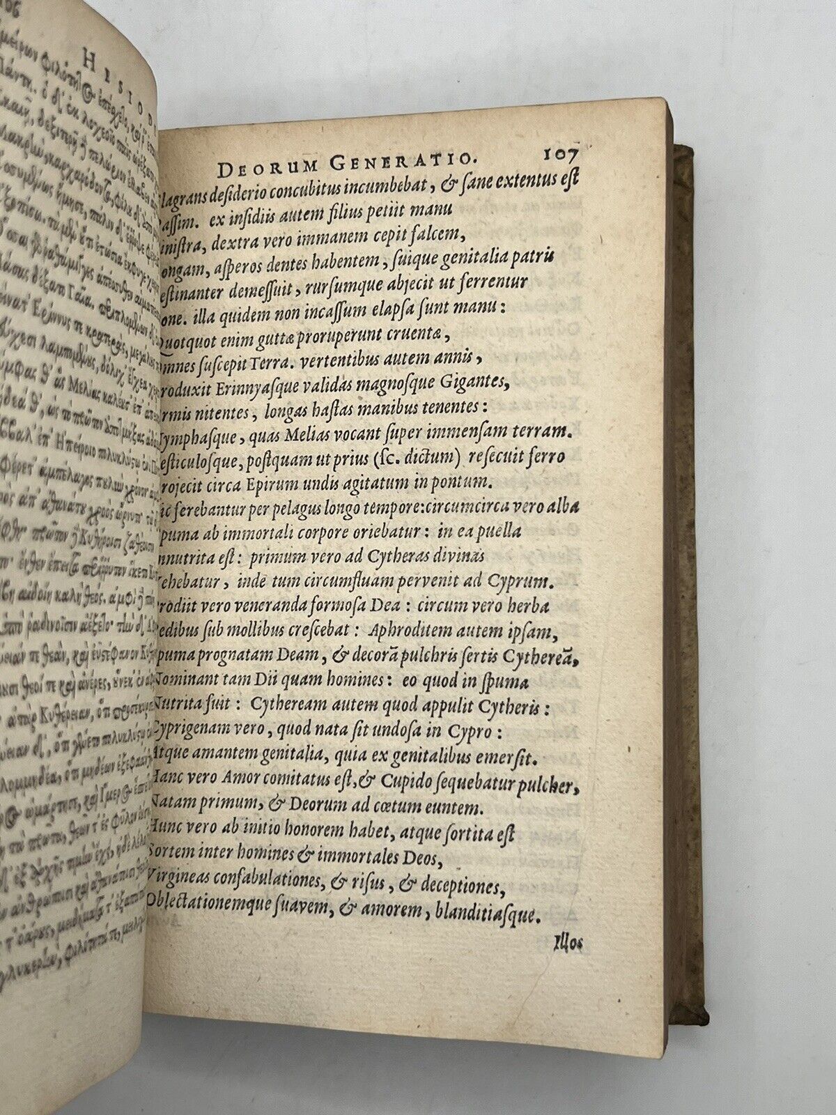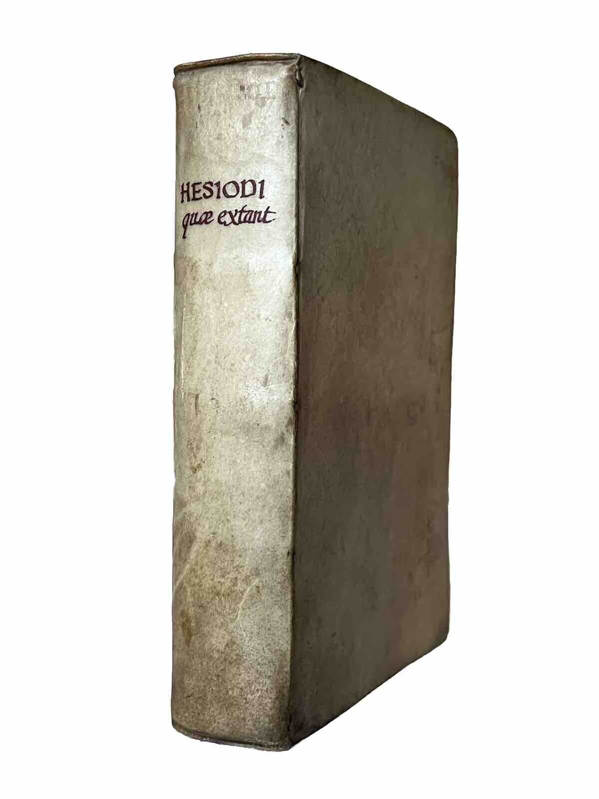 Contemporary, probably original, full vellum binding with later writing to the spine reading 'Hesiodi quae extant'. Vellum a little discoloured with corners bumped, but generally very good and externally very attractive. Both boards securely attached with joints secure, uncracked, with the binding secure and without shelf lean, but the binding has a slight tendency for the boards to move outward as typical. Top page edge dulled as typical, others very good. Endpapers a little stained, with several ownership inscriptions of varying date to ffep verso, one of which appears to be near contemporary. Mildly toned through the text block, but generally bright and clean with a few very light pencil marginalia to the Greek side of the text, written in Greek, seemingly only to the first 20pp or so. Else an excellent copy.