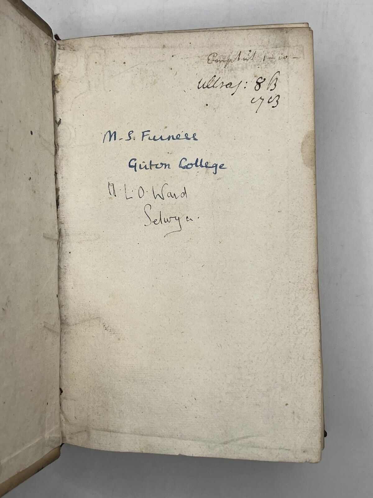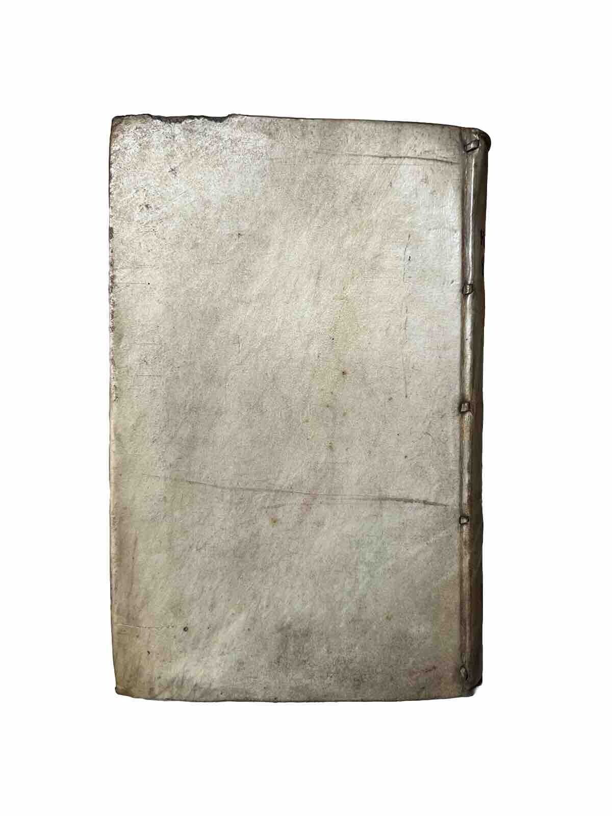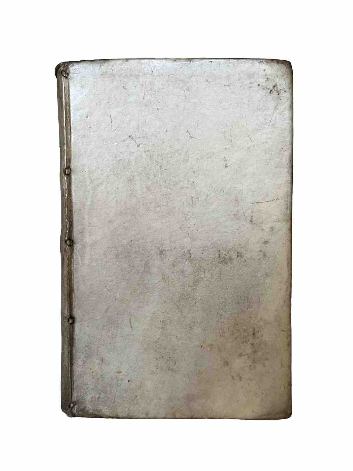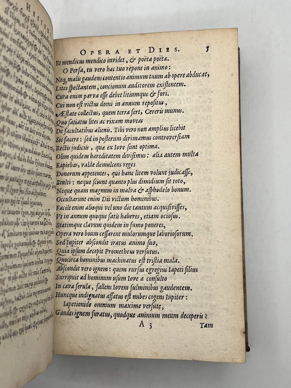 Contemporary, probably original, full vellum binding with later writing to the spine reading 'Hesiodi quae extant'. Vellum a little discoloured with corners bumped, but generally very good and externally very attractive. Both boards securely attached with joints secure, uncracked, with the binding secure and without shelf lean, but the binding has a slight tendency for the boards to move outward as typical. Top page edge dulled as typical, others very good. Endpapers a little stained, with several ownership inscriptions of varying date to ffep verso, one of which appears to be near contemporary. Mildly toned through the text block, but generally bright and clean with a few very light pencil marginalia to the Greek side of the text, written in Greek, seemingly only to the first 20pp or so. Else an excellent copy.