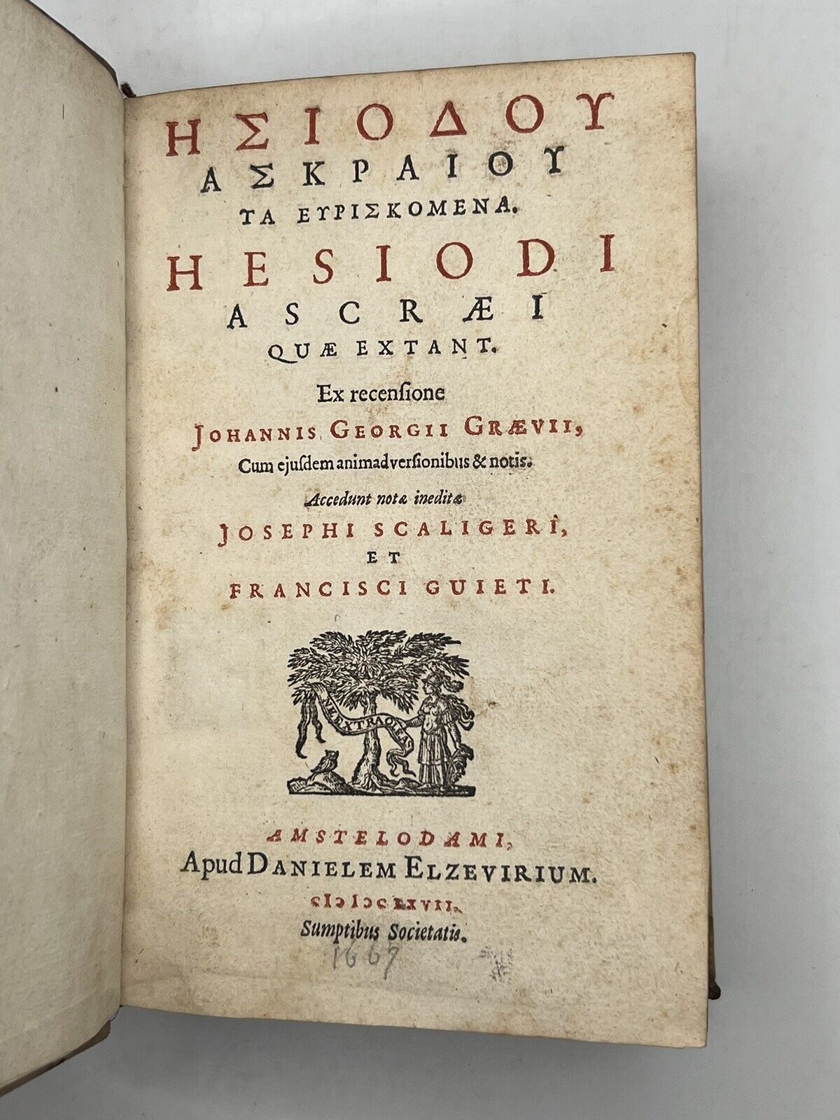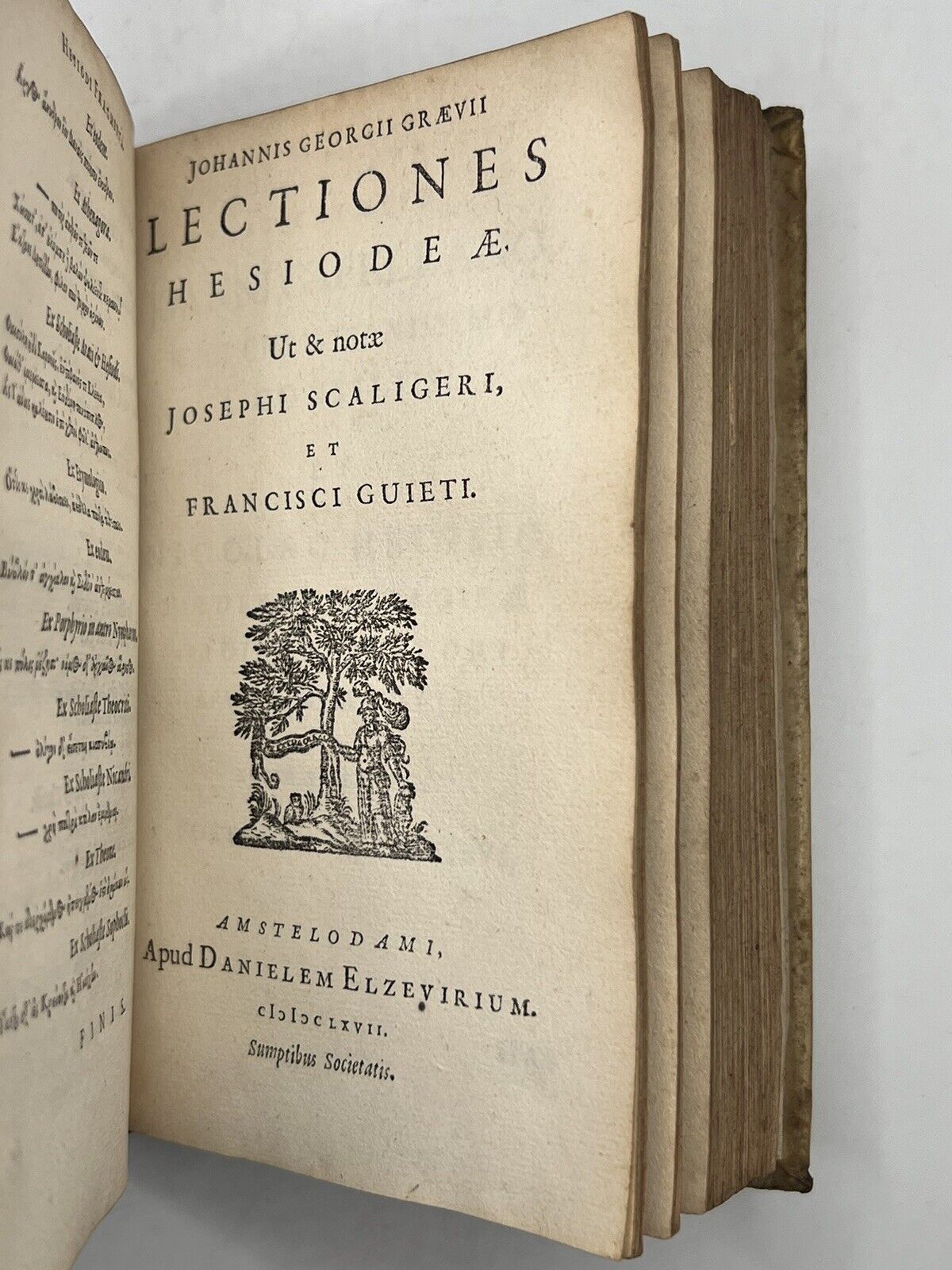 Hesiodi Ascraei quae extant. Ex recensione Johannis Georgii Graevii, cum ejusdem animadversionibus et noris. Accedunt notae ineditae Josephi Scaligeri, et Francisci Guieti. Amstelodami, apud Danielem Elzevirium, 1667.