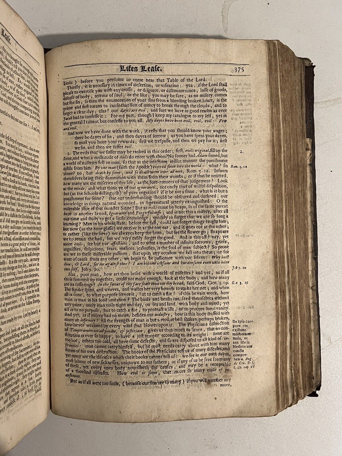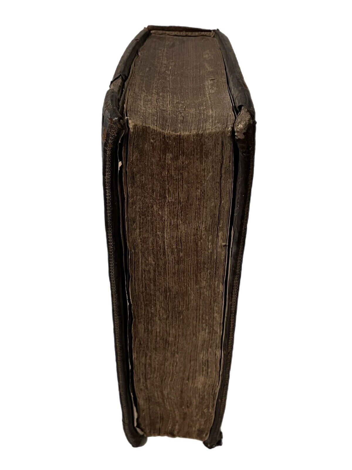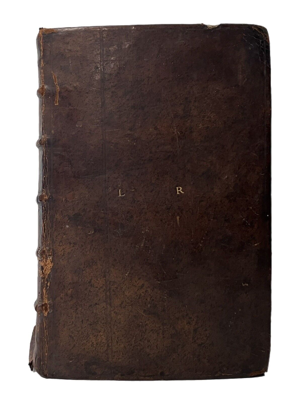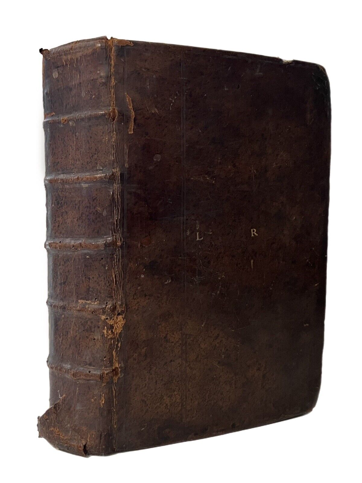 Full brown calf binding with gilt initials "L R" to the both boards. Binding rubbed and scuffed with a small tear to the bottom of the backstrip causing that part to be partially detached from the page block. Tailcap cracked with fragments lacking and partially detached. Very minor wormholing to the rear board. Both boards attached with wear to joints, front hinge cracked, and rear hinge starting. Shelf and edge wear with small fragments of leather lacking. Corners turned-in. Page edges dulled and toned. Text block fairly clean with light toning, very sporadic foxing, and with some marks/stains and damp-staining. Front pastedown mostly detached and with fragments lacking and an ink inscription to the reverso. Front blank partially attached to the front pastedown and with small fragments lacking. Small piece of paper attached to the bottom of the front blank with very some holes. Frontispiece creased with tears to the hinge, thus partially detached; frontis trimmed more than other leaves. Title page lightly creased at the top left corner, with tears to the hinge, and with very small edge tears with small loss to the bottom right corner. Very small tears and some worm-holing at the bottom right corner to the first few leaves of the text block. Very small worm-holing to a large number of leaves in the margins, not affecting most text, some text affected near the rear, and becoming more prominent at the rear.