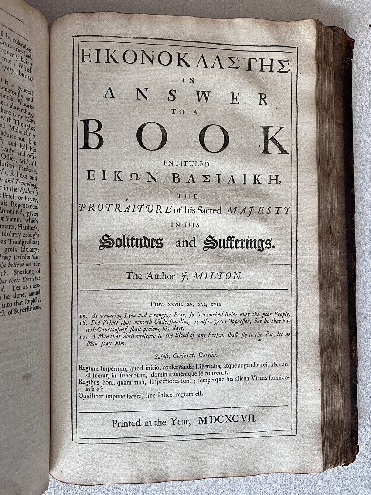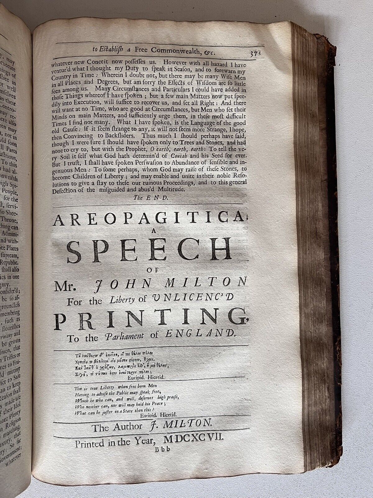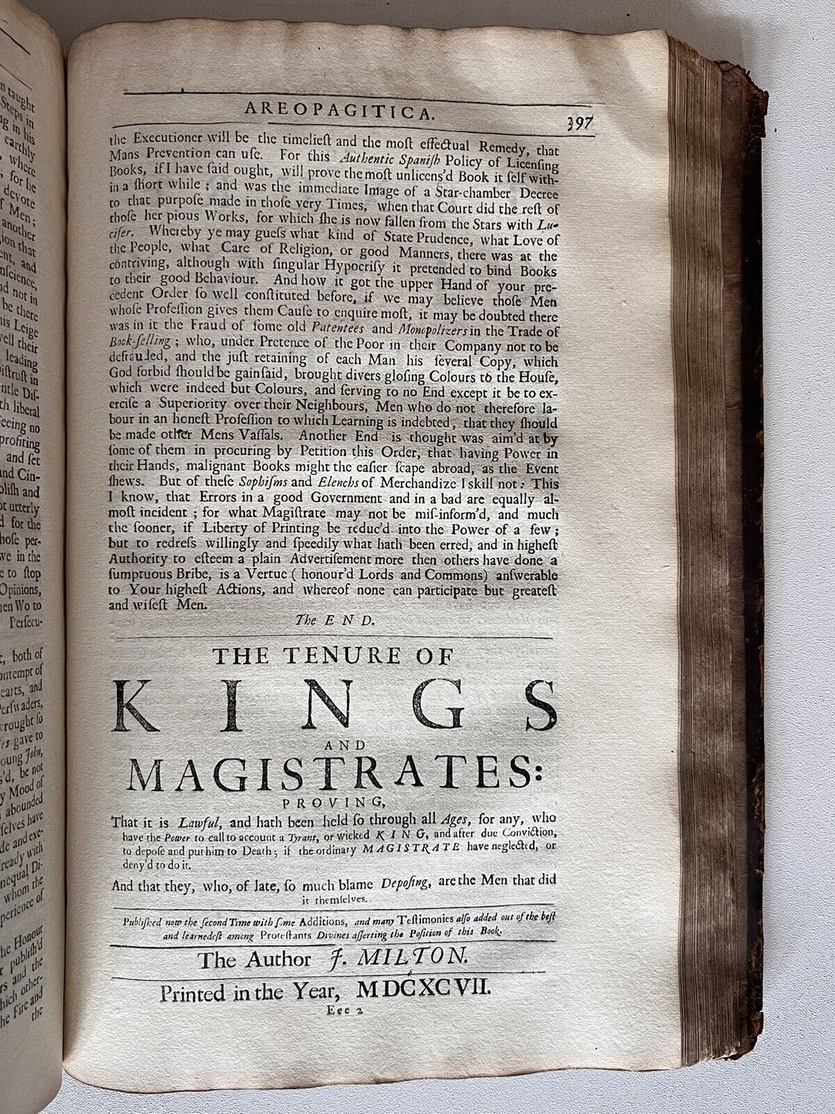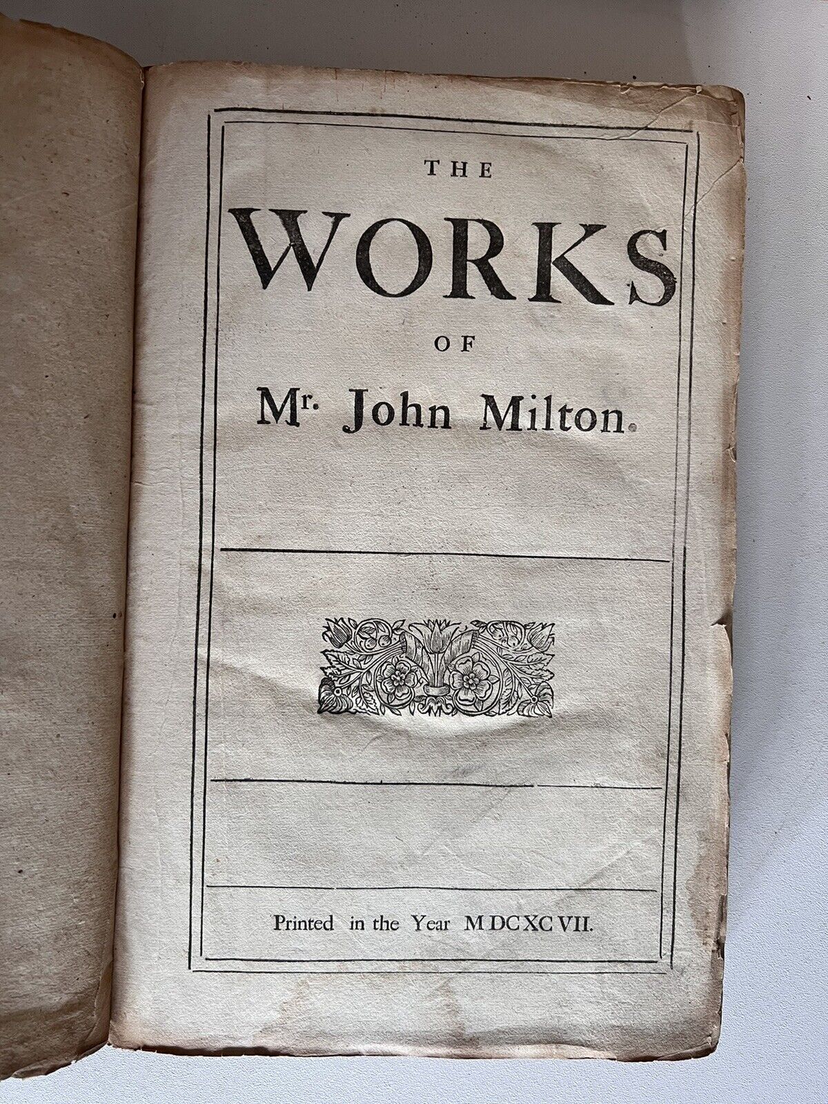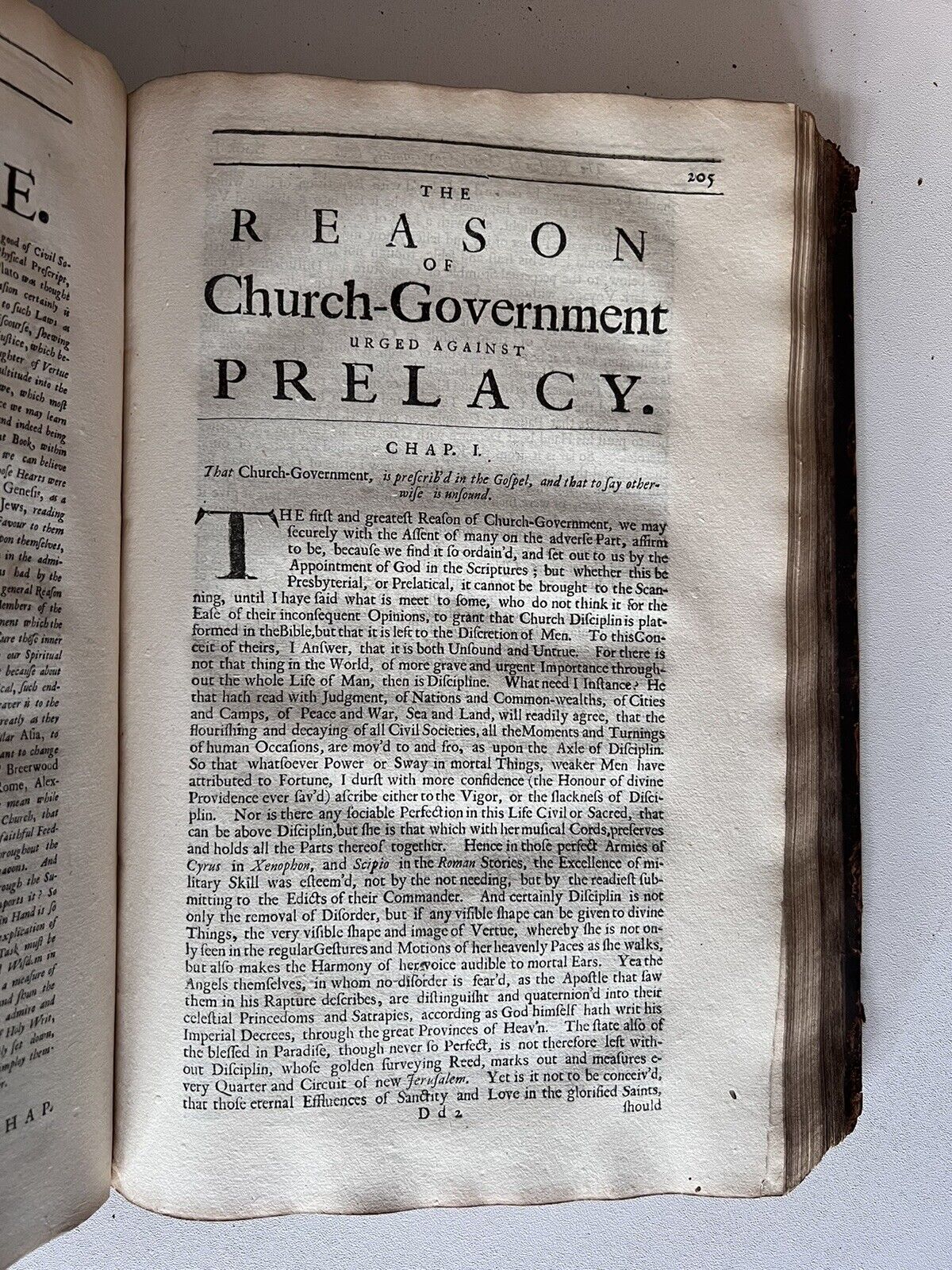 THE VERY RARE FIRST EDITION OF THE PROSE WORKS OF JOHN MILTON, ESPECIALLY SCARCE IN A CONTEMPORARY BINDING AS WITH THIS EXAMPLE.