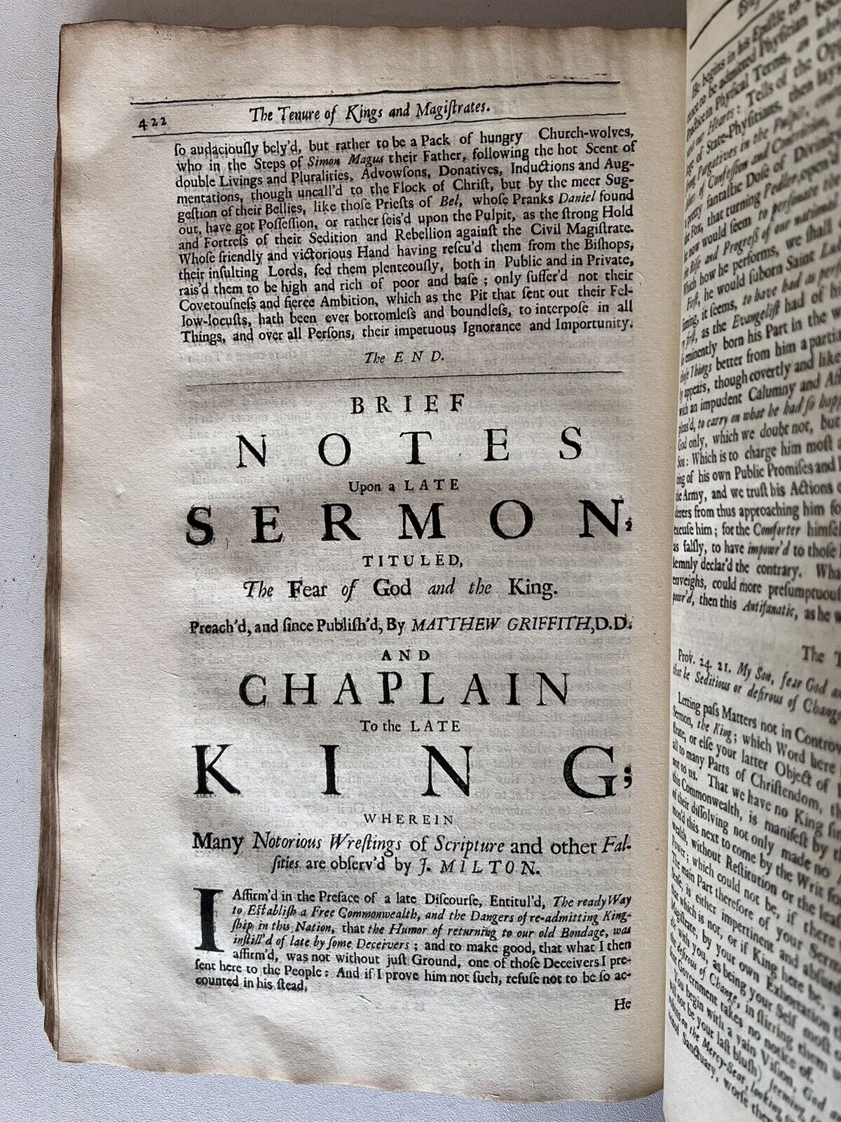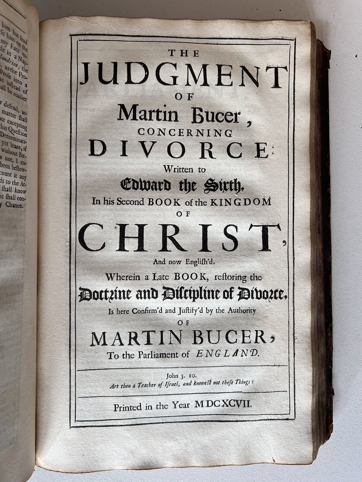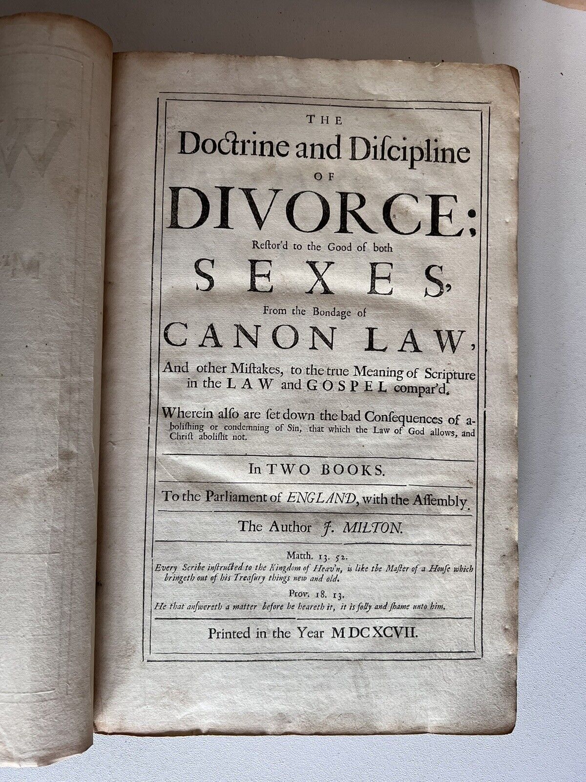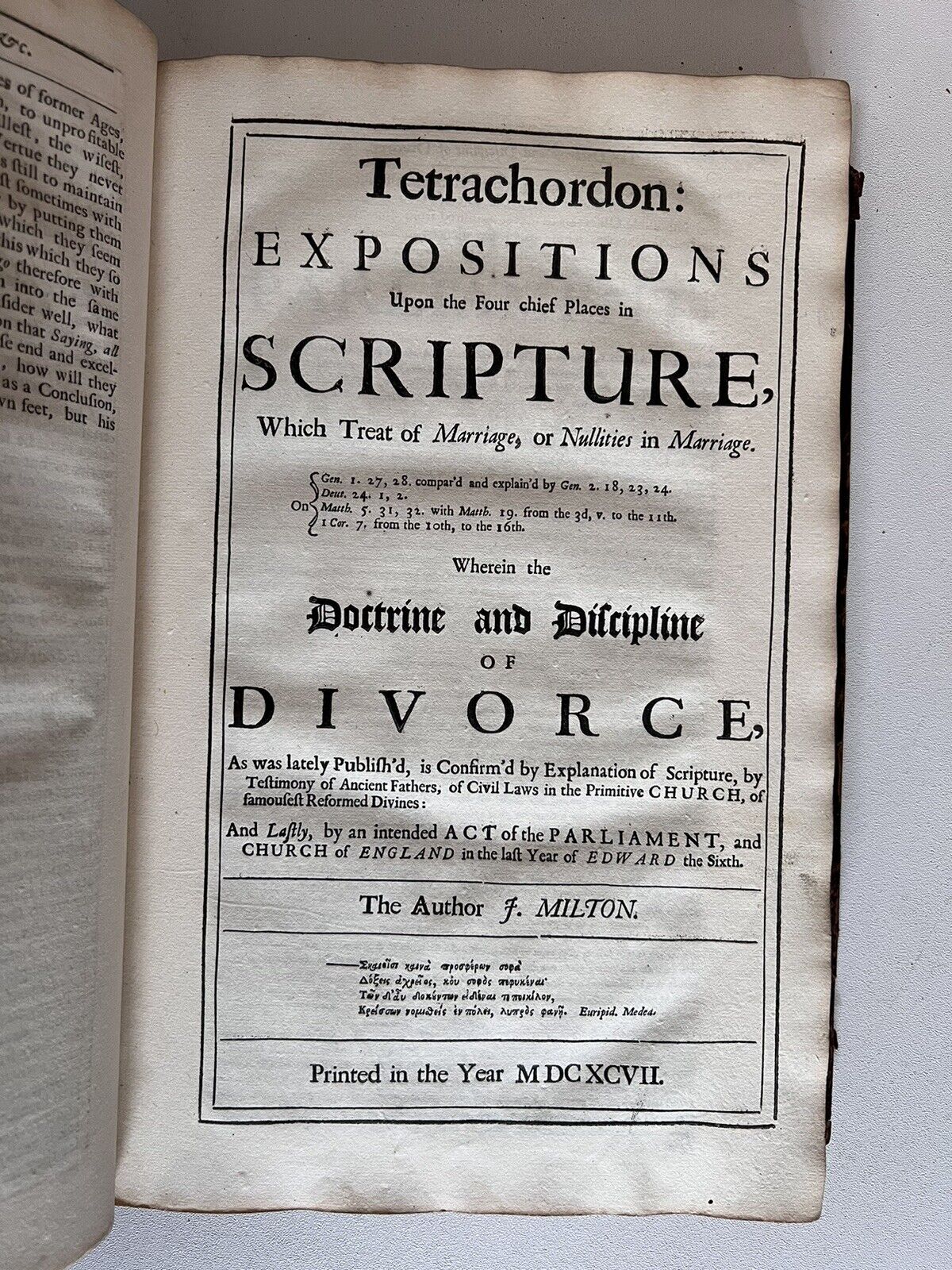 Containing: The Doctrine and Discipline of Divorce in Two Books, Tetrachordon: Exposition Upon the Four chief Places in Scripture Which Treat Marriage or Nullities in Marriage, The Judgement of Martin Bucer [...], The Reason of Church-Government Urg'd Against Prelacy, A Treatise of Civil Power in Ecclesiastical Causes, Considerations Touching the likeliest Means to remove Hirelings out of the Church [...], Of Practical Episopacy [...], Animadversions upon the Remonstrants Defence against Smectymnus, An Apology Against a Pamphlet called a Modest Confutation [...], The Ready and Easy Way to Establish a Free Commonwealth, Areopagitica: A Speech of Mr John Milton For the Liberty of Unlicenc'd Printing, The Tenure of Kings and Magistrates, Brief Notes upon a Late Sermon [...], Eikonok[...] in Answer to a Book Entitled [...], Articles of Peace Made and Concluded [...],