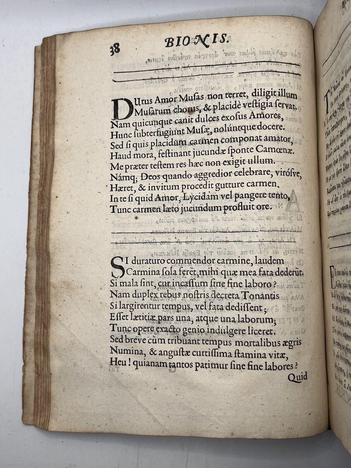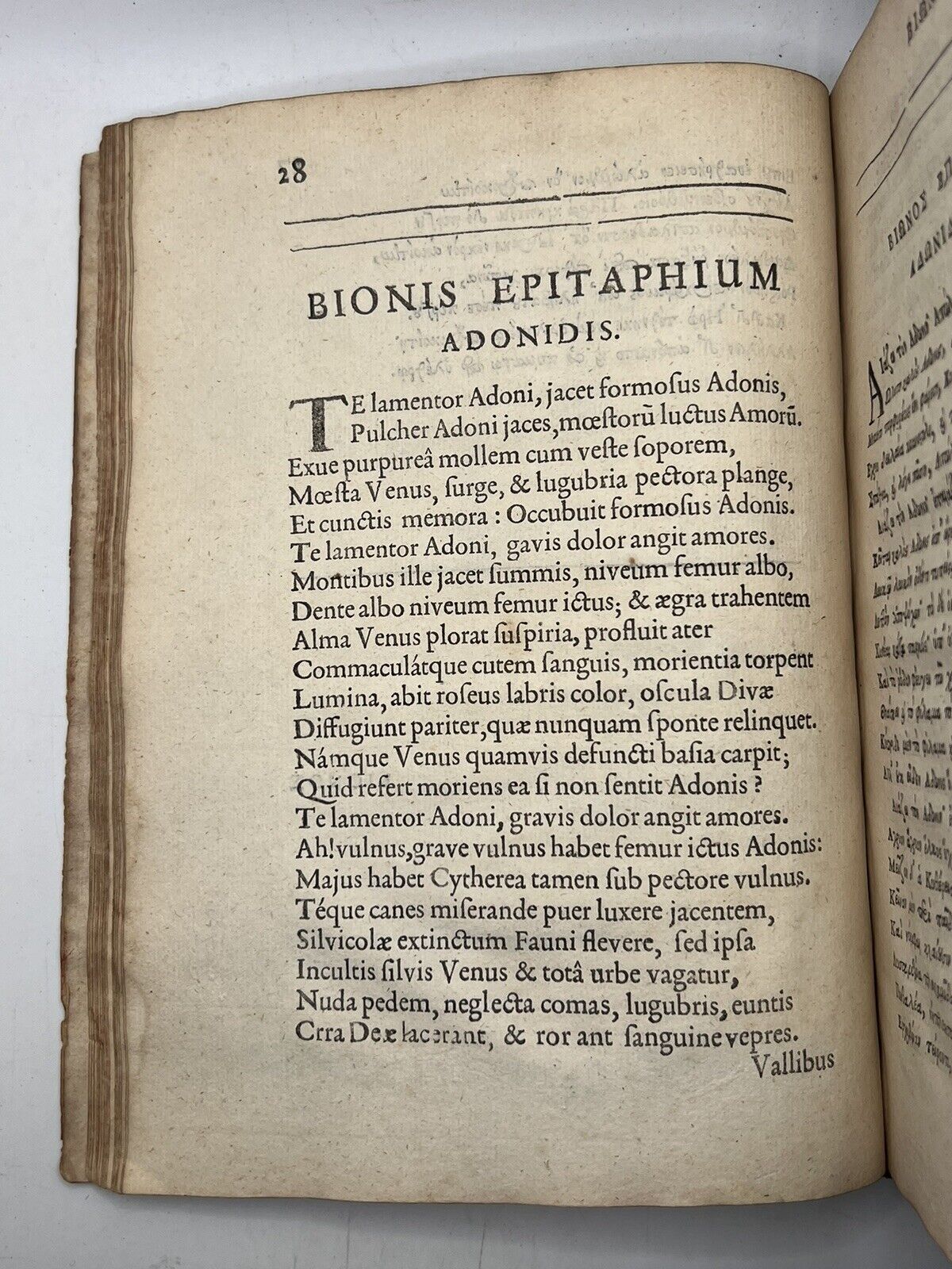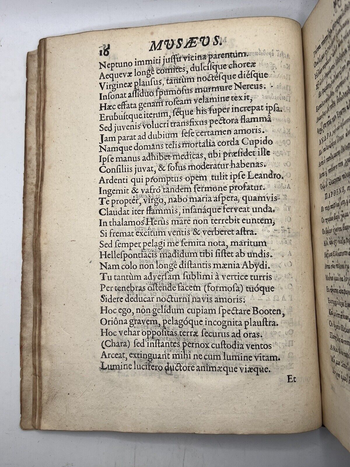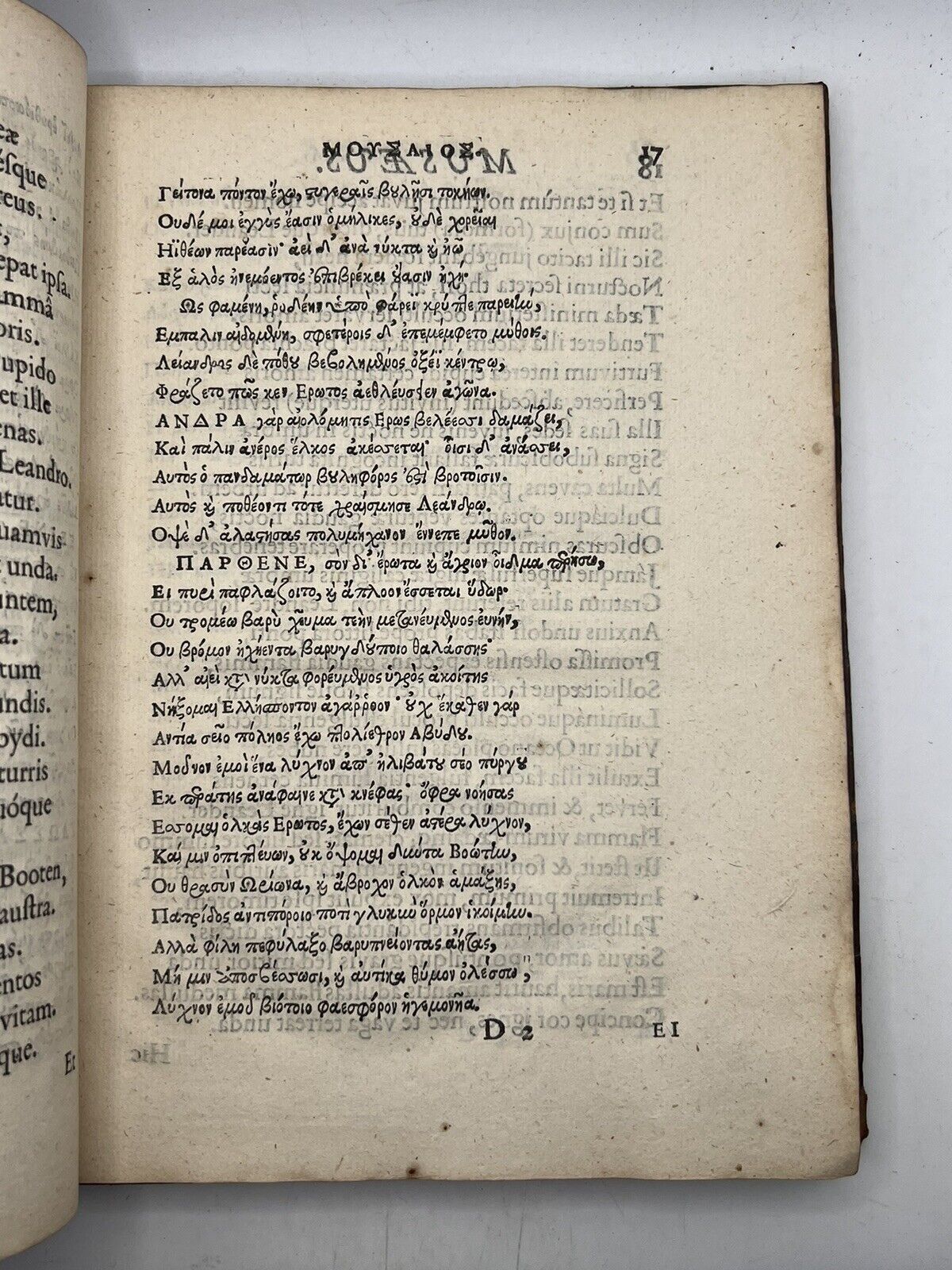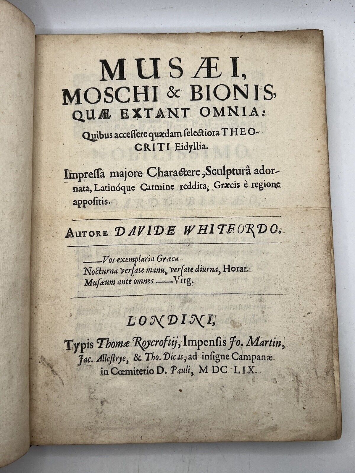 Musaei, Moschi & Bionis, Quae Extant Omnia: Quibus Accessere Quaedam Selectiora Theocriti Eidyllia. Impressa Mojore Charactere, Scultura Adornata, Latinoque Carmine Reddita, Graecis e Regione Appositis. Autore Davide Whitfordo. Londini: Typis Thomae Roycroftii, MDCLIX.