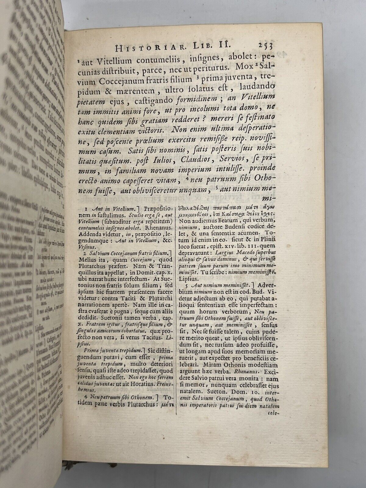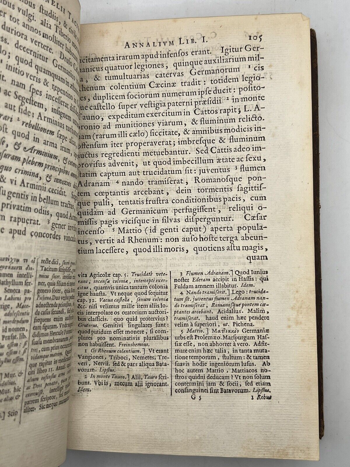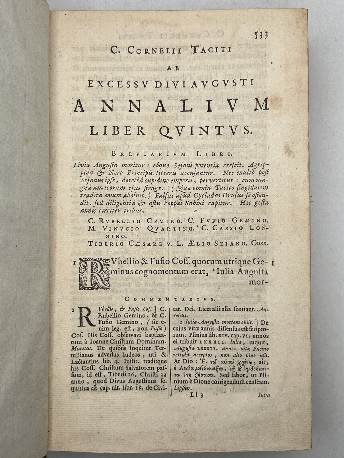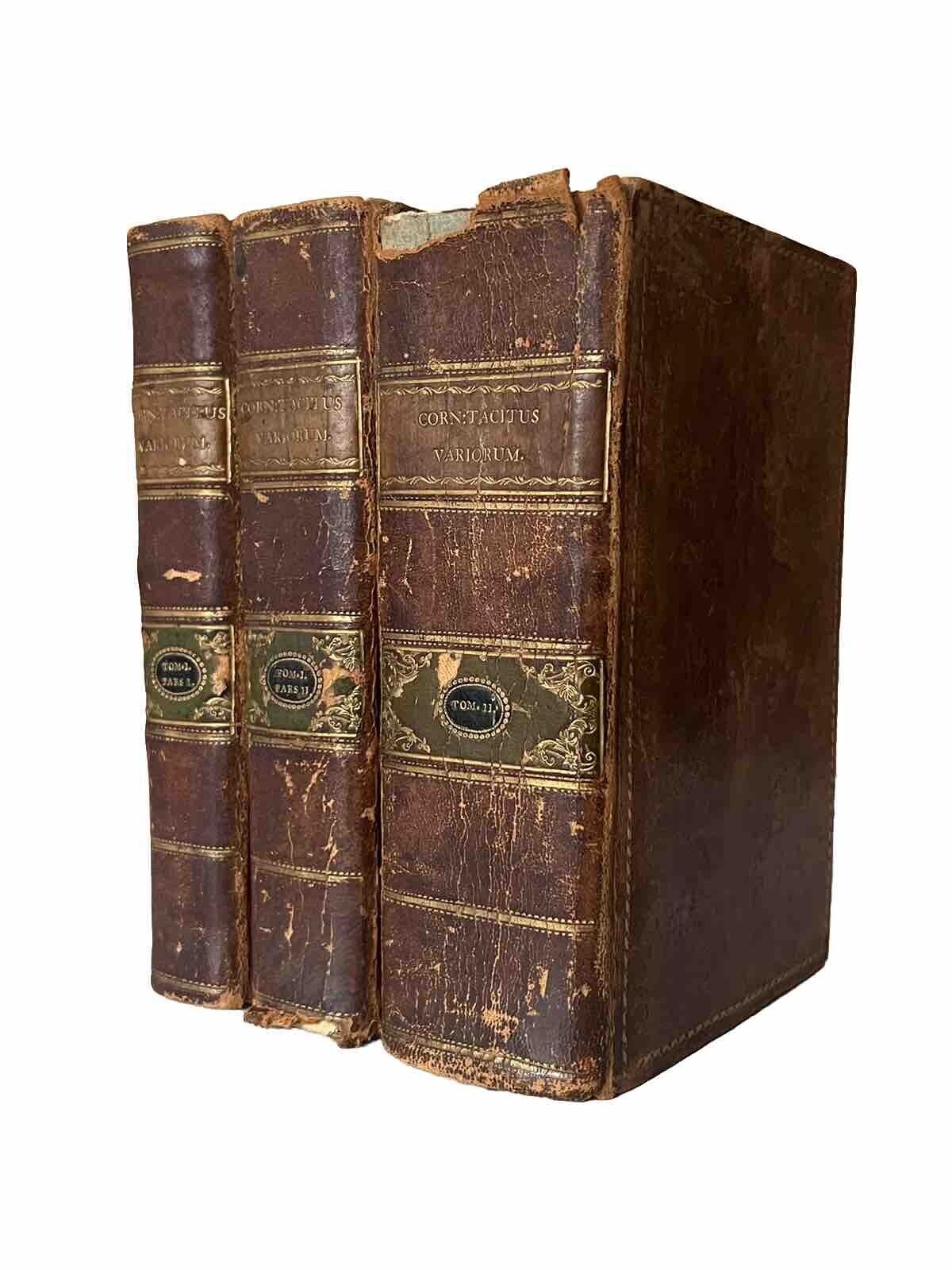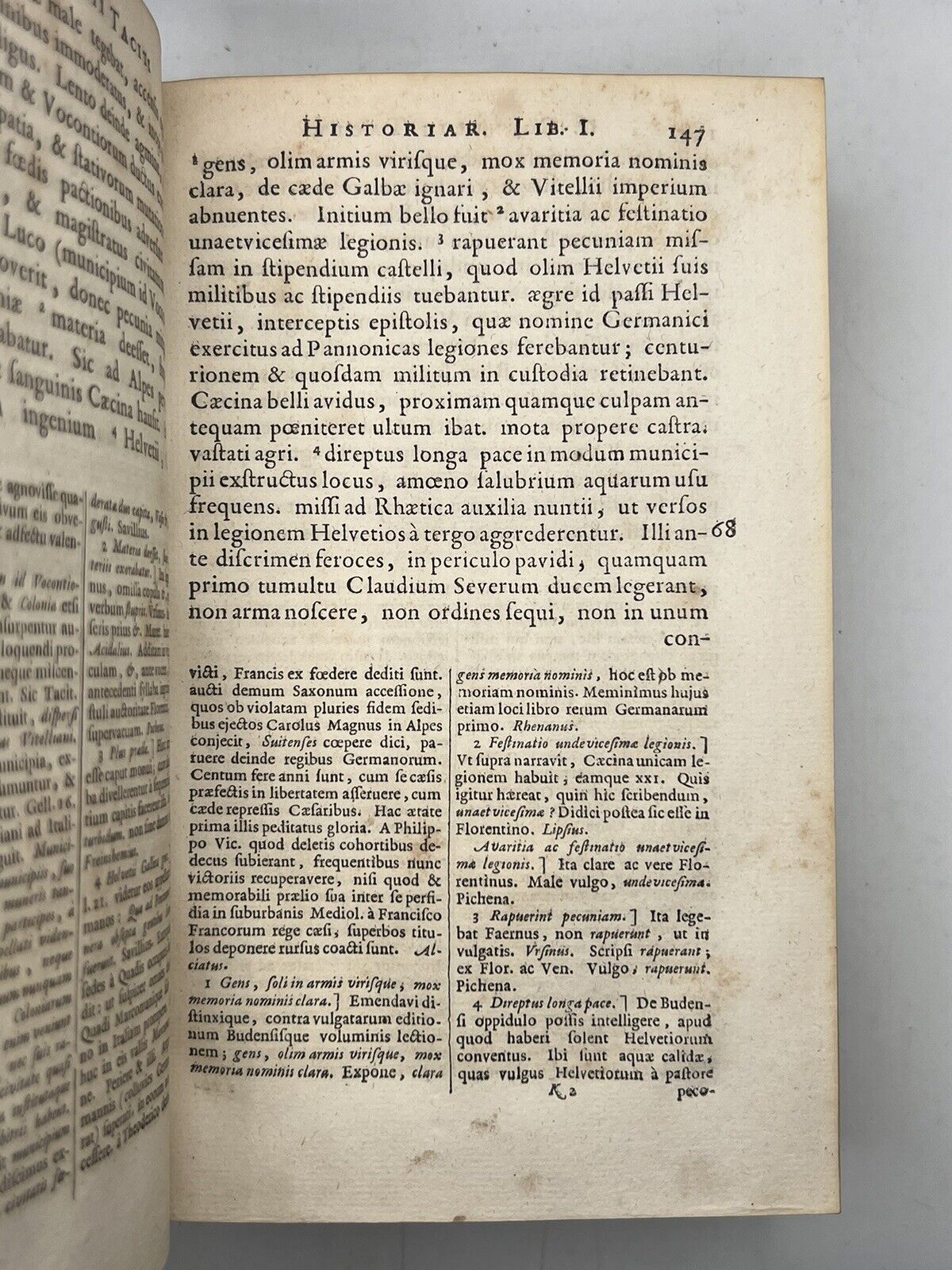 A very attractive set of Tacitus' works, a Variorum edition, with the notes of Gronovius. Complete in 2 volumes, here bound into 3, with a particularly excellent engraved title page in volume one. A lovely set.