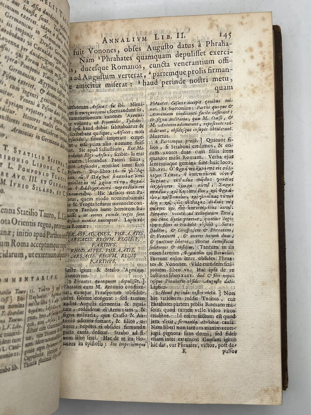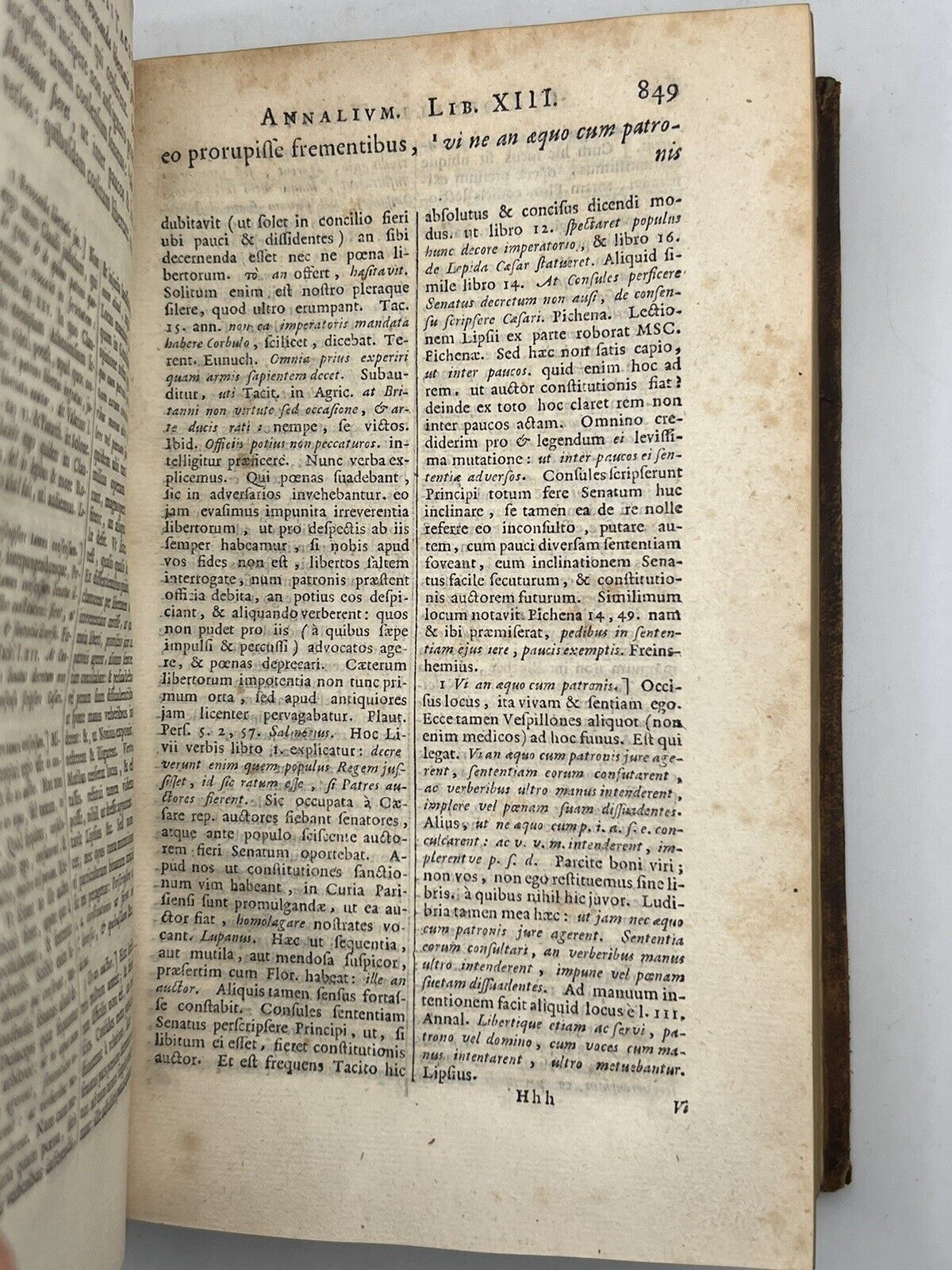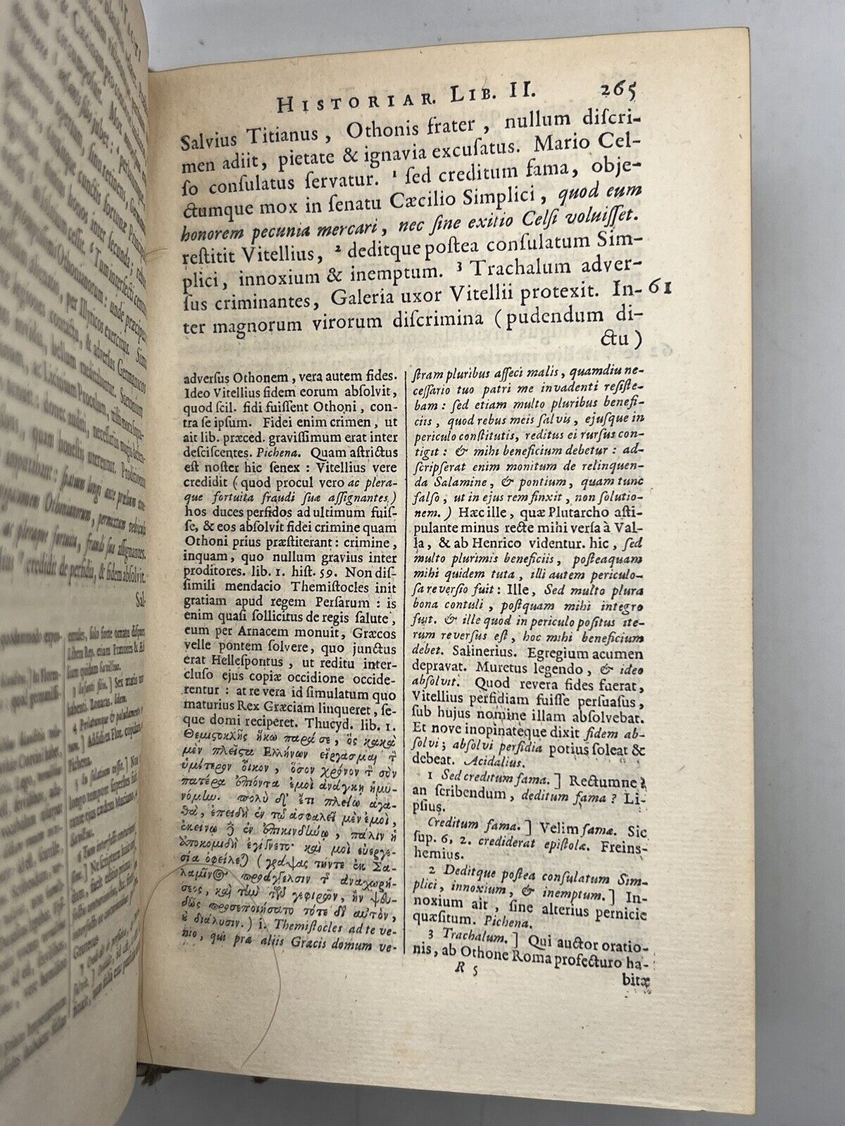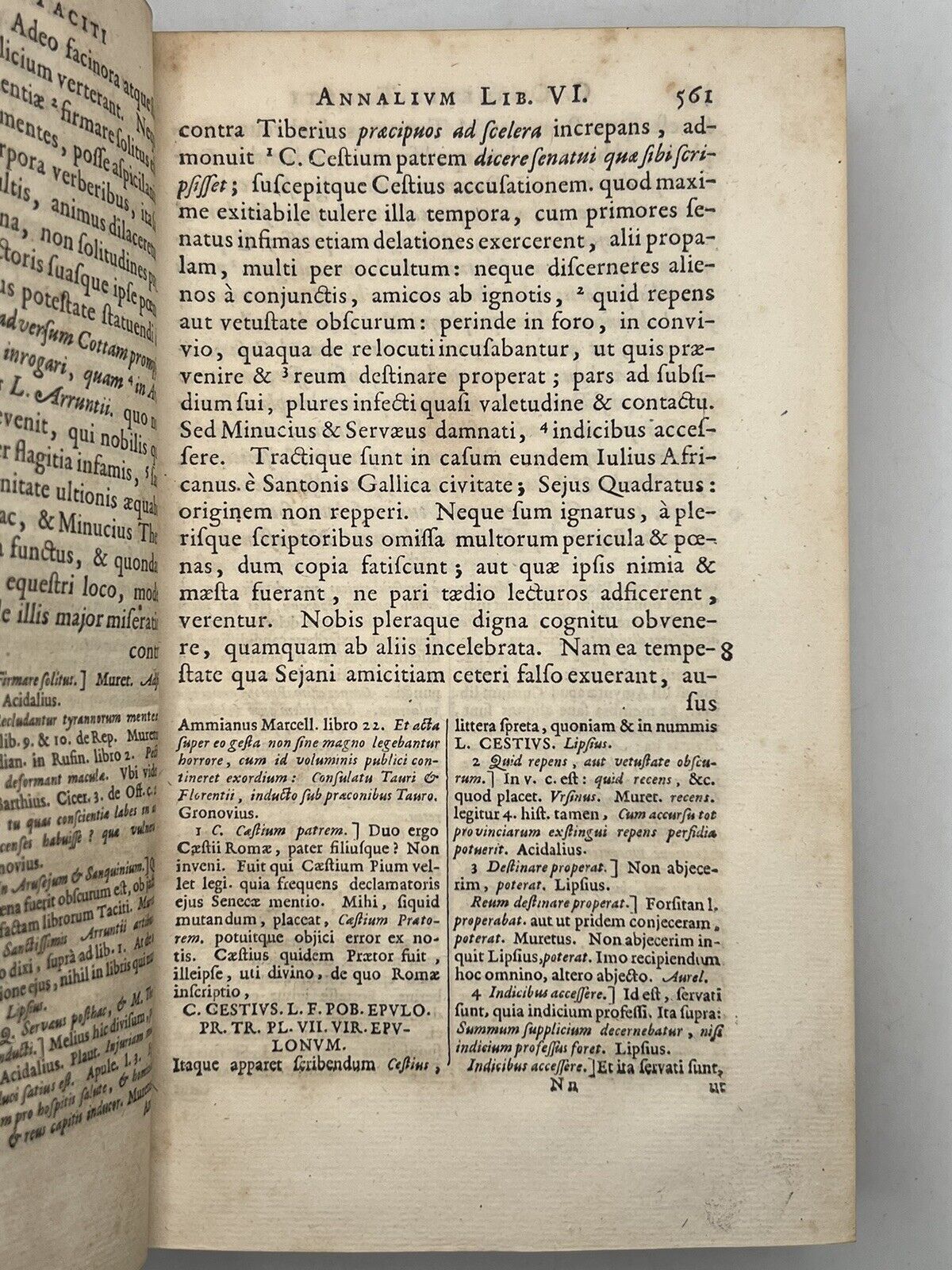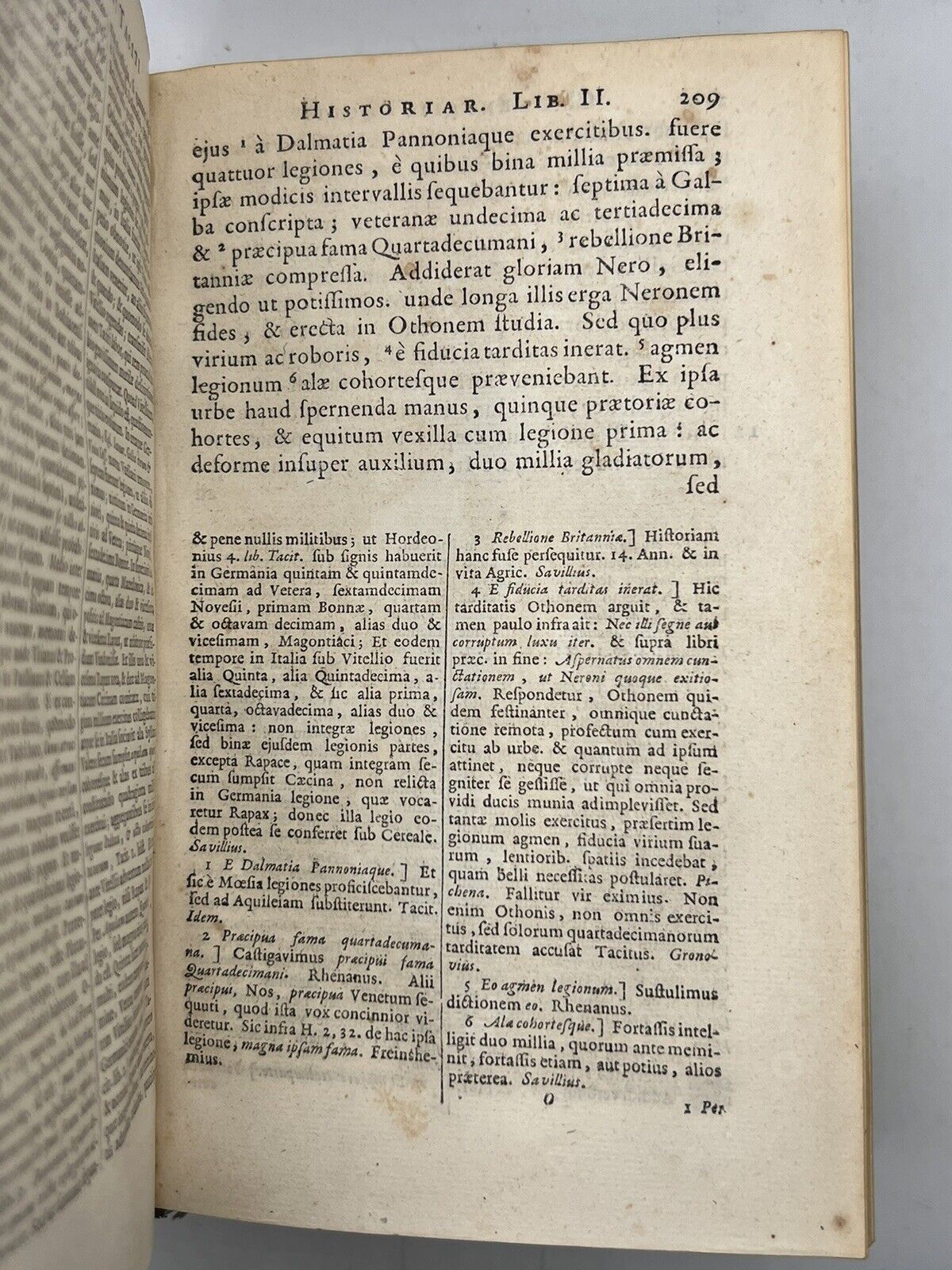 A very attractive set of Tacitus' works, a Variorum edition, with the notes of Gronovius. Complete in 2 volumes, here bound into 3, with a particularly excellent engraved title page in volume one. A lovely set.