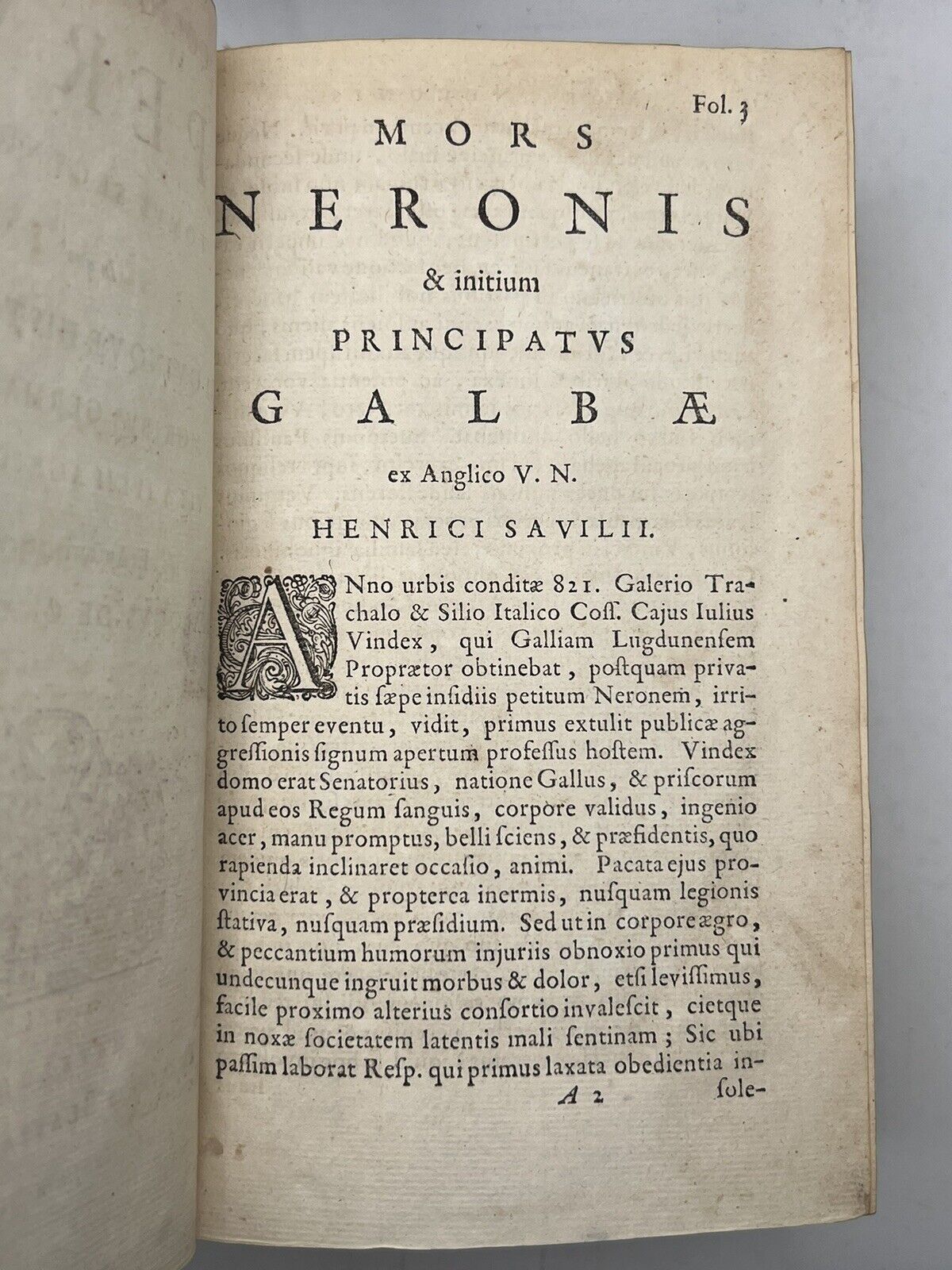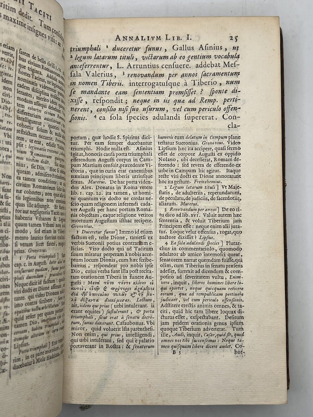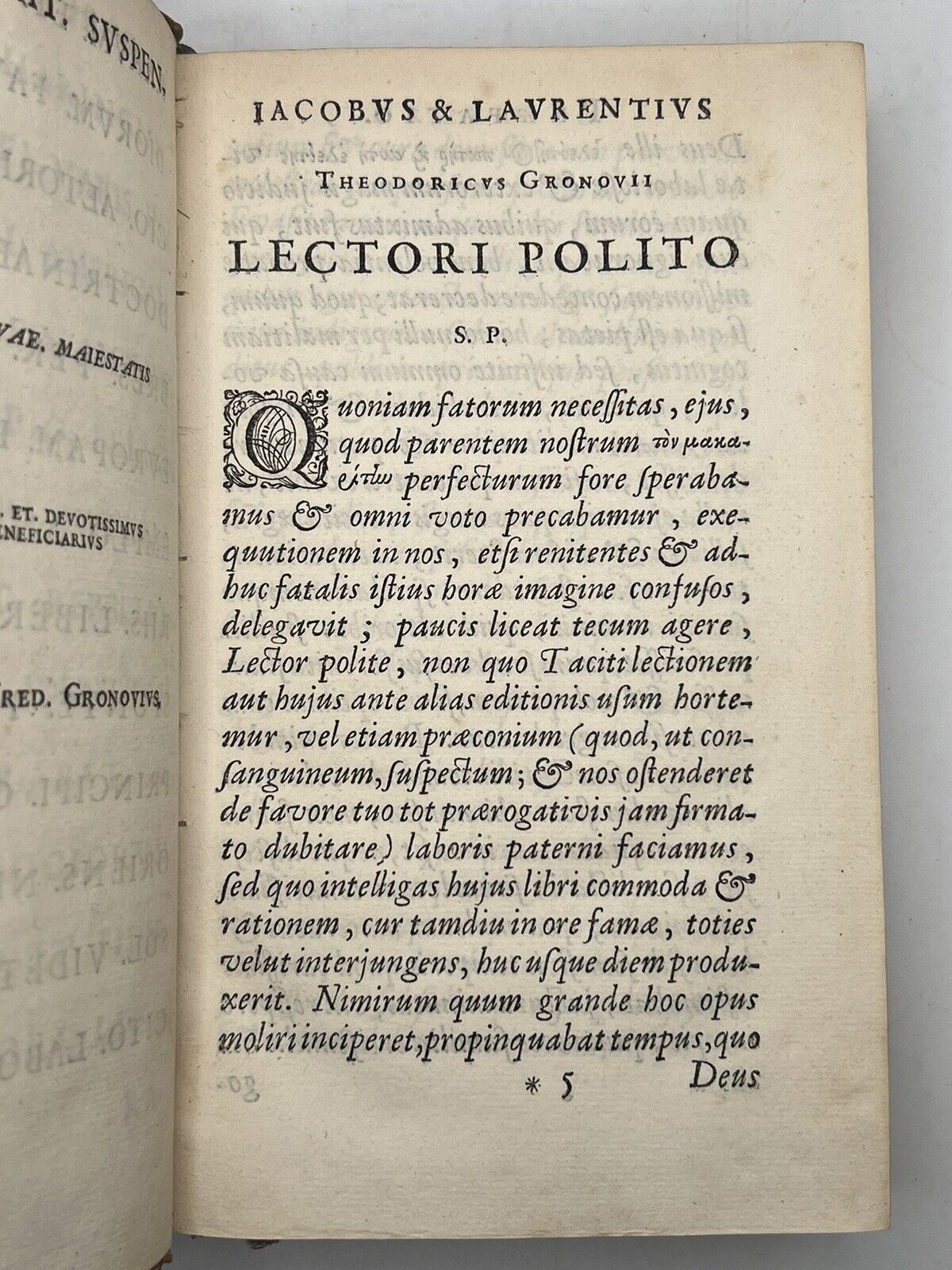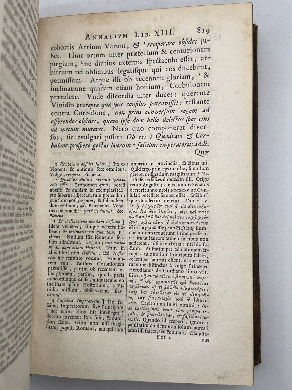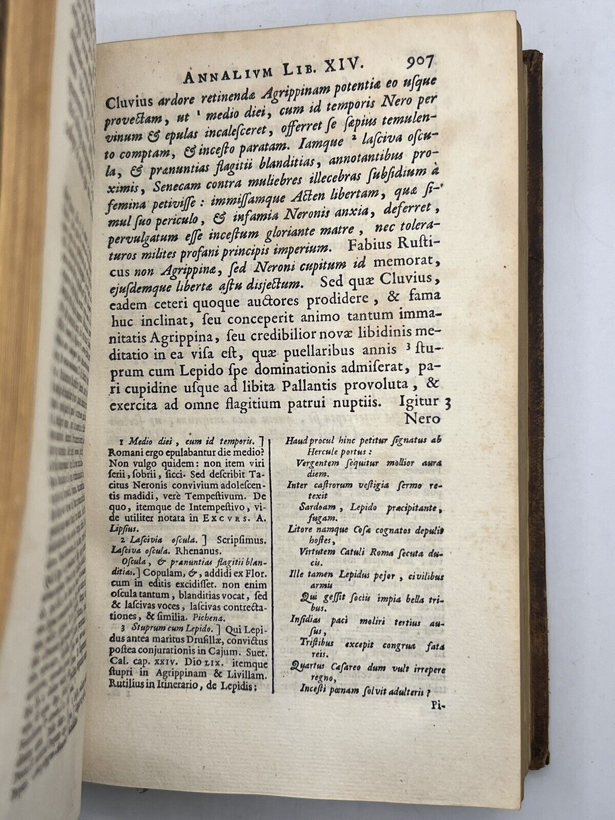 A very attractive set of Tacitus' works, a Variorum edition, with the notes of Gronovius. Complete in 2 volumes, here bound into 3, with a particularly excellent engraved title page in volume one. A lovely set.