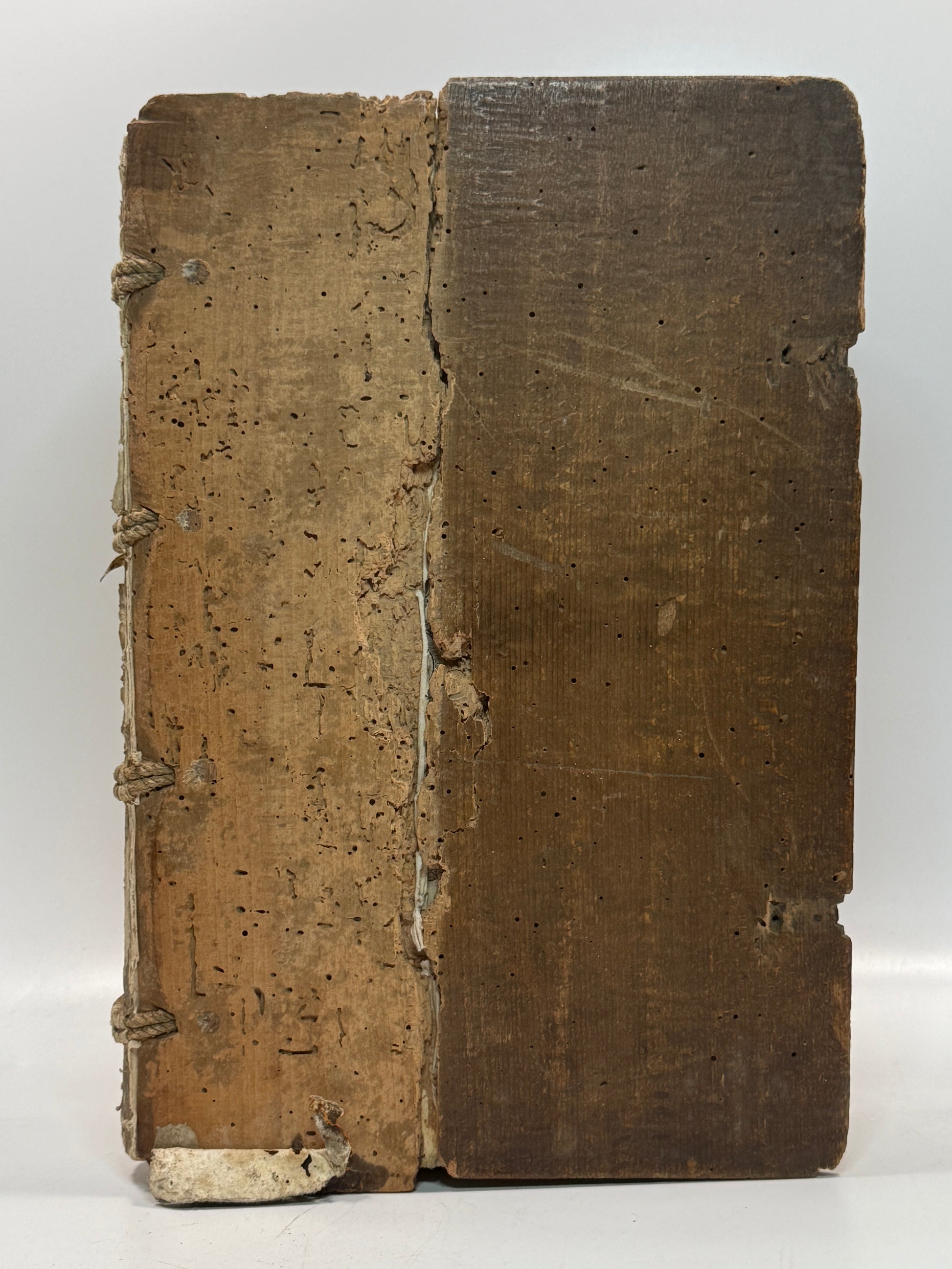 Collates as complete. Original wooden binding with medieval manuscript binder's waste visible to spine, title written in a contemporary hand to fore-edge: "Tertu". Lacks clasps. Some worming to binding, generally not affecting text, but with a few small worm tracks to final few leaves. Front board split in half but with both parts extant. Remnants of metalwork to foot of both boards and some of the vellum which would have covered the lighter part of the boards extant, with its original blindstamped design visible. Generally exceptionally clean throughout the text block. Title leaf slightly loose but securely attached. A few pencil inscriptions to front pastedown and head of title leaf recto, inscription from the Royal Library of Munich to front pastedown, unintrusive small blindstamp to foot of final leaf. Very minor dampstaining to final few leaves. A well preserved internally clean copy in its original binding.